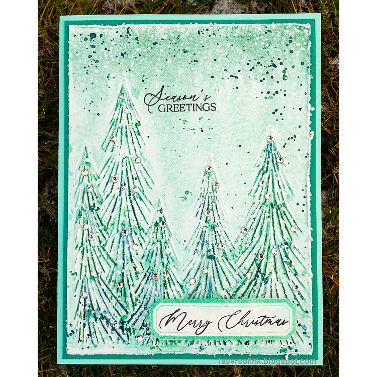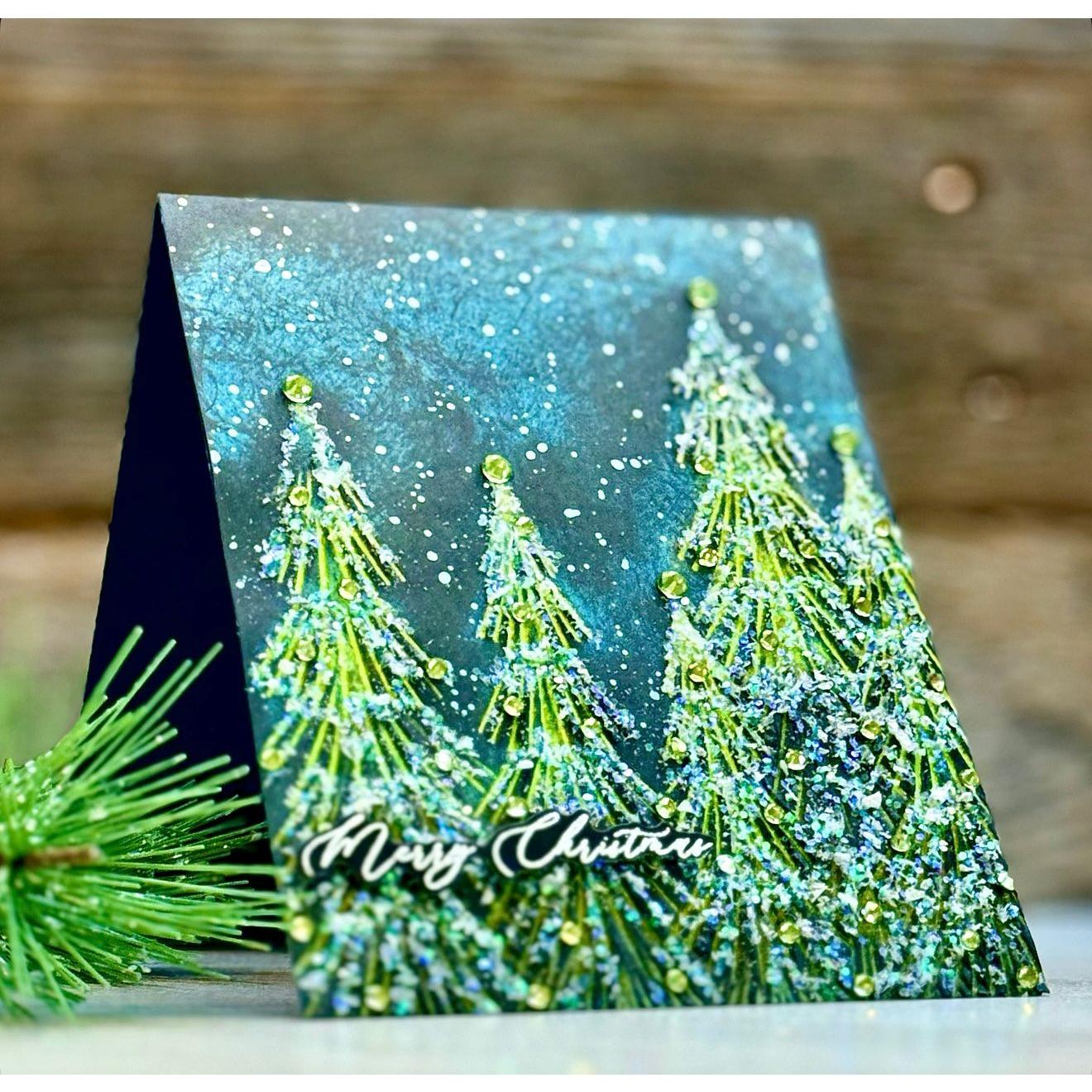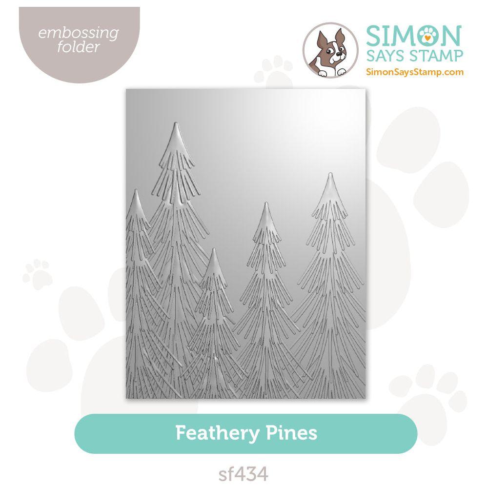 The Simon Says Stamp Feathery Pines embossing folder features a striking line of stylized evergreen trees in varying heights. This elegant design adds a natural and textured backdrop to your projects, making it perfect for crafting year-round, from nature-inspired cards to winter and holiday creations.