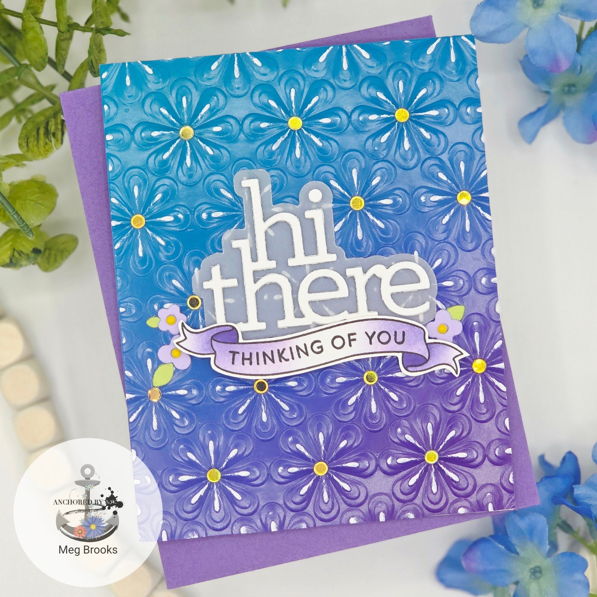 The Simon Says Stamp Groovy Floral embossing folder adds bold texture with offset rows of daisy-like flowers, each featuring concentric outlines for a fun, retro vibe.