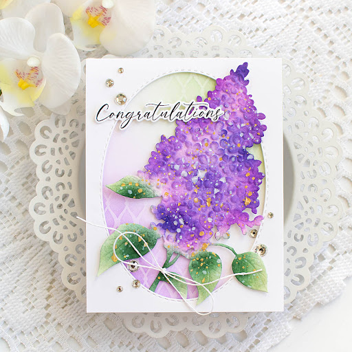 The Simon Says Stamp Pristine Lilac embossing folder creates a stunning, textured impression of a large, detailed lilac sprig.