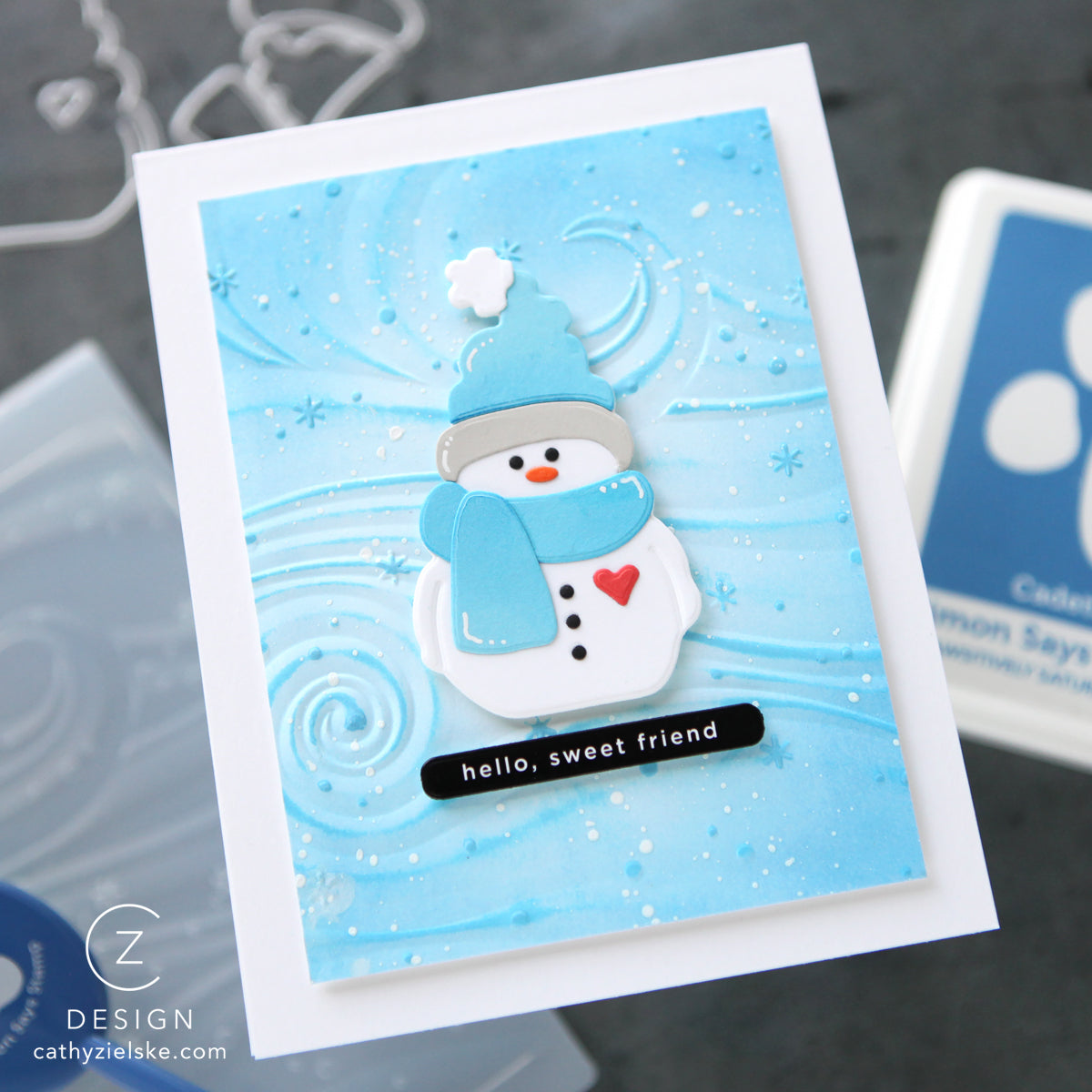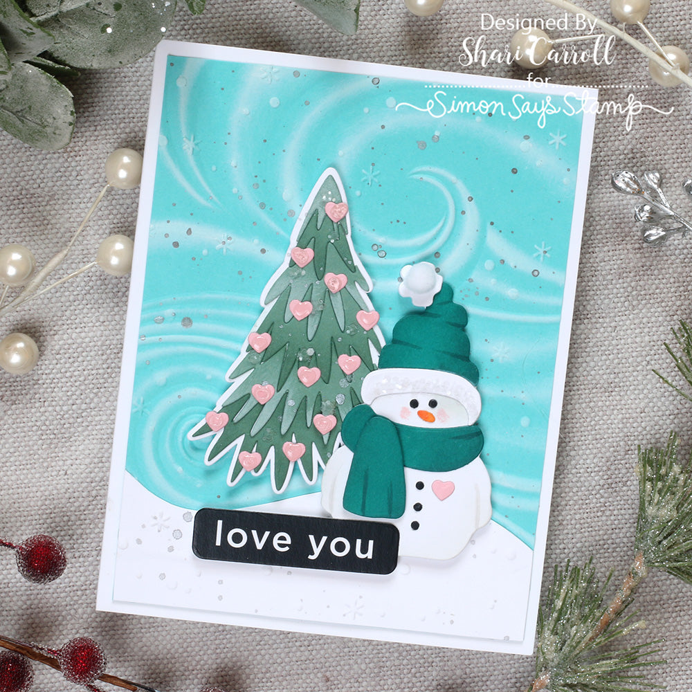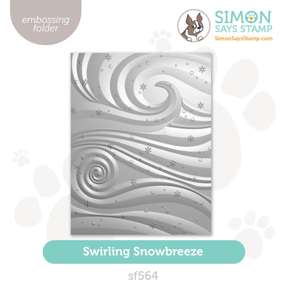 The Simon Says Stamp Swirling Snowbreeze embossing folder creates a dynamic winter background filled with flowing, wave-like swirls accented by drifting dots of snow and petite snowflakes scattered throughout.