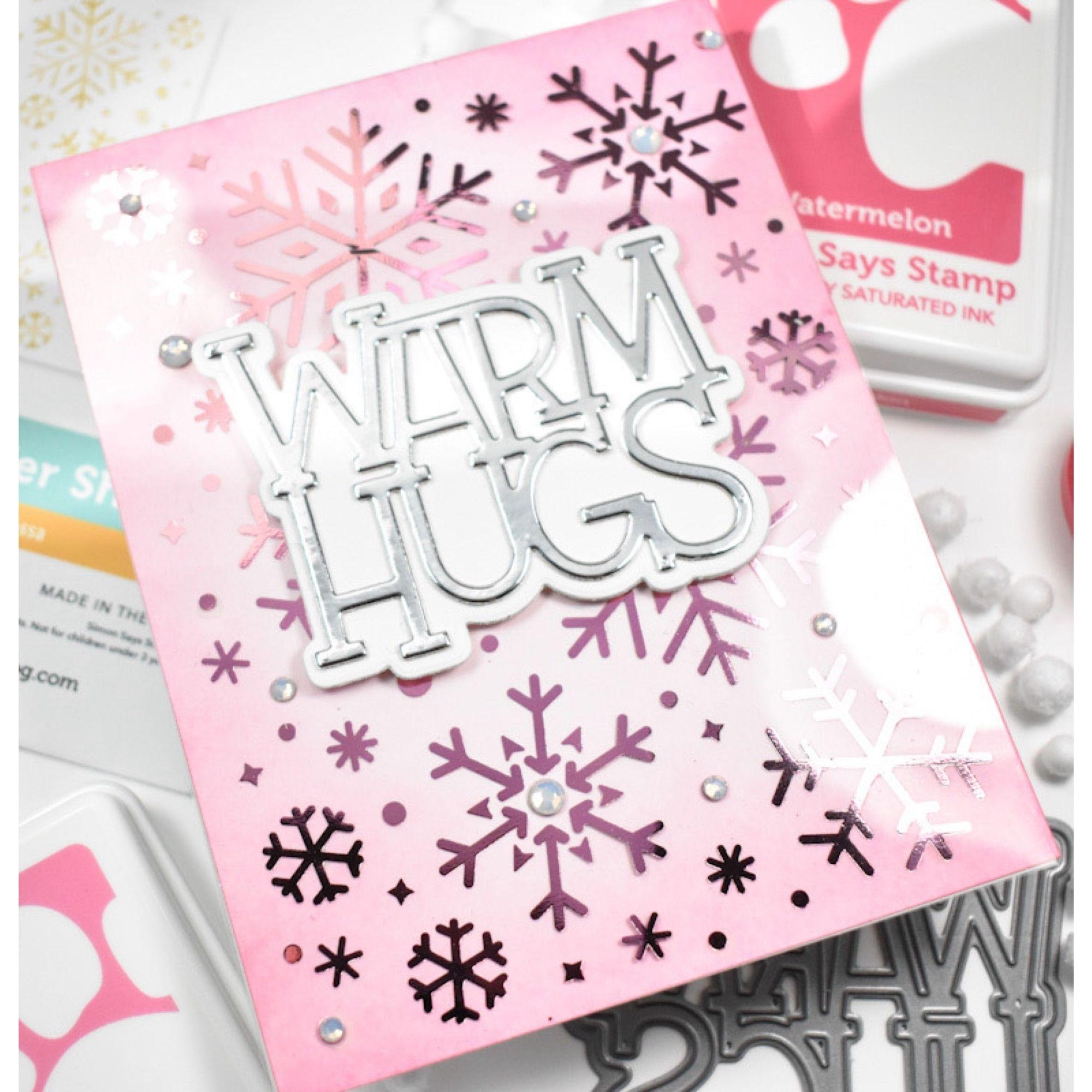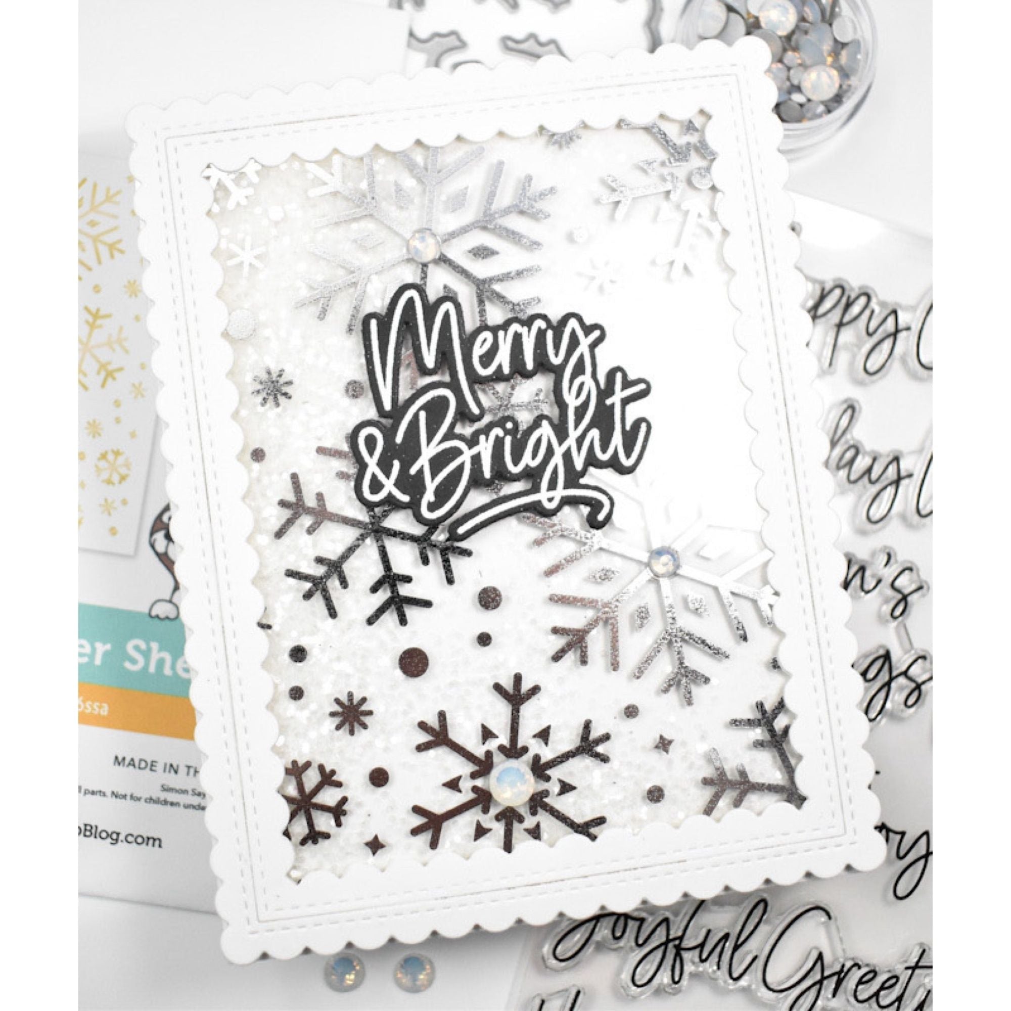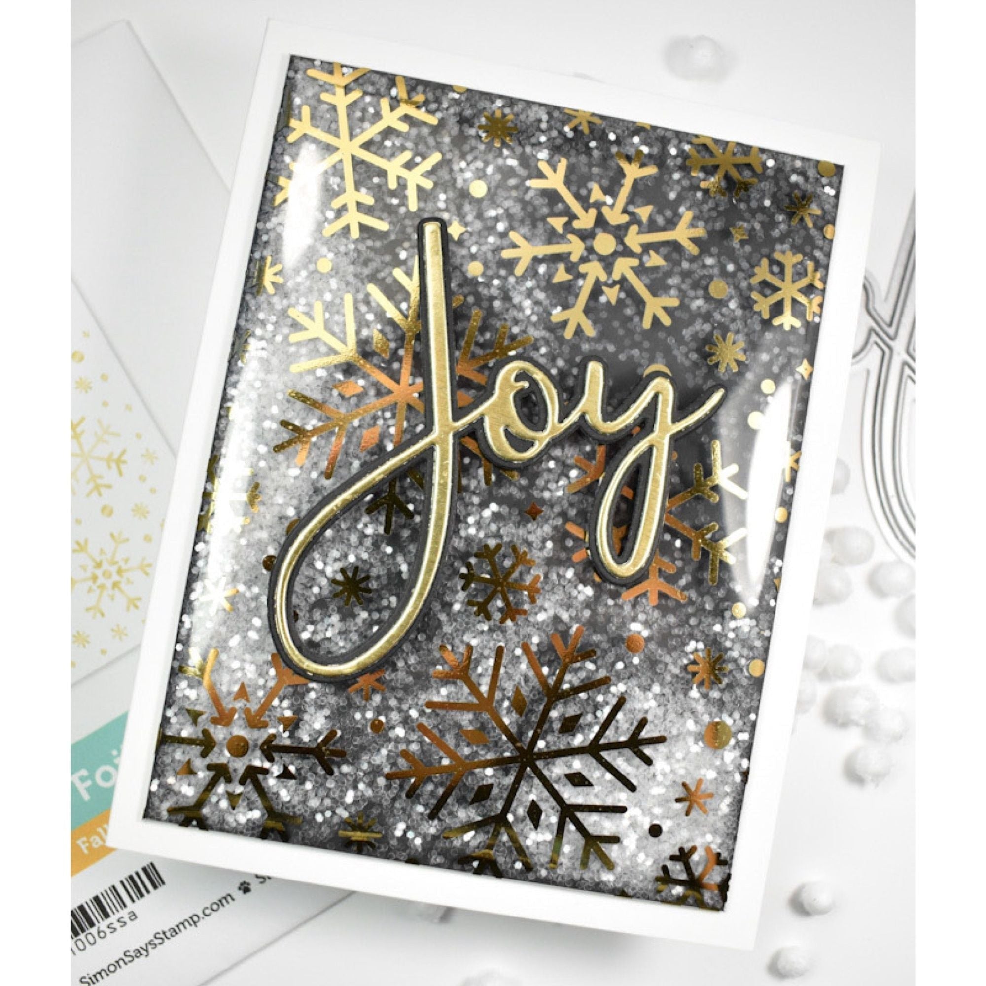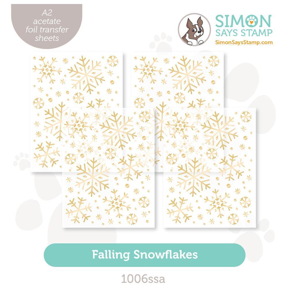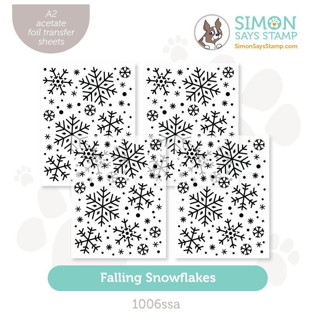 The Simon Says Stamp Falling Snowflakes Acetate Foil Transfer Sheets add a festive winter touch to your crafting projects. This set includes four acetate sheets, each printed with a delicate pattern of various-sized snowflakes in toner, ready to be foiled with your favorite foil and laminator or foiling machine.