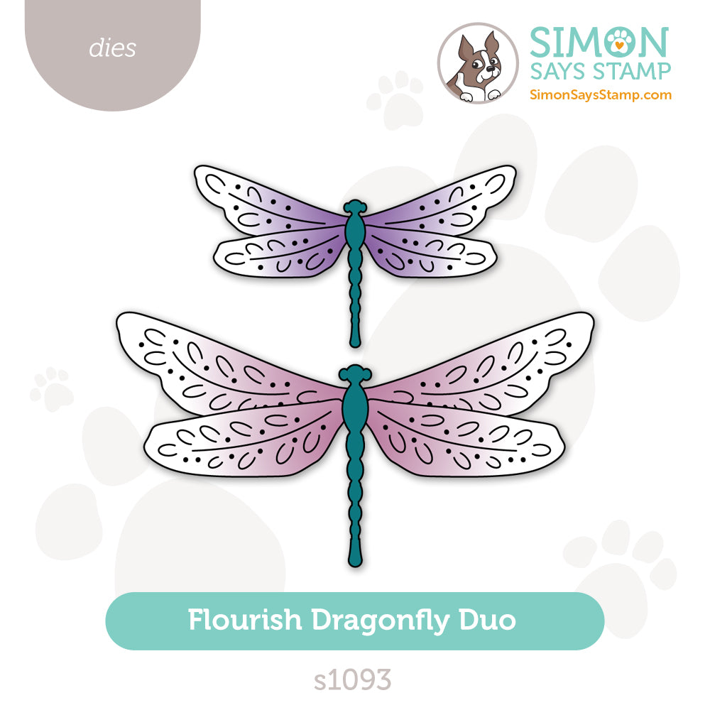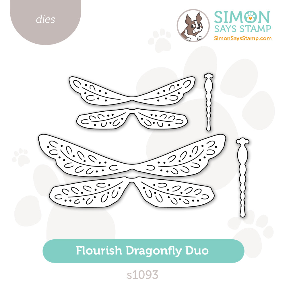 The Simon Says Stamp Flourish Dragonfly Duo dies cut two sizes of beautifully detailed dragonflies with embellished wings and scalloped bodies. The decorative wing patterns add texture and elegance, while the layered design allows you to mix colors and finishes for extra dimension.