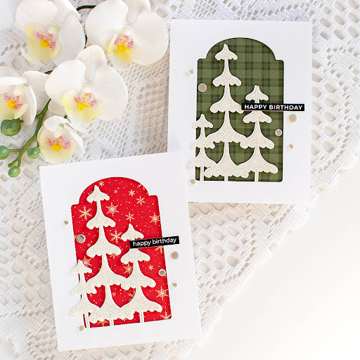 Create elegant winter landscapes with the Simon Says Stamp Frosty Tree Gathering die. This single die cuts a cluster of three tall, stylized trees, each composed of tiered sections that grow larger from top to bottom and vary in height for visual balance.