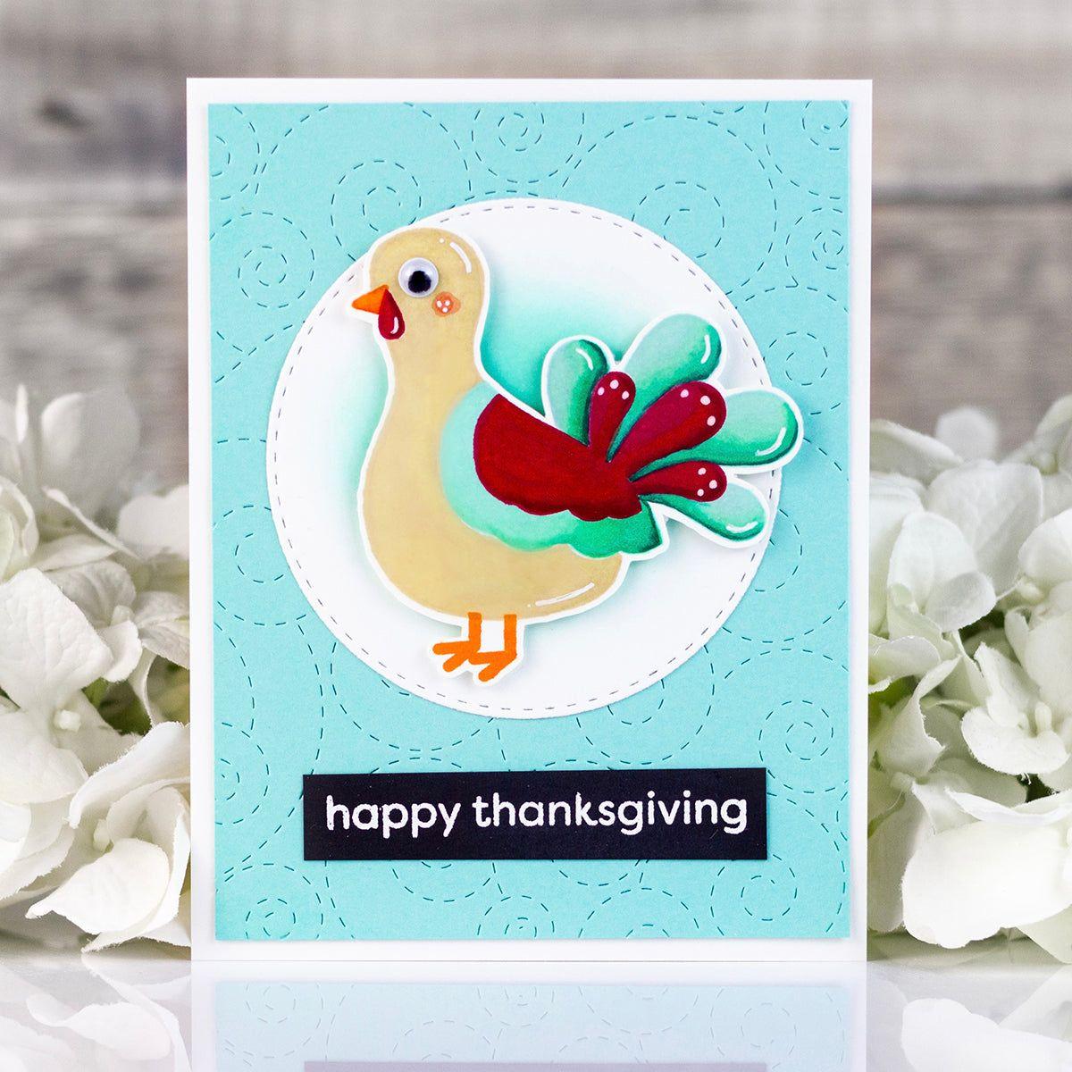 Add dimension to your Thanksgiving projects with the Simon Says Stamp Give Thanks and Eat Pie dies! These dies are designed to cut out the completed pie, turkey, and pilgrim hat from the coordinating stamp set, as well as the three largest sentiments.