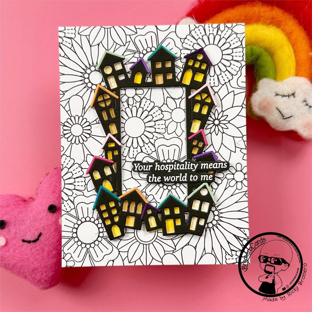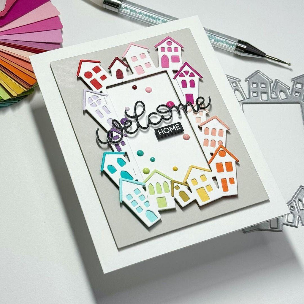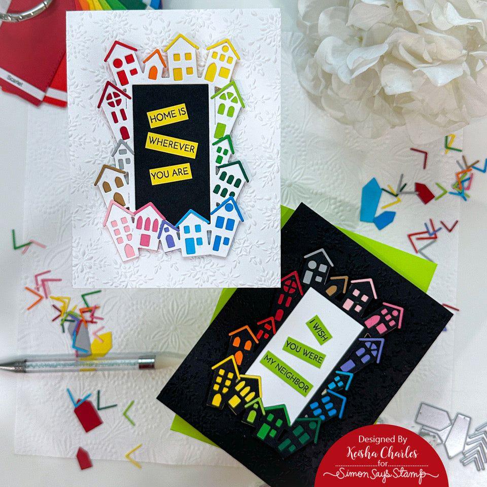 Add charming architectural elements to your projects with the Simon Says Stamp House Border Frame dies. This versatile die set is expertly crafted to cut out a delightful frame featuring a row of houses surrounding a rectangular opening, along with additional house and roof pieces for creative layering.