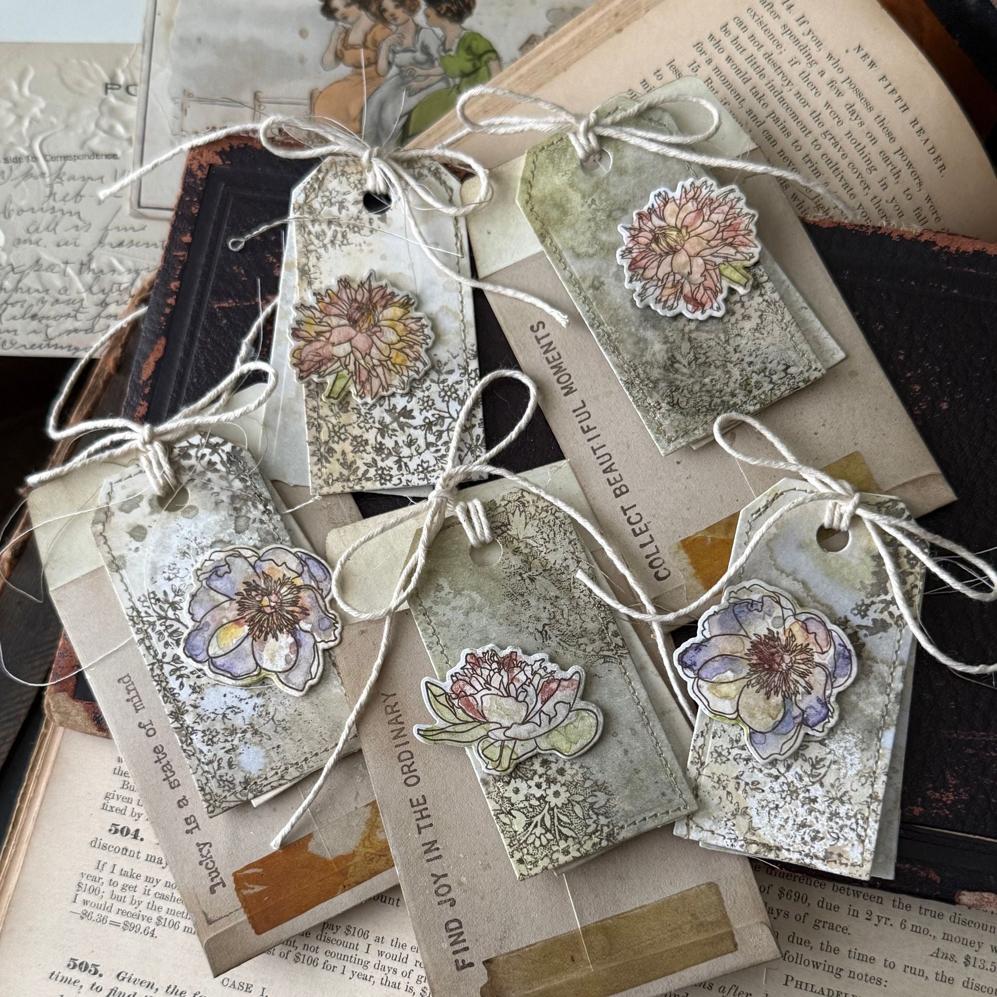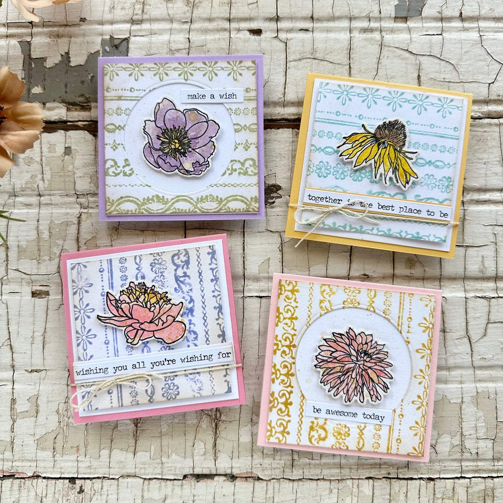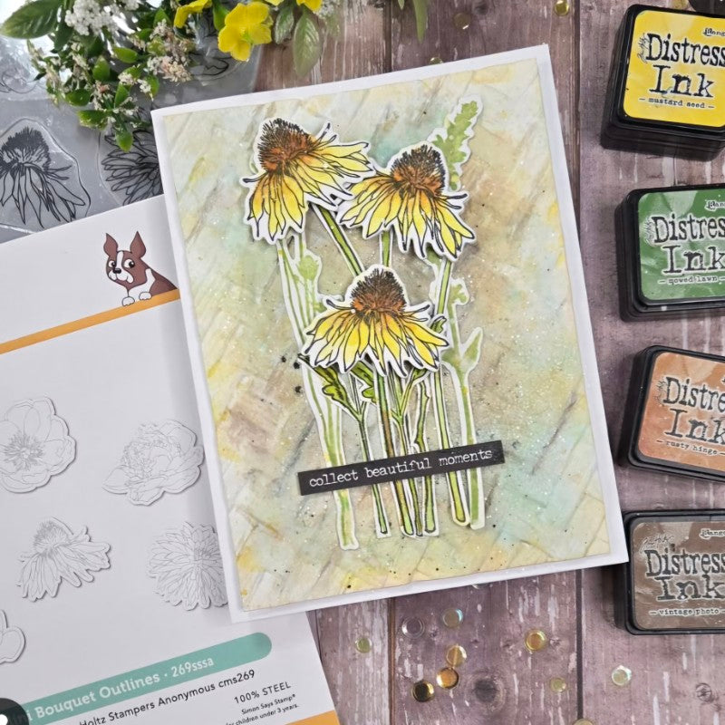 This die set includes the dies to cut out 6 flower outlines. The largest die measures approximately 1.5 inches tall by 1.5 inches wide. The smallest die measures approximately 1.125 inches tall by 1.0625 inches wide. Works beautifully with the Tim Holtz CMS269 Mini Bouquet stamp set.