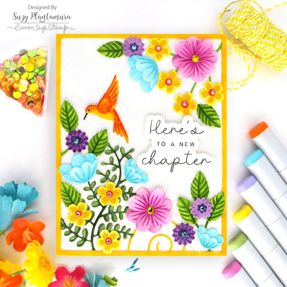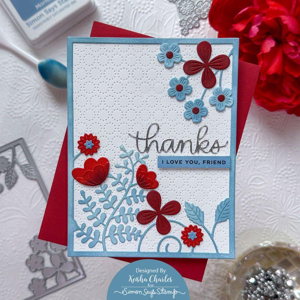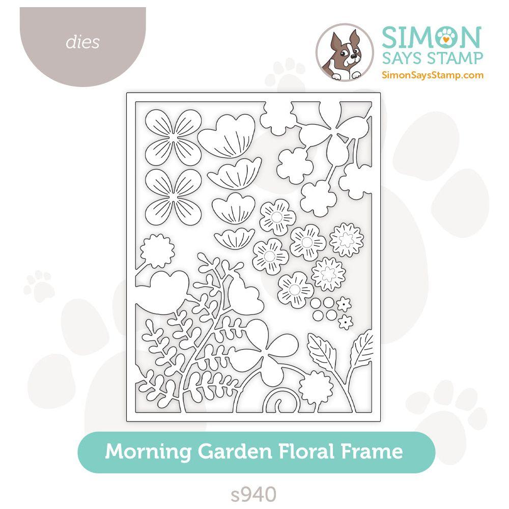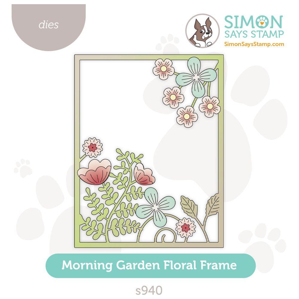 Enhance your card designs with the Simon Says Stamp Morning Garden Floral Frame die. This elegant die cuts out an A2 card frame adorned with blossoms and greenery emanating from the top right and bottom left corners, creating a beautiful and intricate border.