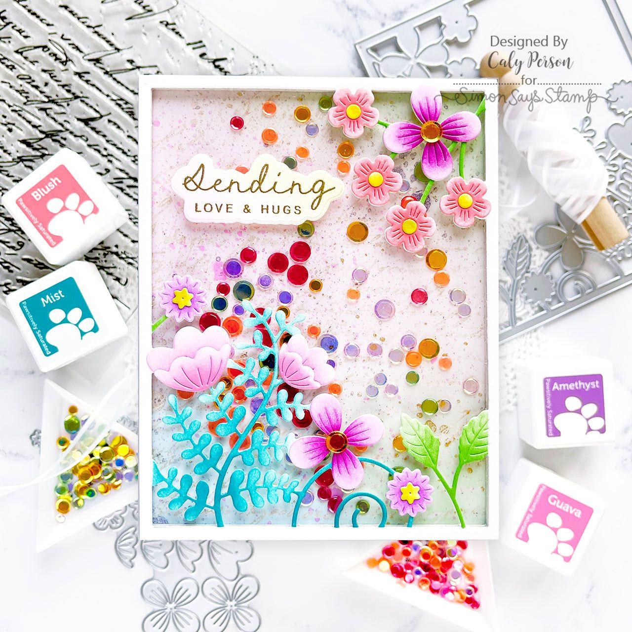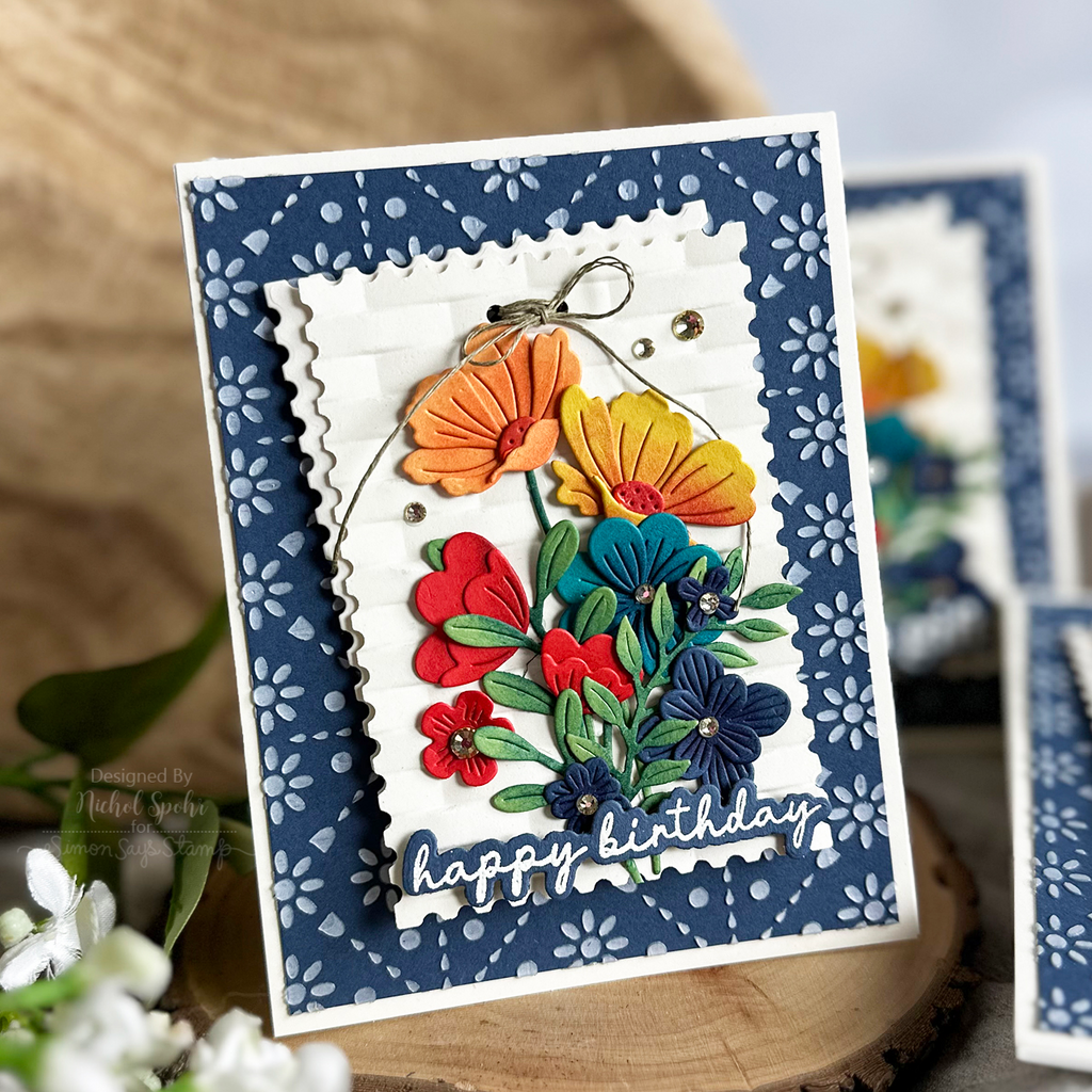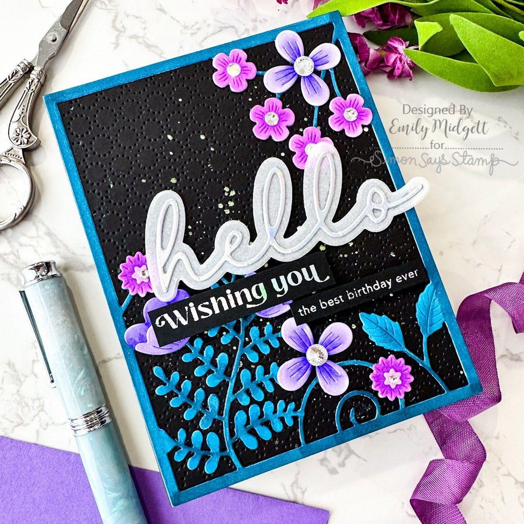 Enhance your card designs with the Simon Says Stamp Morning Garden Floral Frame die. This elegant die cuts out an A2 card frame adorned with blossoms and greenery emanating from the top right and bottom left corners, creating a beautiful and intricate border.