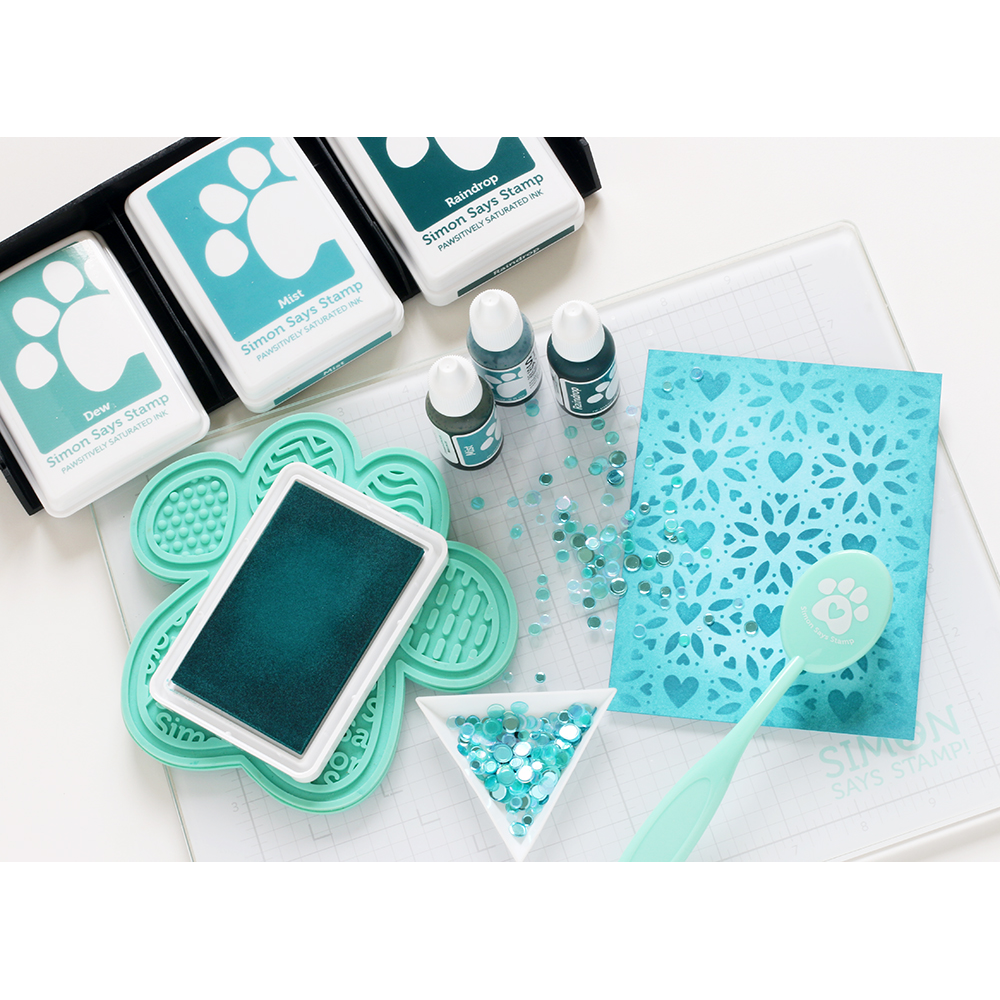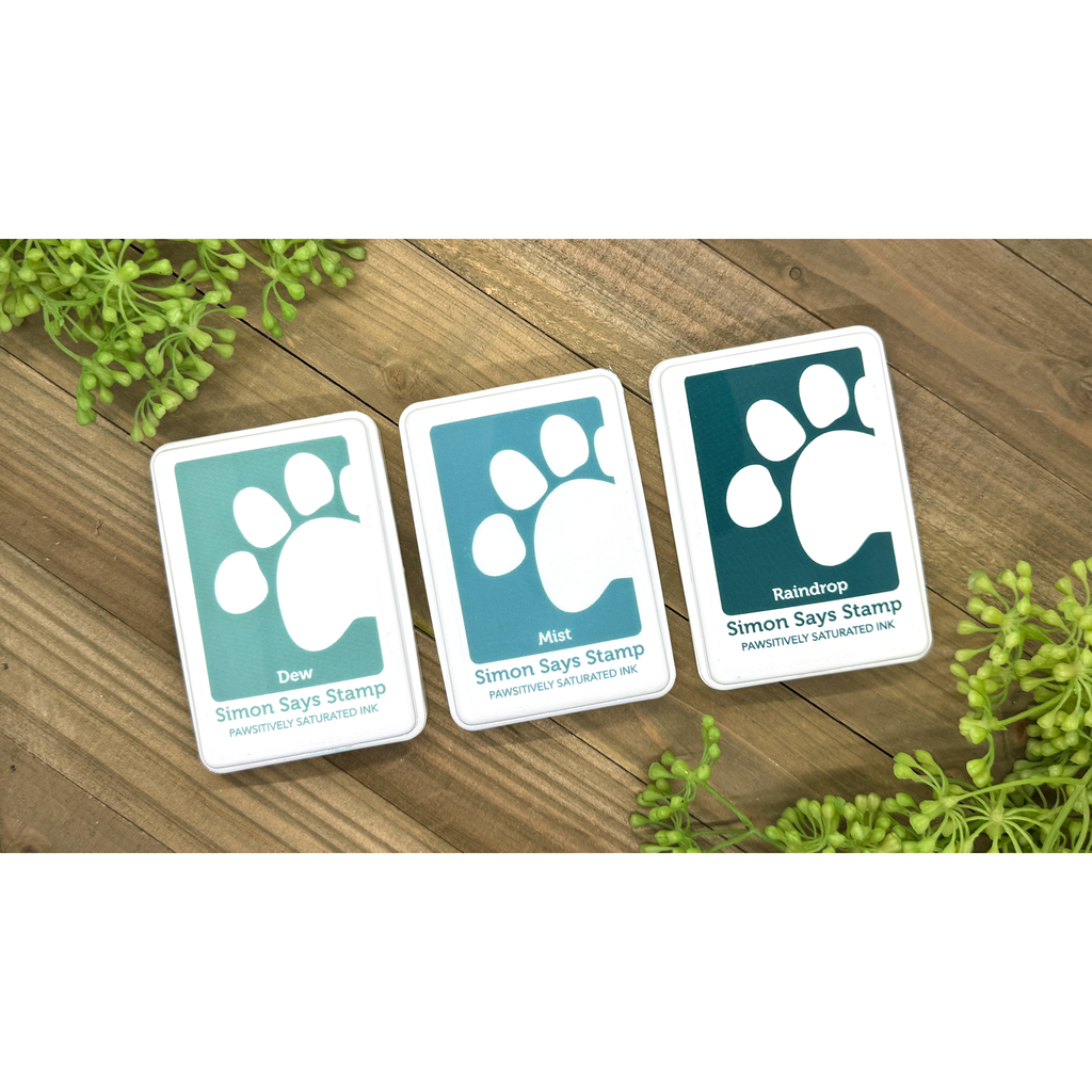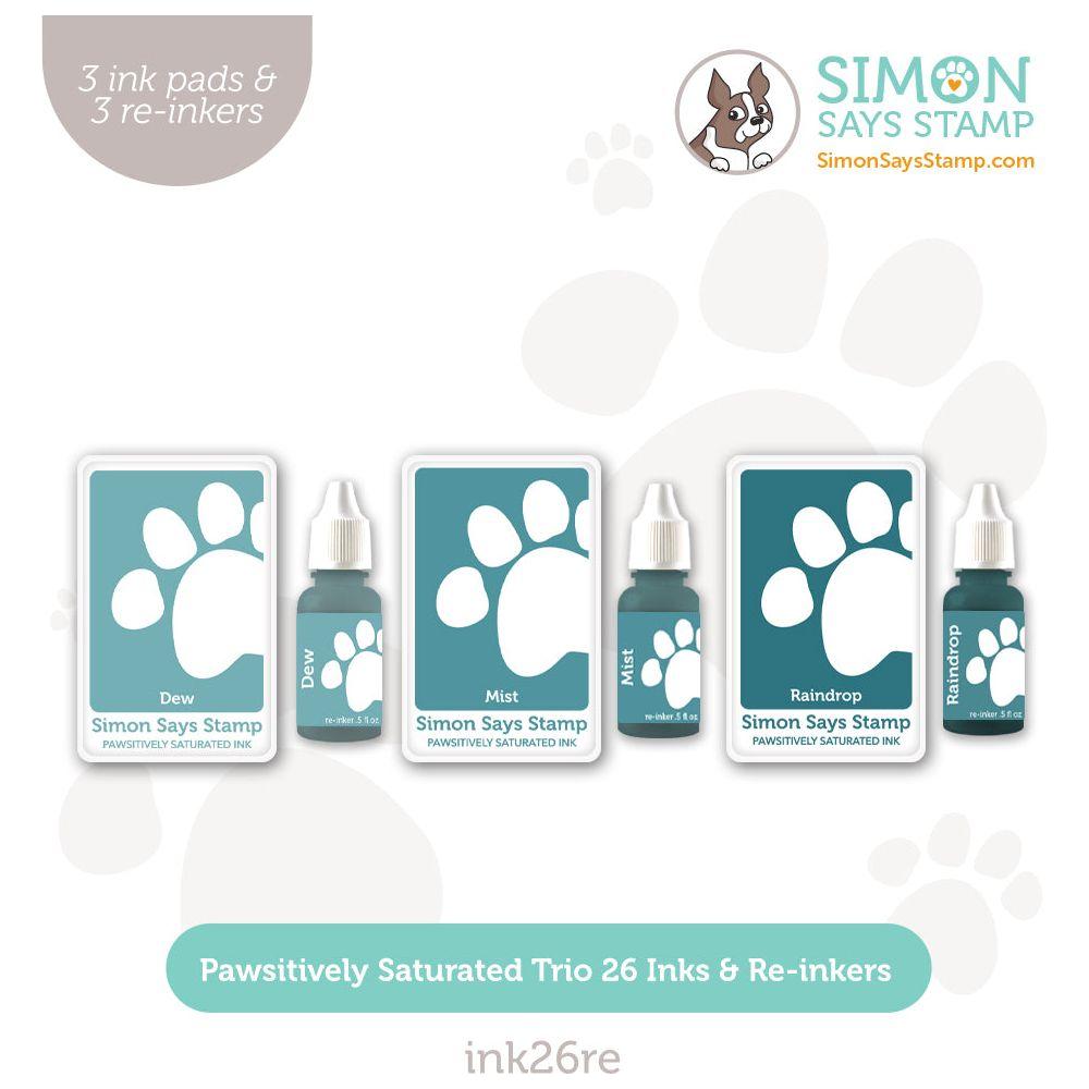 Introducing the Simon Says Stamp Pawsitively Saturated Ink Pad and Re-inkers Trio 26! This set includes three full-sized saturated dye ink pads in greenish-blue tones and their corresponding re-inkers. The colors in Trio 26 are: