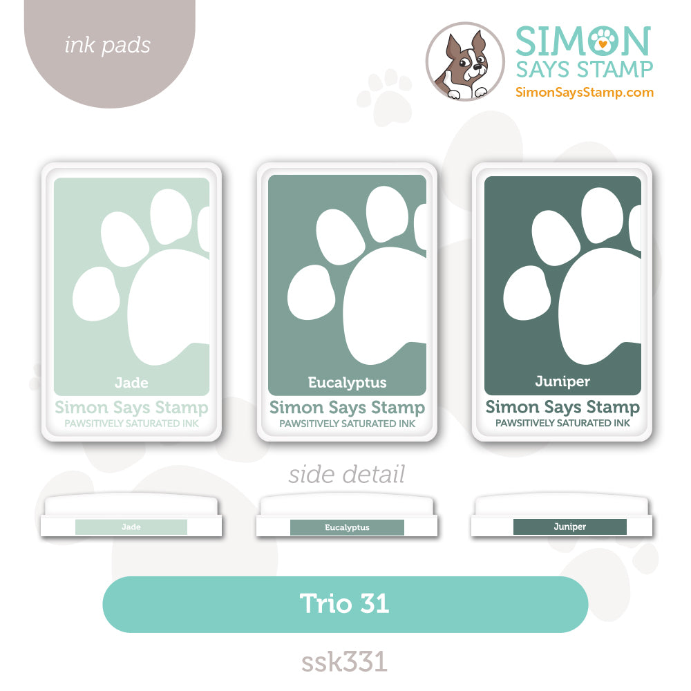 Introducing the Simon Says Stamp Pawsitively Saturated Ink Pad Trio 31! This set includes three full-sized saturated dye ink pads in misty green tones. The colors in Trio 31 are: