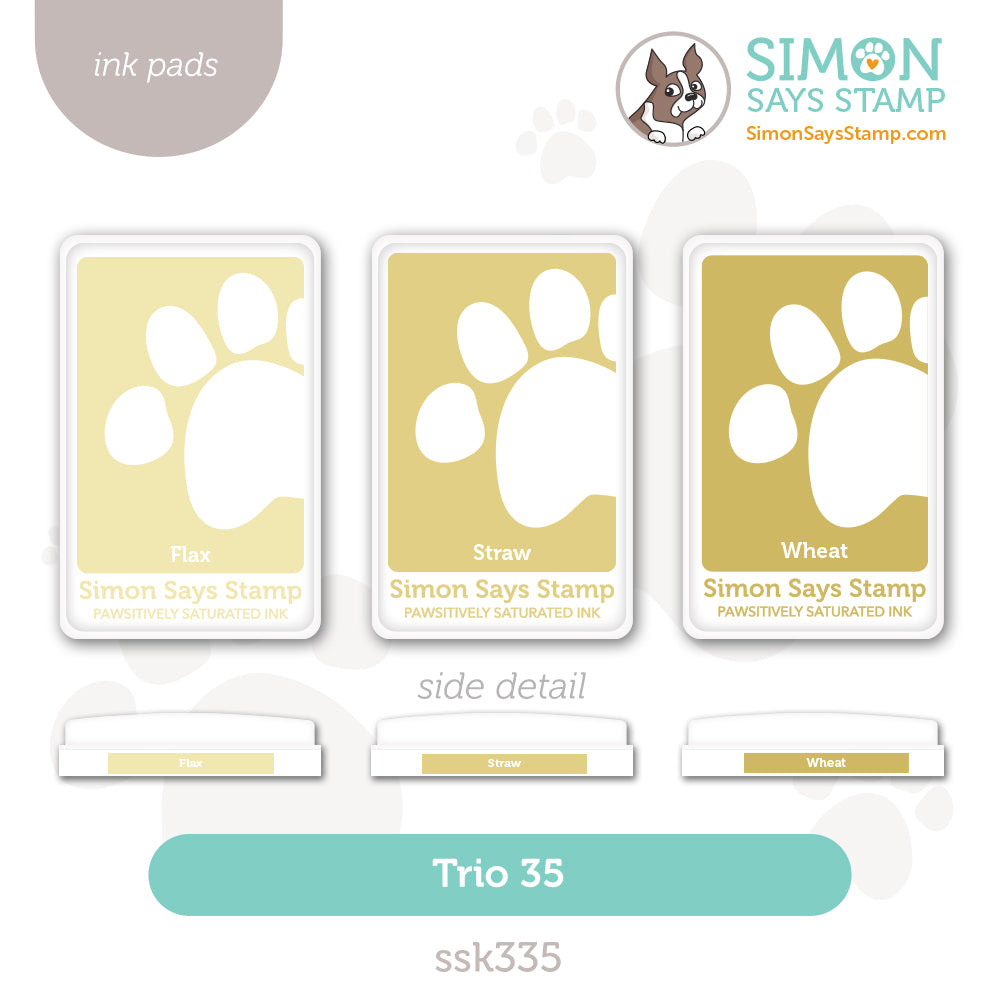 Introducing the Simon Says Stamp Pawsitively Saturated Ink Pad Trio 35! This set includes three full-sized saturated dye ink pads in tan tones. The colors in Trio 35 are: