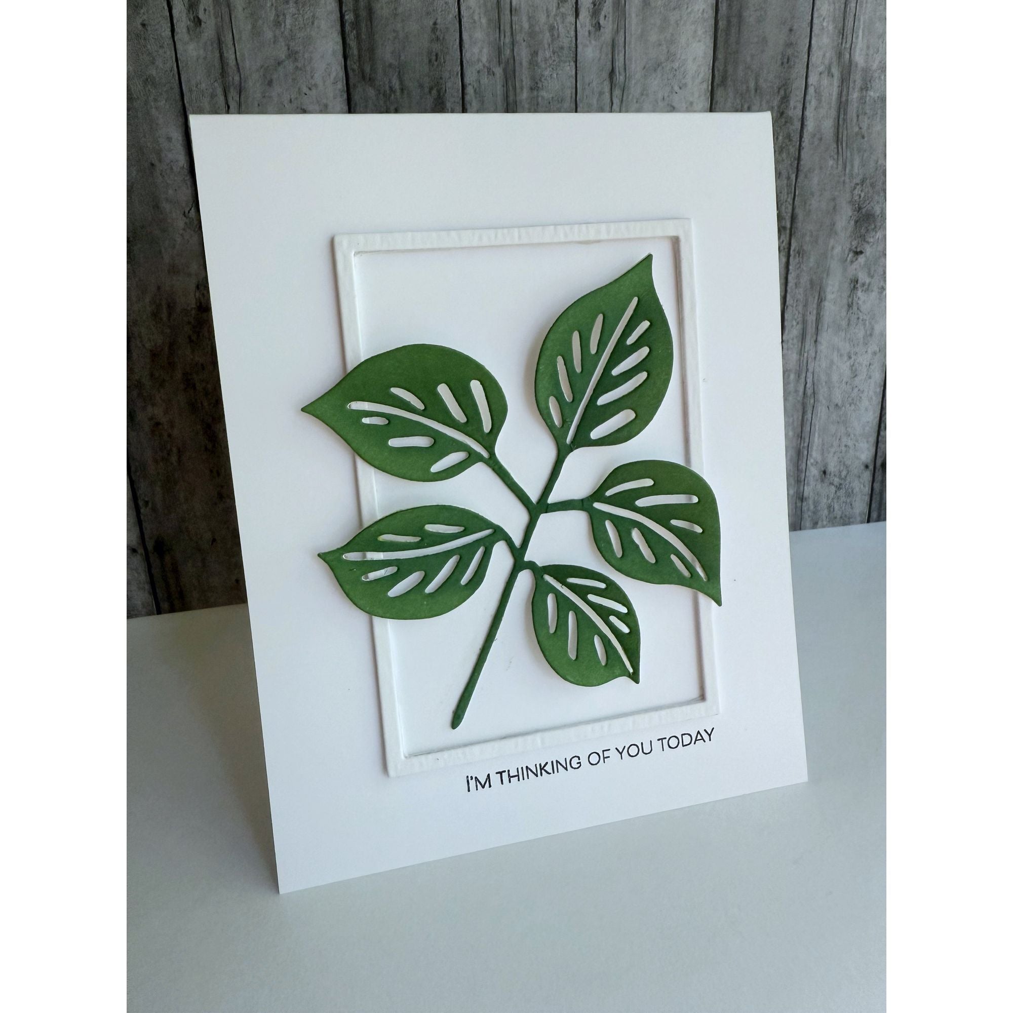 Add timeless botanical detail to your projects with the Simon Says Stamp Rose Branch die. This elegant die cuts a leafy stem featuring five gracefully arranged leaves, each with open areas that reveal the midribs and veins for a light, intricate effect.