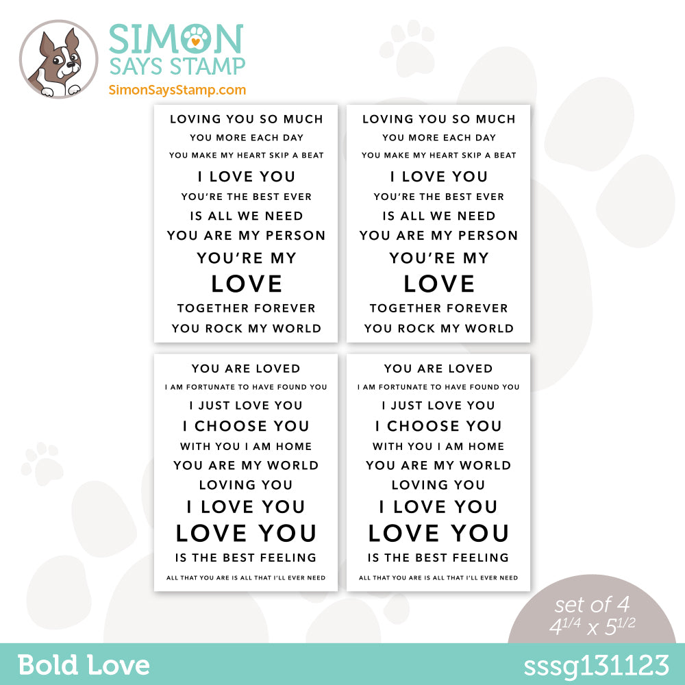 Each of the 4 cards in this set is 4.25 x 5.5 inches and contains various love-themed sentiments. This product is available exclusively at Simon Says Stamp. They are ideal for trimming and putting onto your cards as main sentiments or sub sentiments. And since they are printed with toner, these are foilable! Stock up your stash with these handy greetings! Printed in the USA on Neenah Classic Crest 110 lb Smooth Solar White paper.