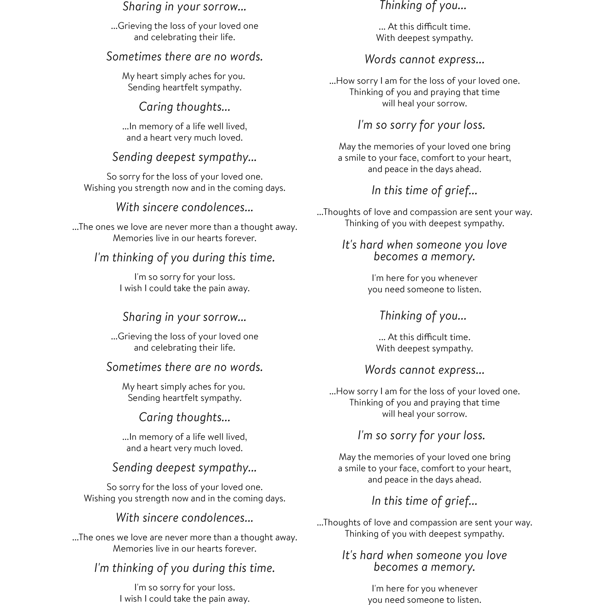 This pack of 4 cards are each 4.25 x 5.5 inches. You will receive 2 each of 2 different cards with varying text size and all with a sympathy theme.