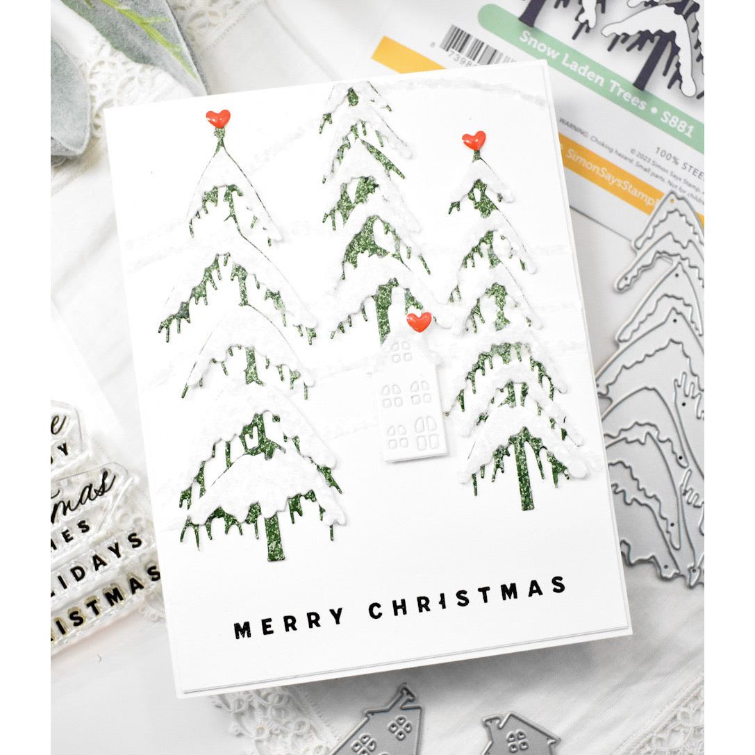 The Simon Says Stamp Snow Laden Trees die is perfect for adding a touch of winter charm to your creations. This versatile die set allows you to cut three sizes of evergreen trees, complete with snowy sections to add to each branch, creating the enchanting illusion of freshly fallen snow.