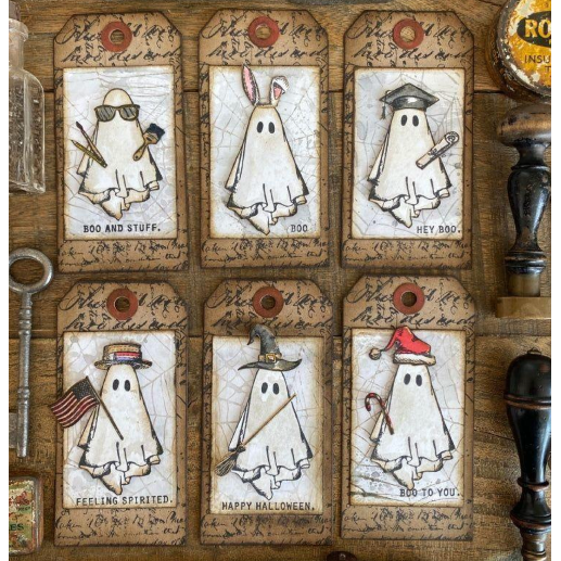This die set includes the dies to cut out 6 ghosts. The largest ghost measures approximately 2.625 inches tall by 2.5 inches wide.  The smallest ghost measures approximately 2.125 inches tall by 1.375 inches wide. Works beautifully with the Tim Holtz CMS492 Spooky Spirits stamp set.