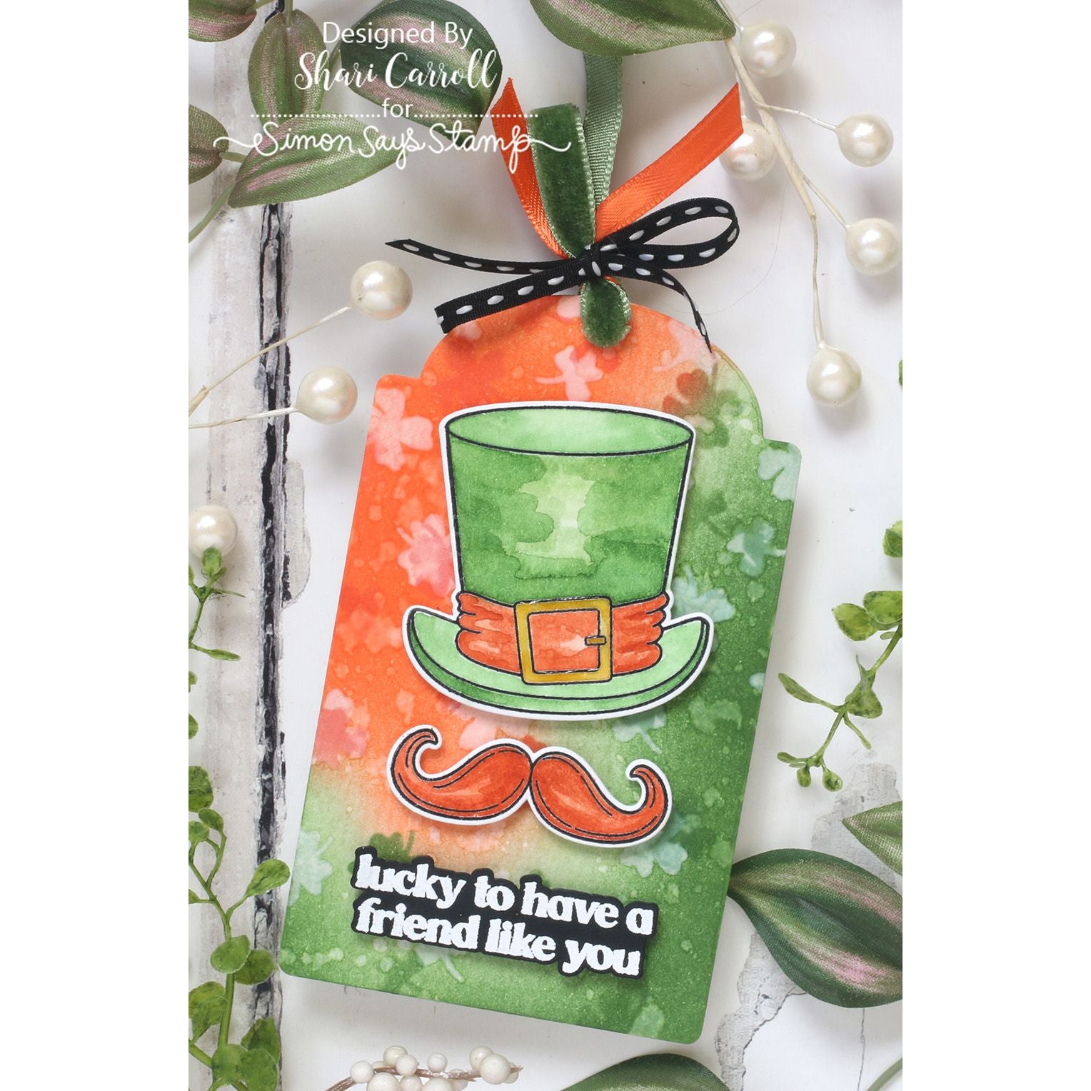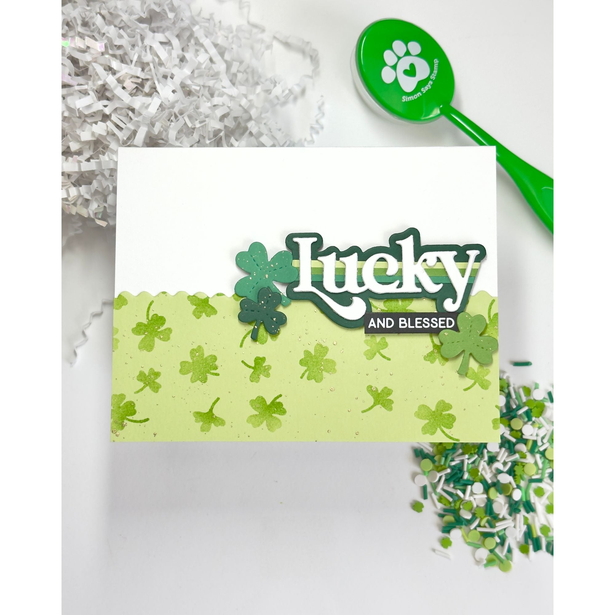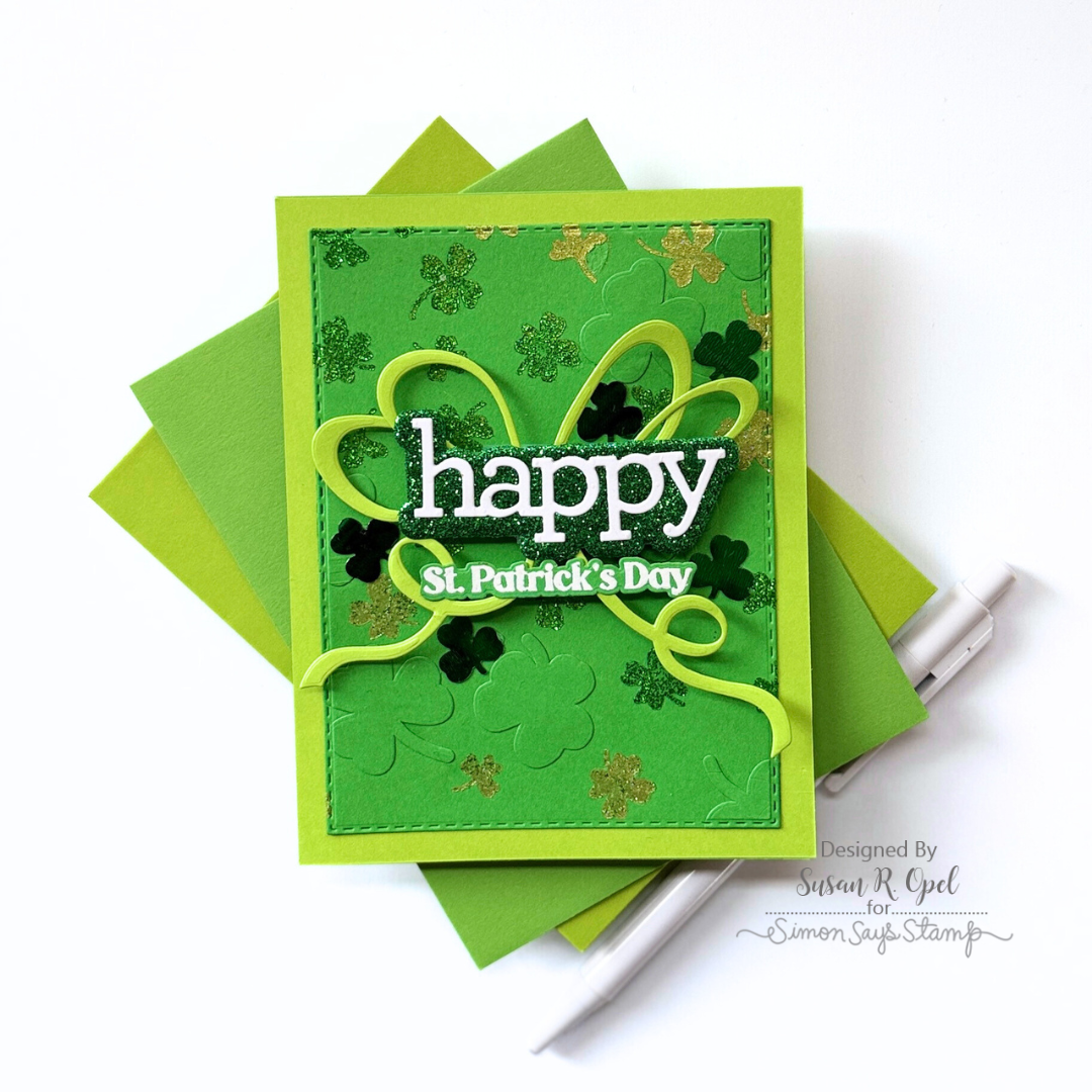 The Simon Says Stamp Falling Shamrocks stencil creates a lively background of clovers that appear to drift gently down from the sky. The design is more concentrated at the top and gradually disperses as the shamrocks flutter downward, adding natural movement and visual interest.