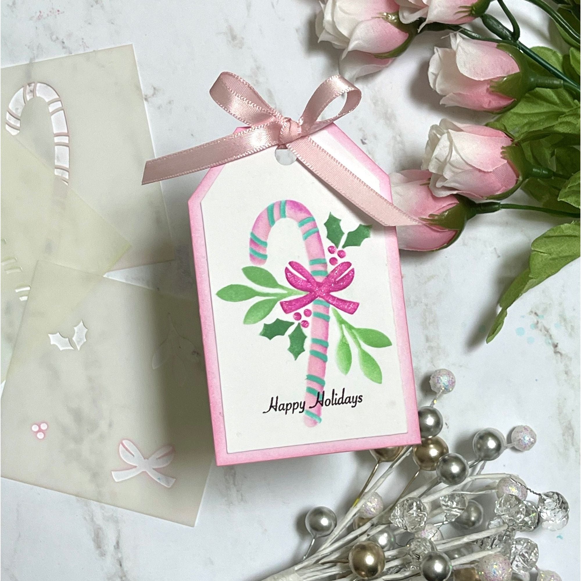 Elevate your holiday crafting with the Simon Says Stamp Festive Candy Cane stencils, a layering stencil set that adds delightful details to your projects. This versatile set includes three layers: two layers for creating candy cane colors with ease, as well as a third layer featuring charming leaves, berries, and a bow.