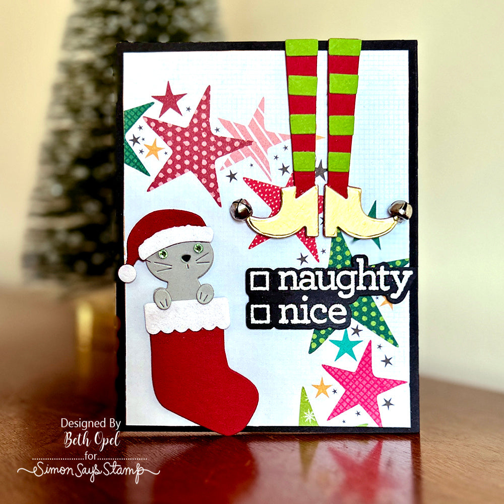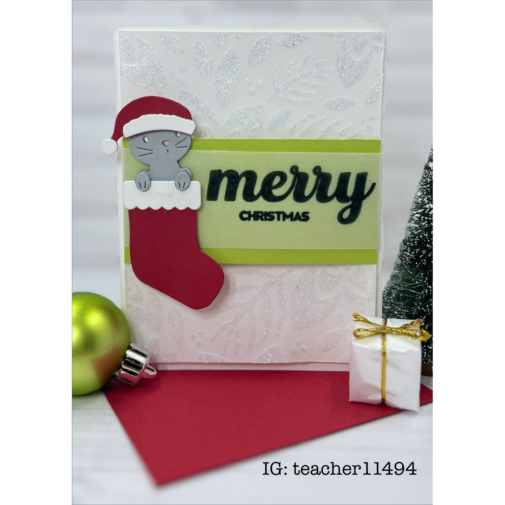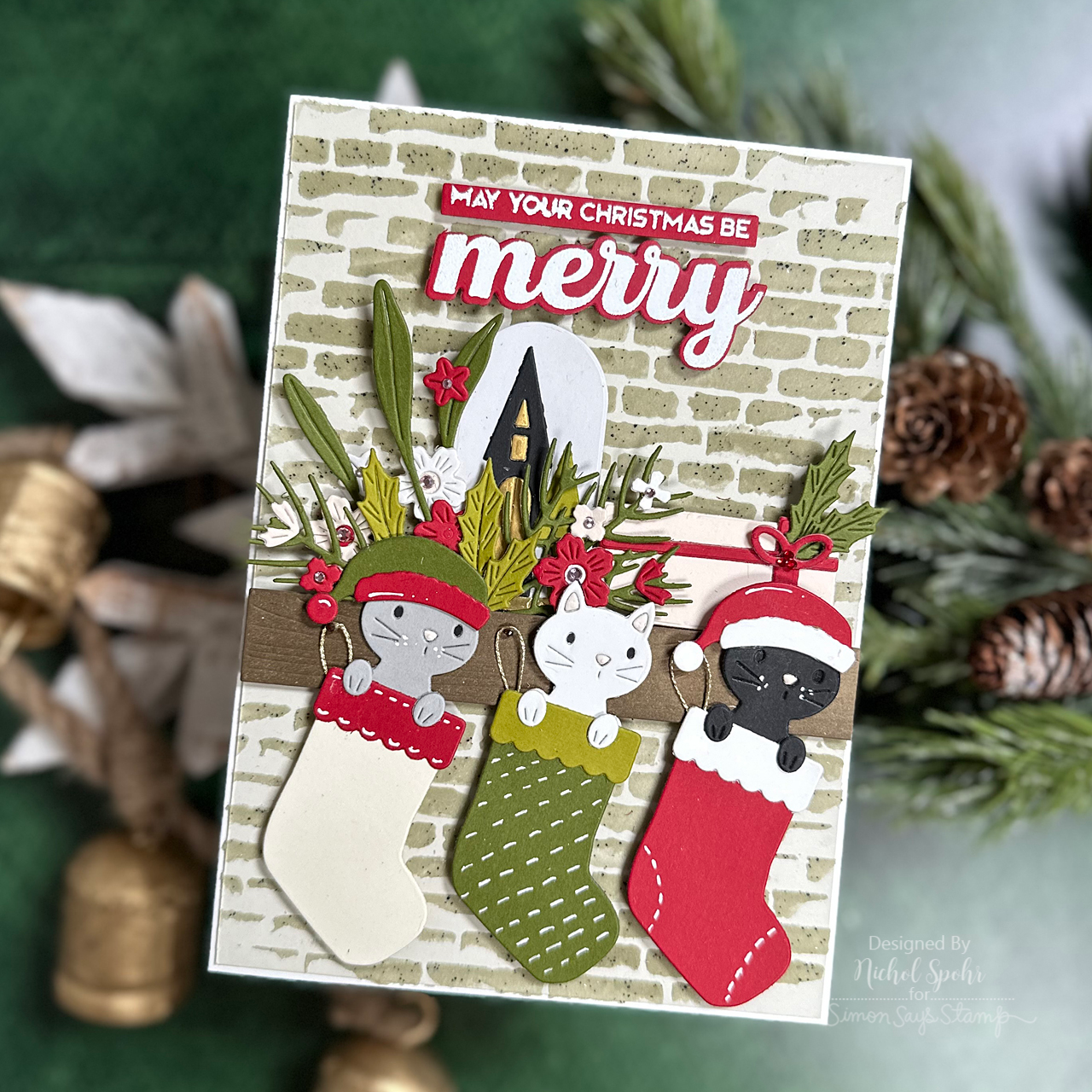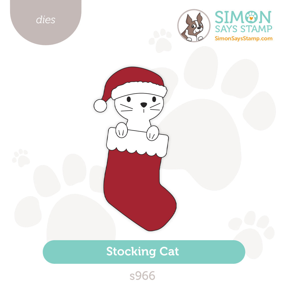 The Simon Says Stamp Stocking Cat dies are an adorable addition to your holiday crafting. This set works together to create a cute kitty wearing a Santa hat, peeking out of a festive stocking.