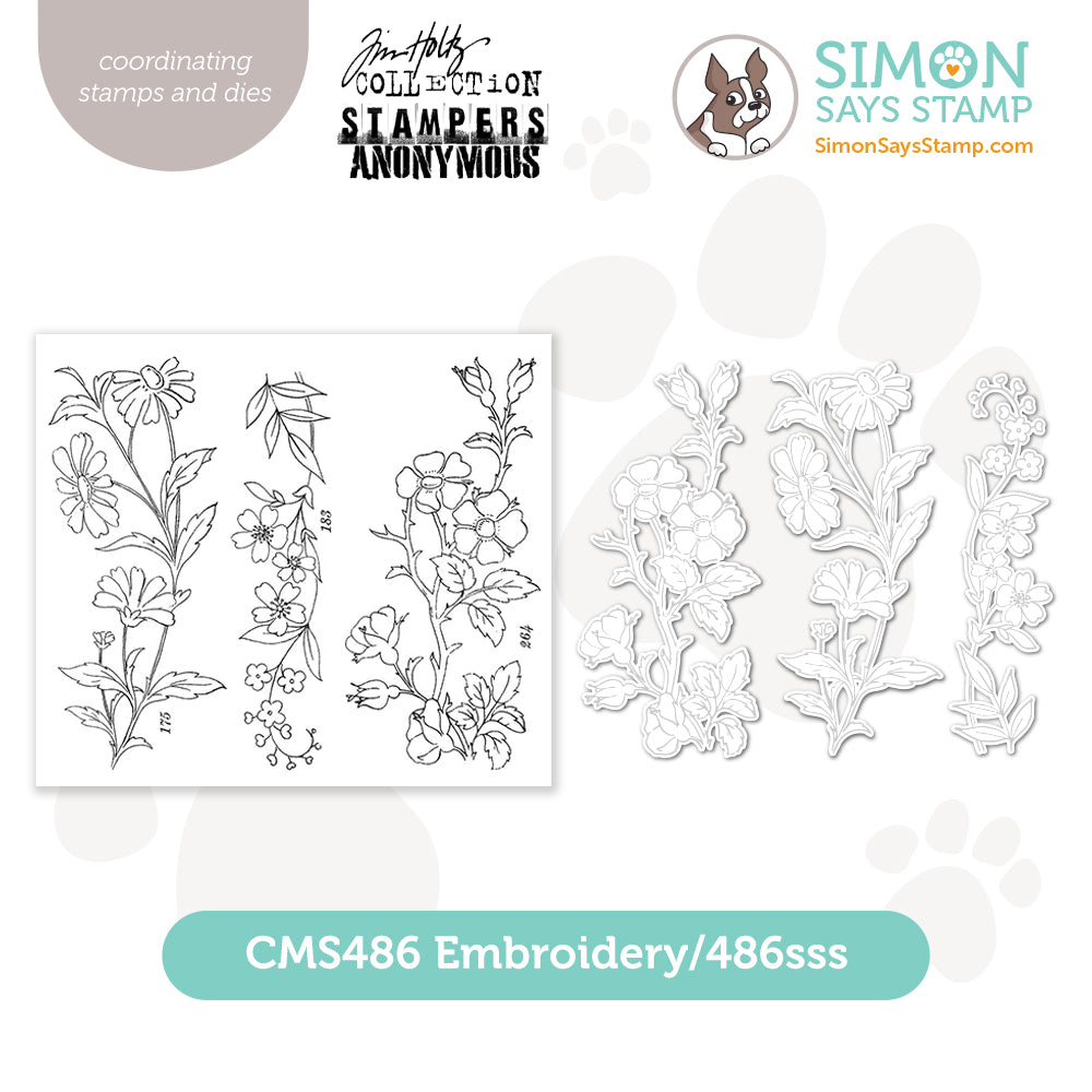 This bundle includes the Tim Holtz Embroidery Cling Rubber Stamps and the Simon Says Stamp Embroidery coordinating dies.