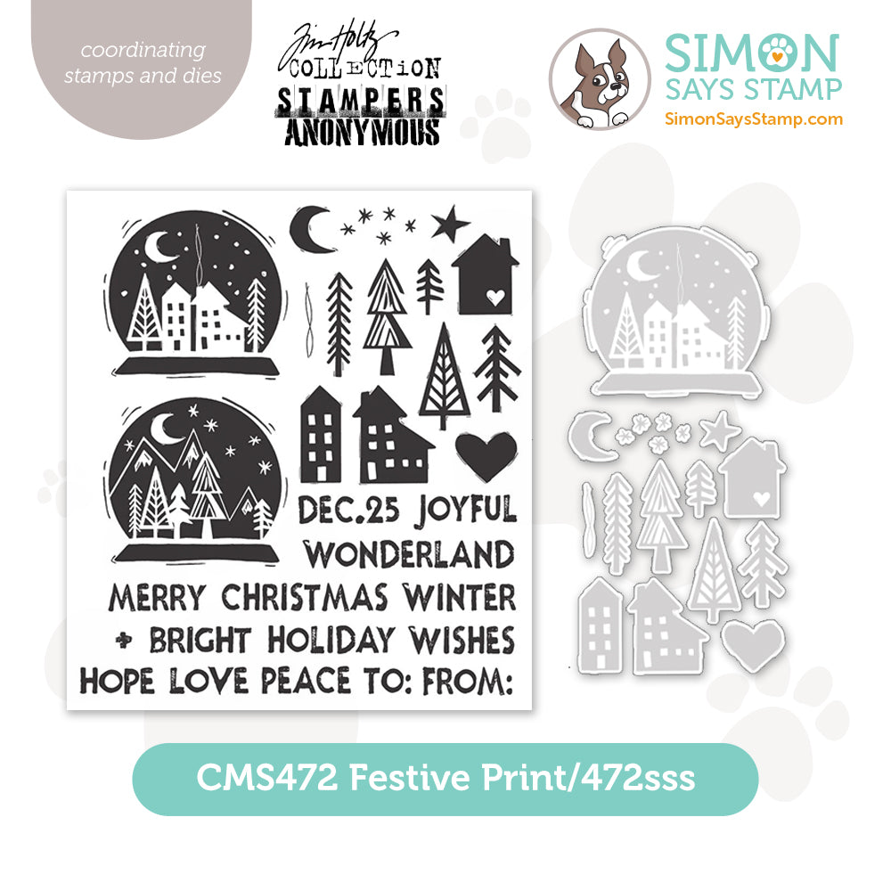 This bundle includes the Tim Holtz Festive Print Cling Rubber Stamps and the Simon Says Stamp Festive Print coordinating dies.
