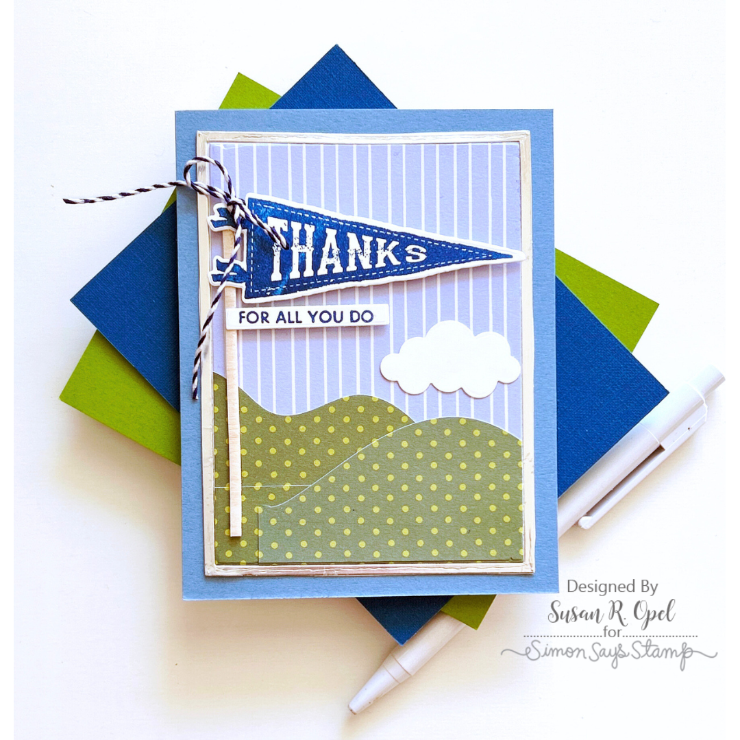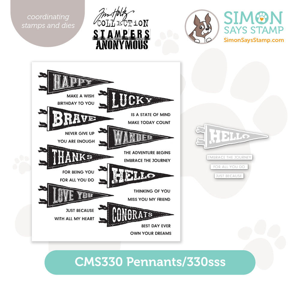 This bundle includes the Tim Holtz Pennants Cling Rubber Stamps and the Simon Says Stamp Pennants coordinating dies.