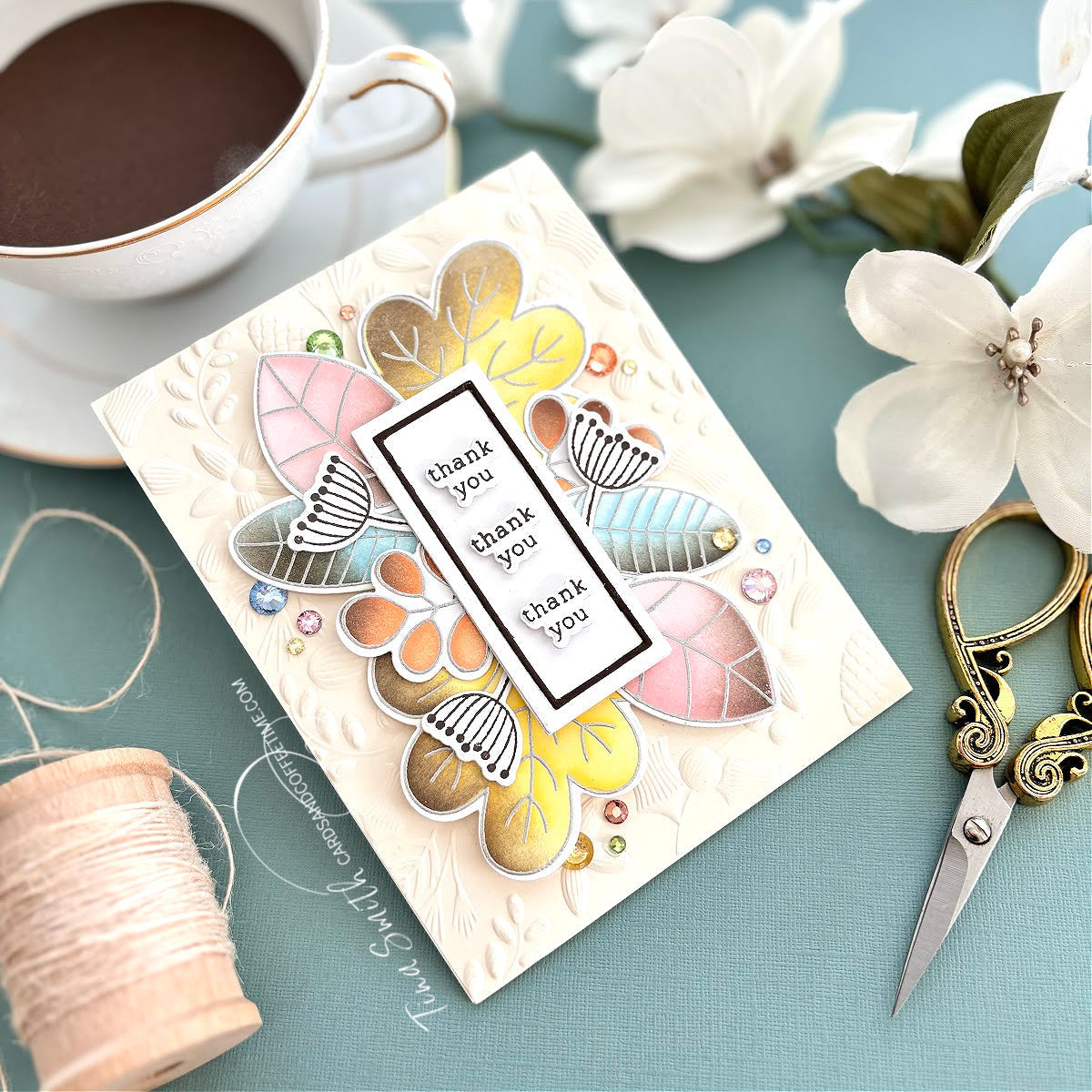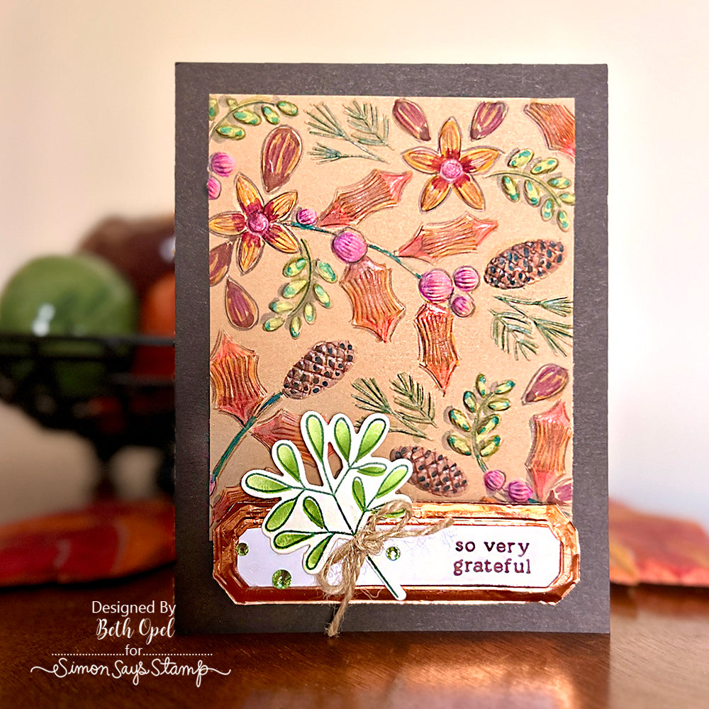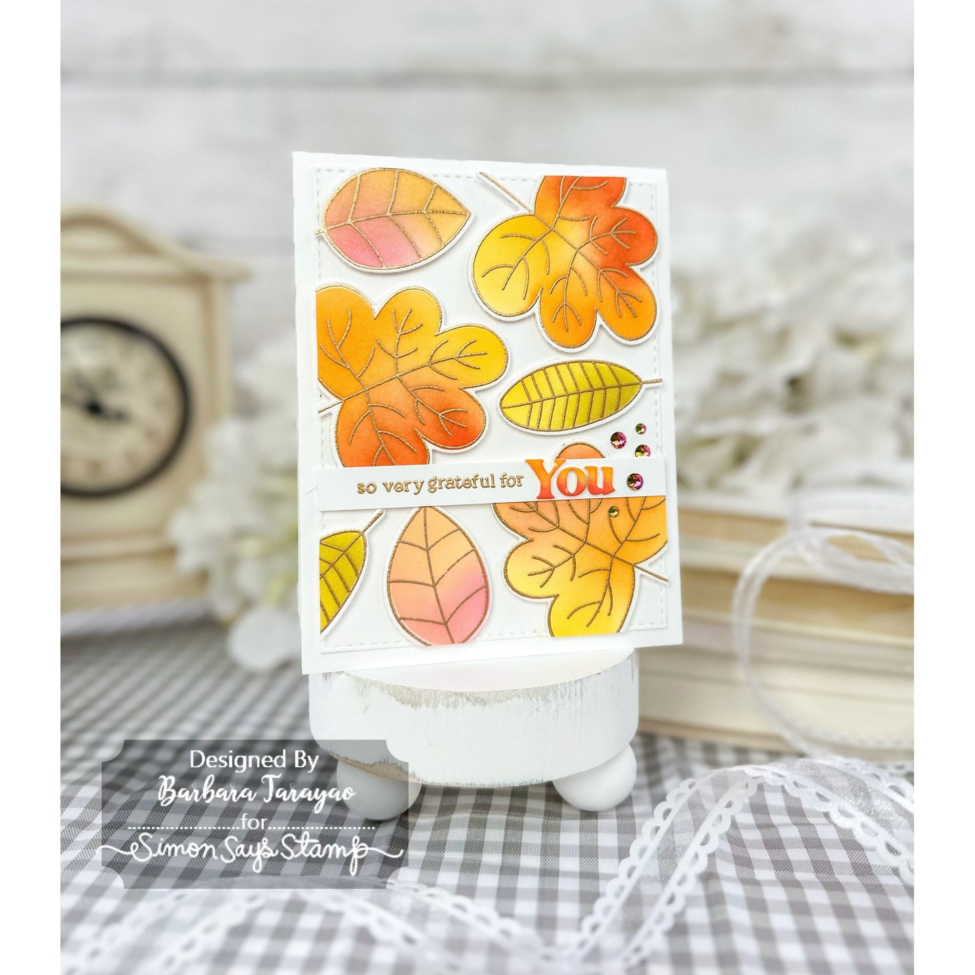 The Simon Says Stamp Two-Step Simple Leaves dies cut out all the finished layered leaves and the small typewritten sentiments from the coordinating stamp set.