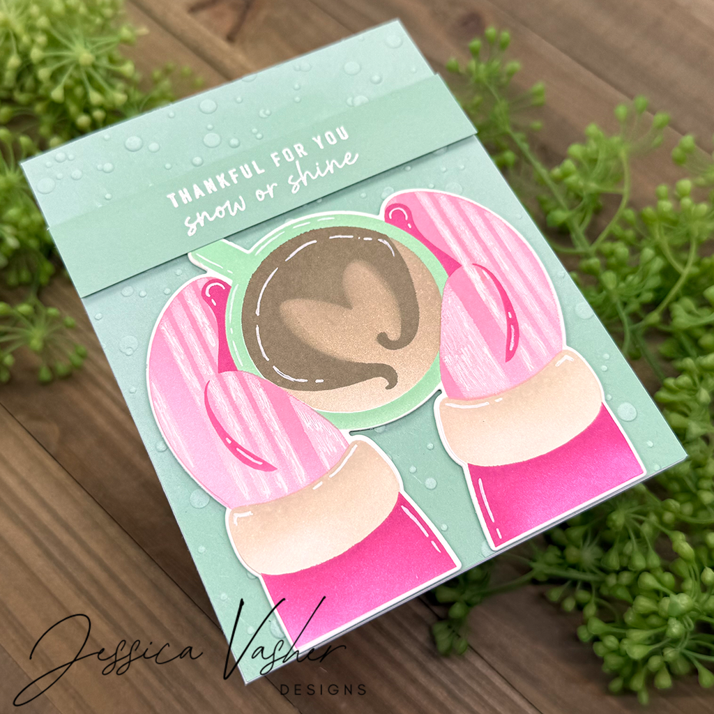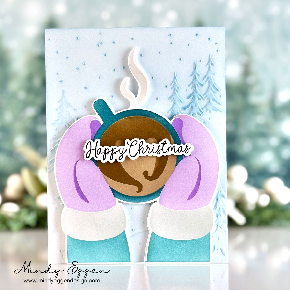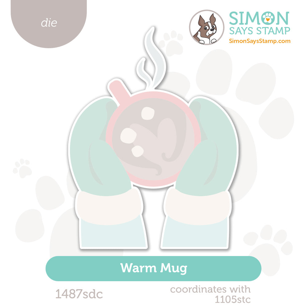 The Simon Says Stamp Warm Mug die coordinates perfectly with the Warm Mug stencils, cutting out the completed cozy image of mittened hands holding a mug of hot chocolate with marshmallows.