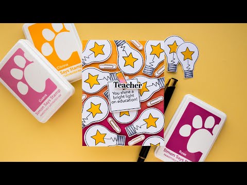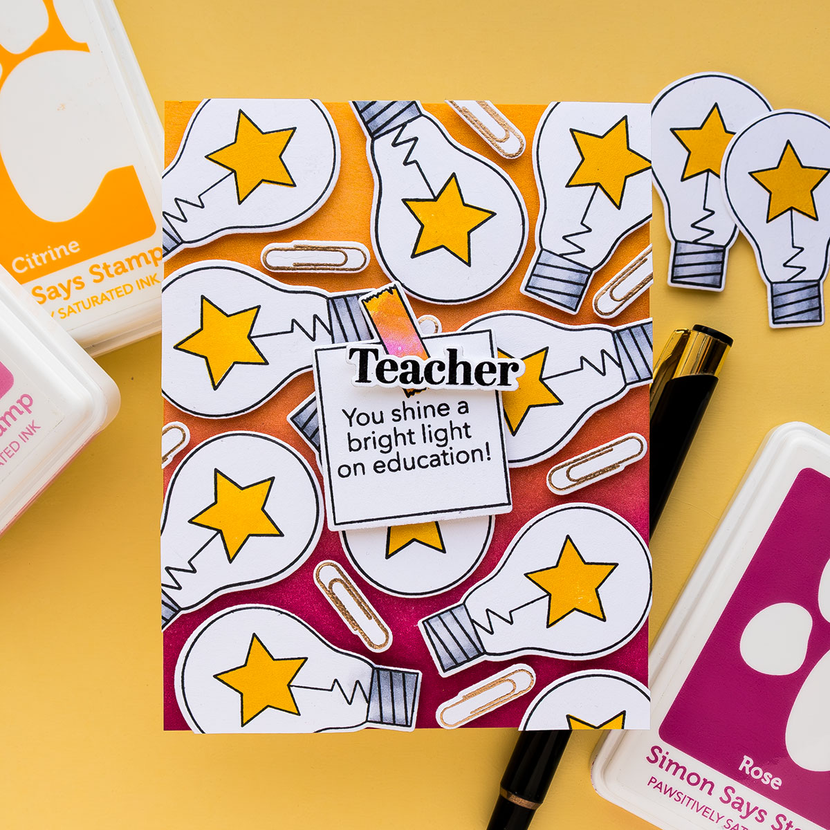 Express gratitude with the Simon Says Stamp Appreciate You Bundle. Images include a light bulb with a star filament, an apple, a post-it note, a paper clip, and stars.