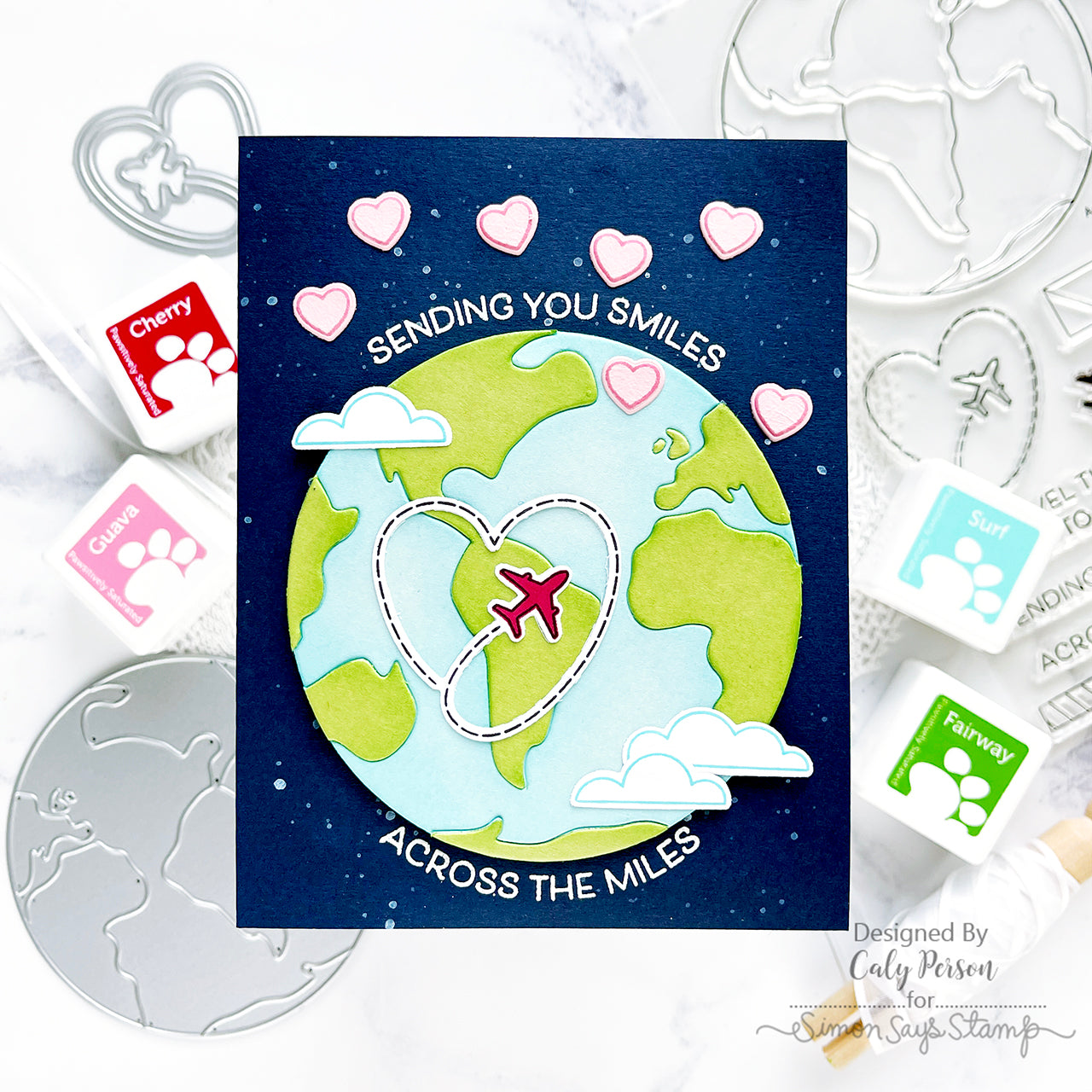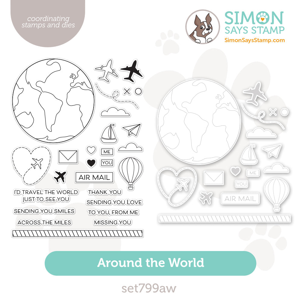 Embark on a global adventure with the Simon Says Stamp Around the World stamp and die set! This delightful set features a charming array of travel-themed images, including the earth, airplanes, skywriting, a hot air balloon, an envelope, clouds, a sailboat, and hearts.