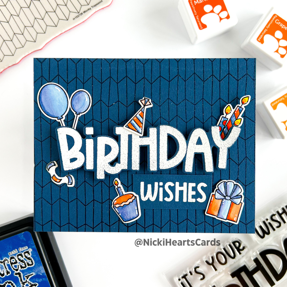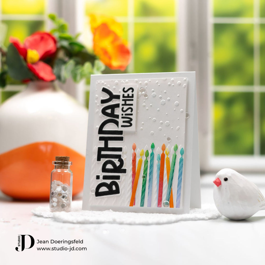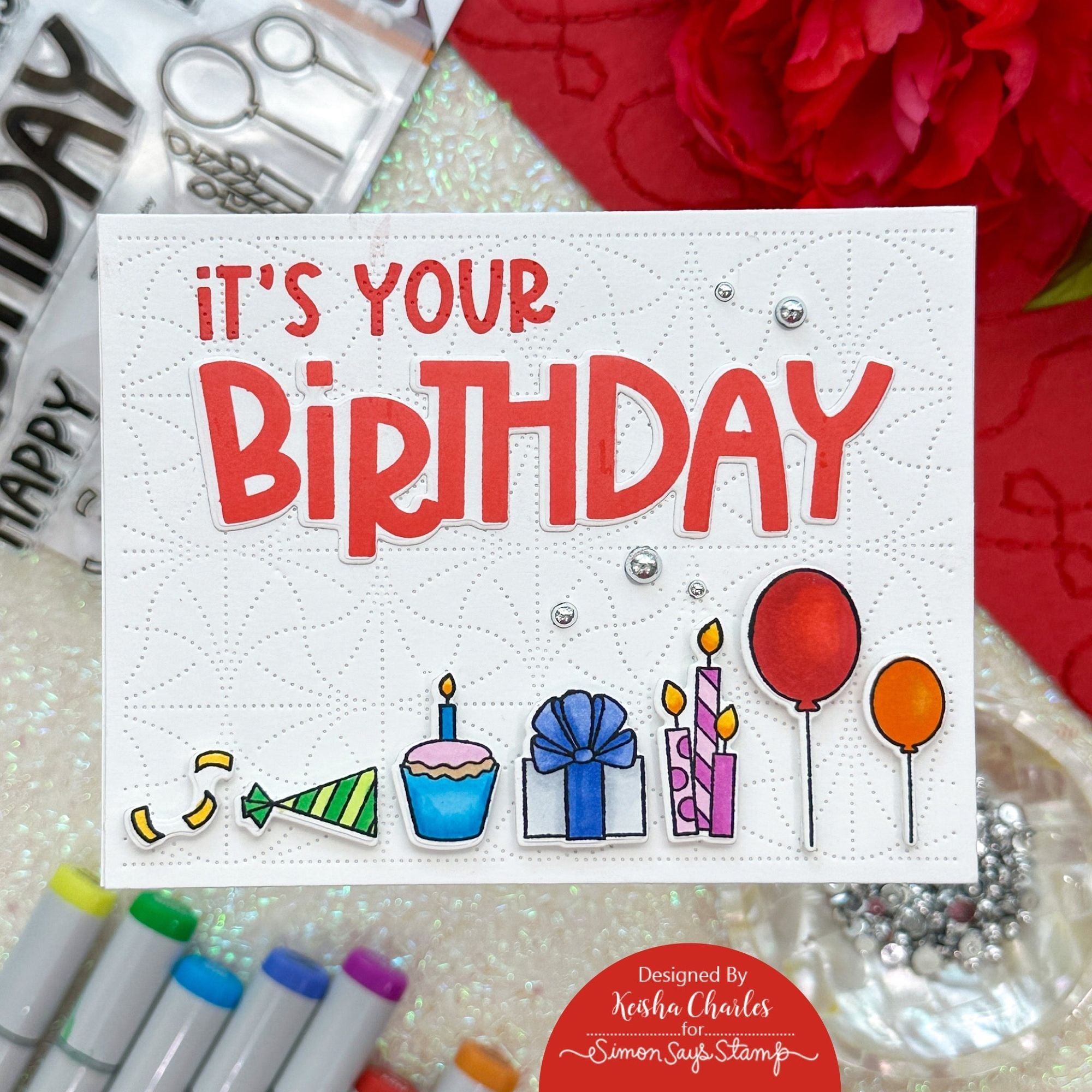 The Simon Says Stamp Big Bold Birthday stamp set brings celebratory flair to your projects. Create eye-catching birthday cards and more with its bold and versatile designs. The set includes images of confetti, balloons, a cupcake, candles, a gift, and a party hat.