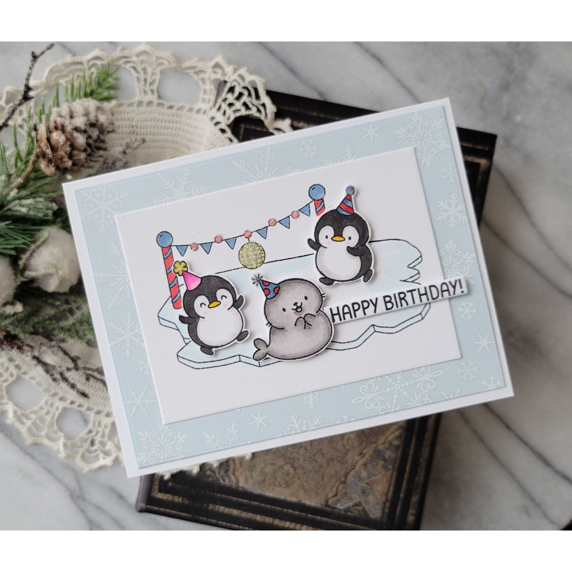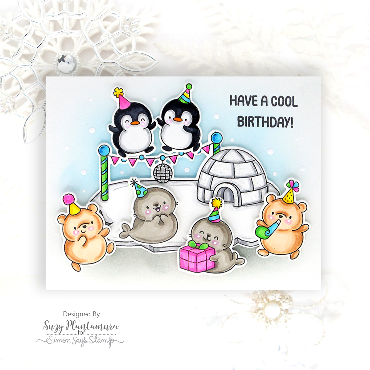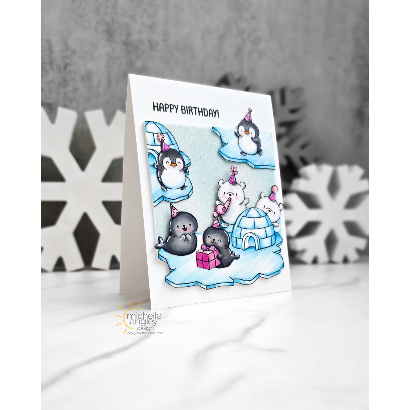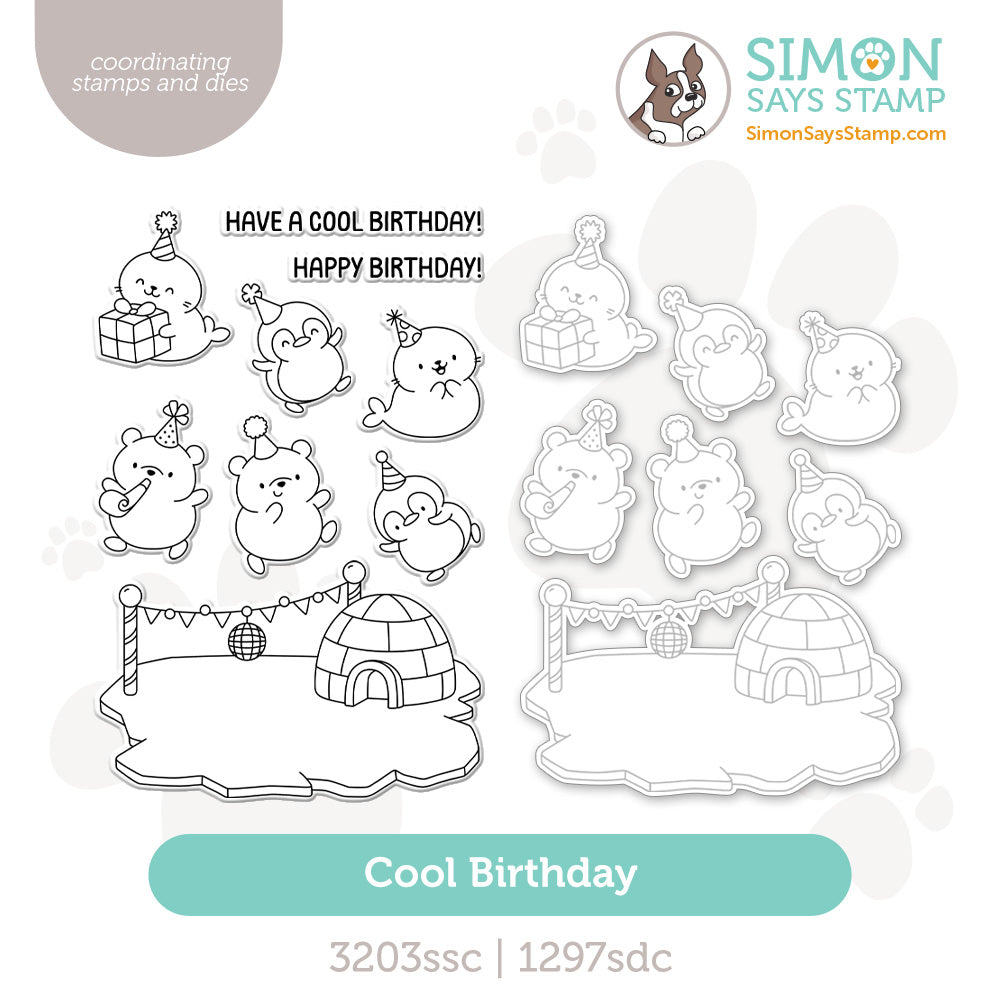 The Simon Says Stamp Cool Birthday stamp and die set brings frosty fun to your celebrations. This playful collection features polar creatures—penguins, seals, and bears—all decked out in festive party gear. To set the scene, there is also an icy backdrop of a floating ice floe with a whimsical igloo, decorated with a sparkling disco ball and cheerful party banner.