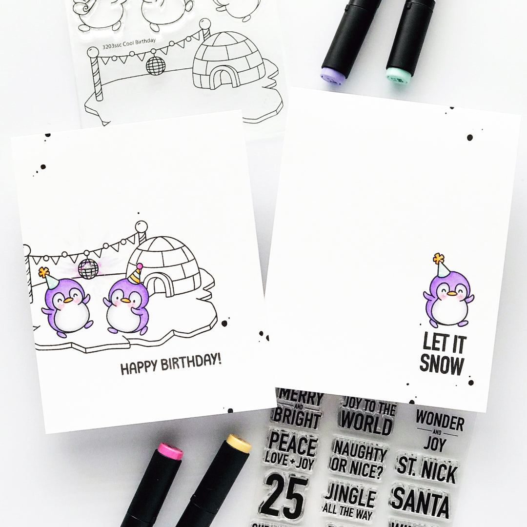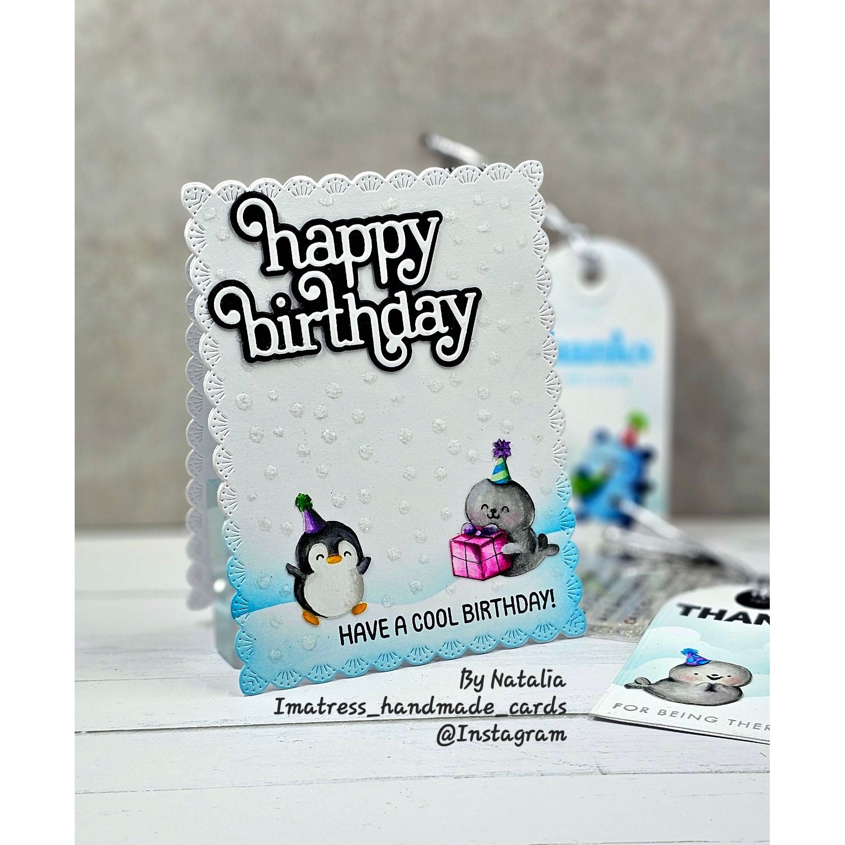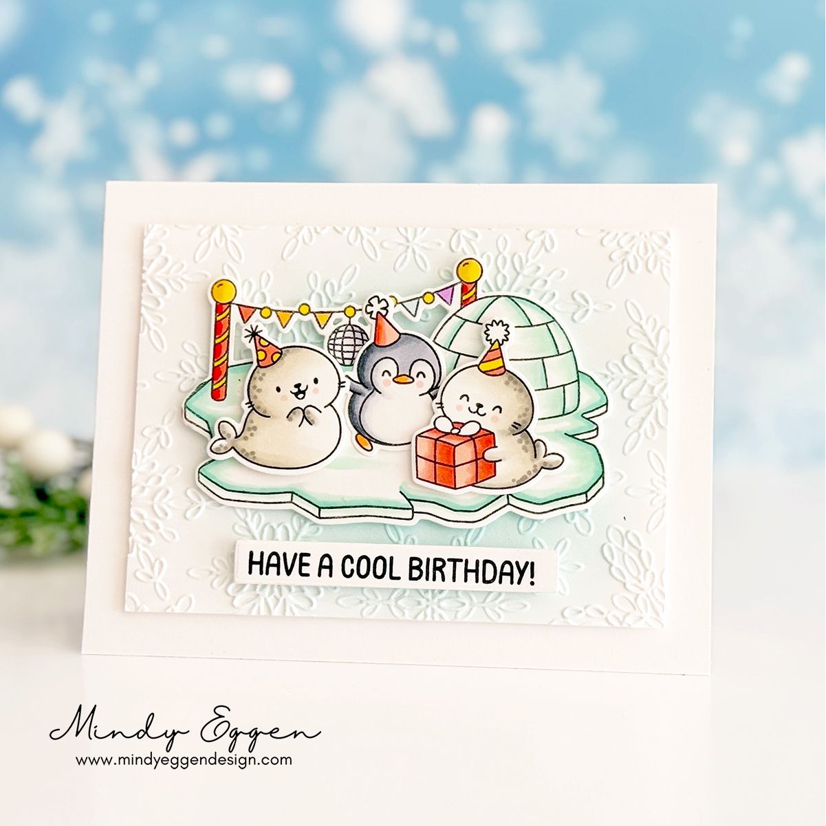 The Simon Says Stamp Cool Birthday stamp and die set brings frosty fun to your celebrations. This playful collection features polar creatures—penguins, seals, and bears—all decked out in festive party gear. To set the scene, there is also an icy backdrop of a floating ice floe with a whimsical igloo, decorated with a sparkling disco ball and cheerful party banner.