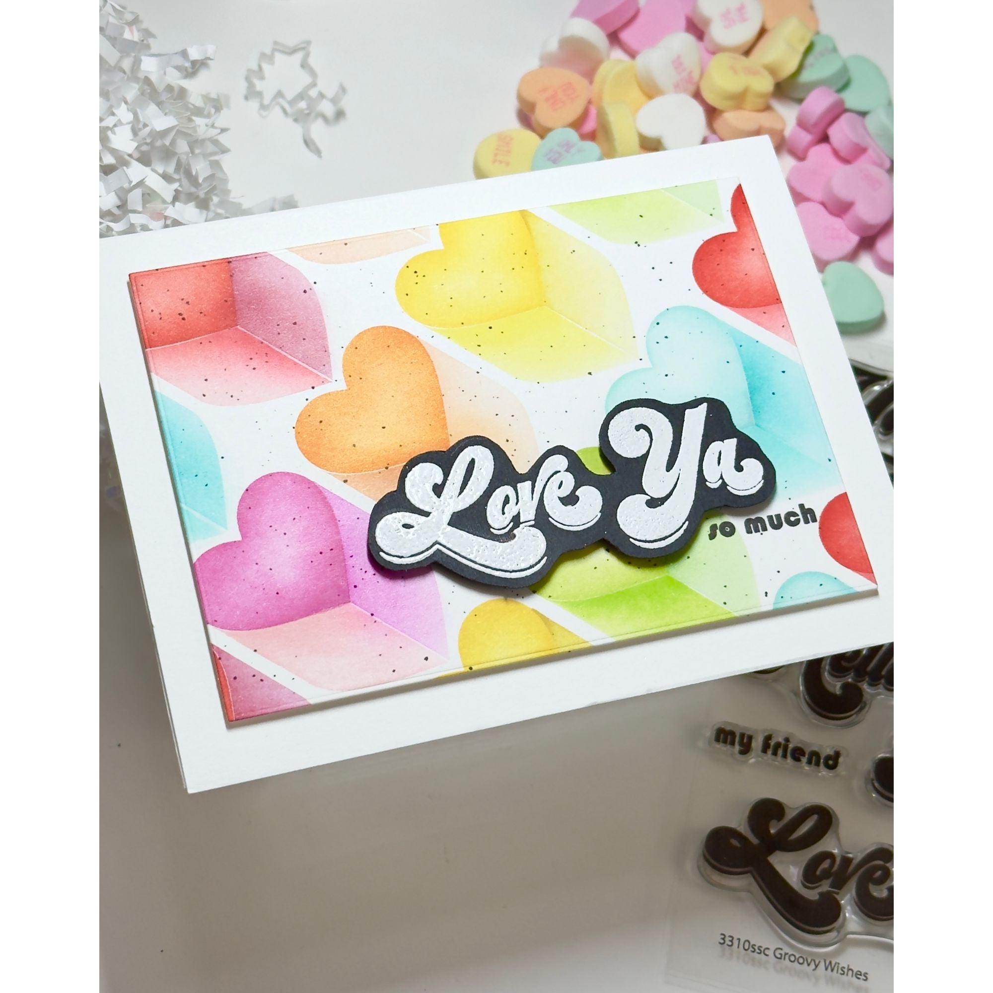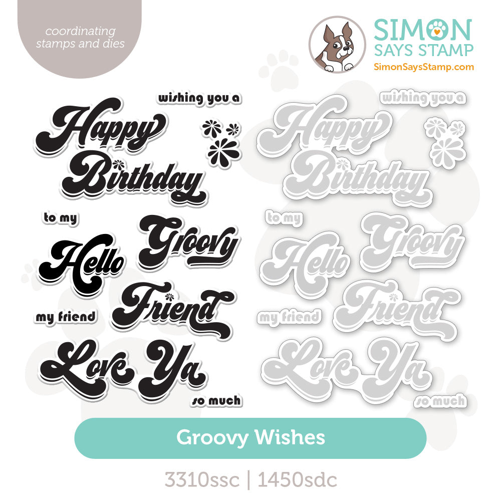 The Simon Says Stamp Groovy Wishes stamps and dies set is a fun sentiment collection featuring greetings in a bold, retro seventies–inspired font.