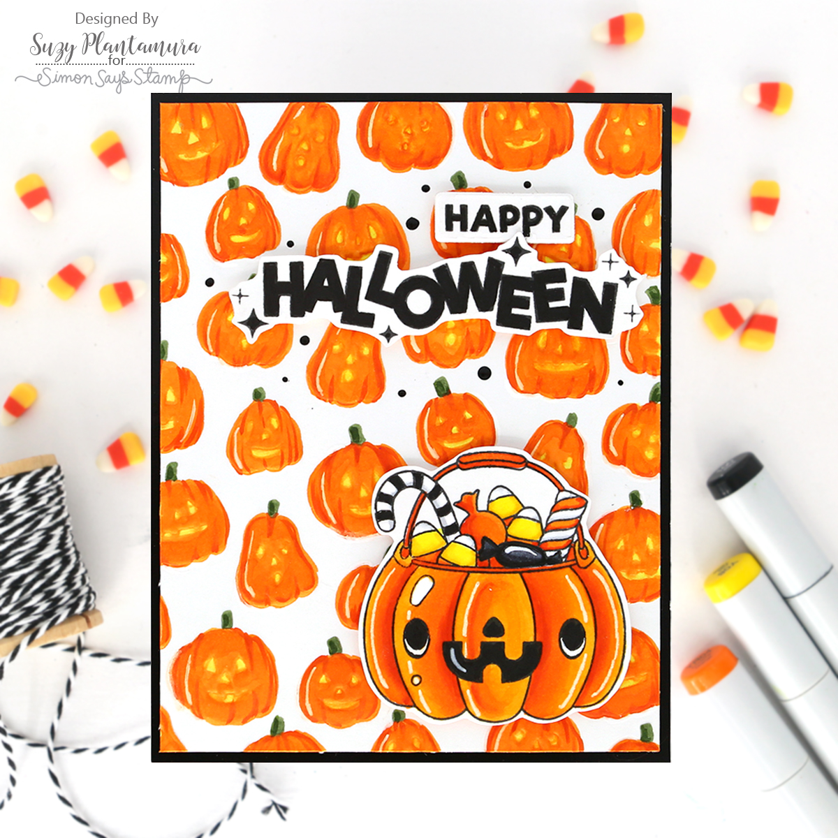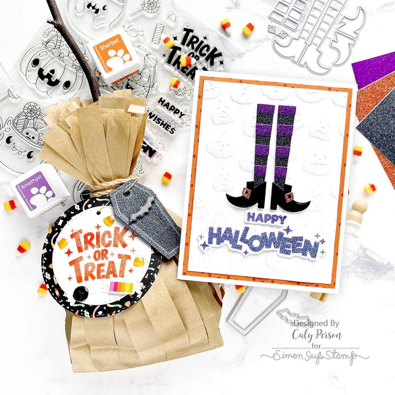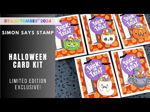 The Simon Says Stamp Halloween Treats stamp and die set features a collection of playful Halloween icons, such as a ghost, pumpkin, bat, skull, and monster, all serving as treat containers brimming with candy.