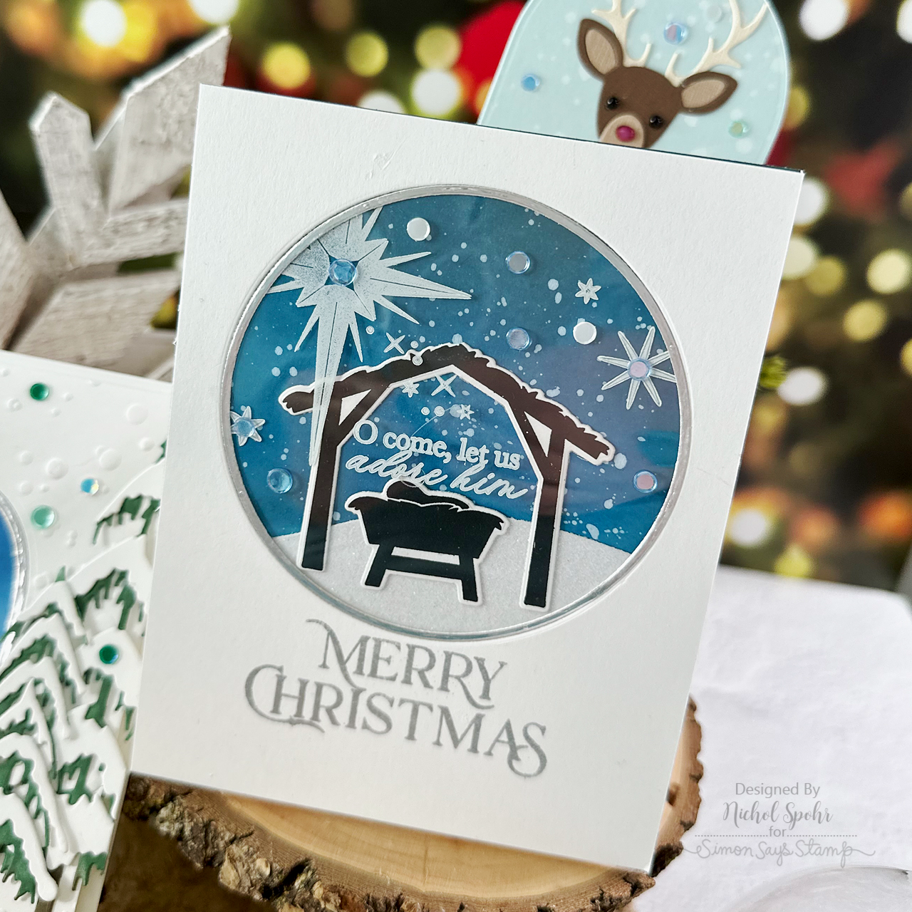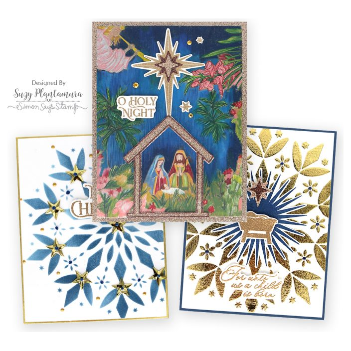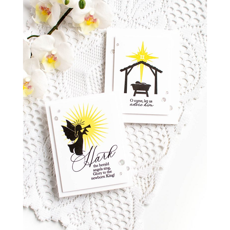 Introducing the Simon Says Stamp Hark the Newborn King stamp and die set! This exquisite 6 x 8 inch clear stamp set and coordinating dies are must-haves for all your holiday crafting needs. The set features beautifully detailed silhouette images of stars, a stable, a manger, and angels, capturing the essence of the nativity scene.