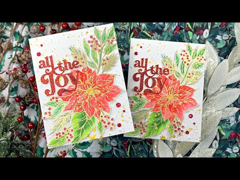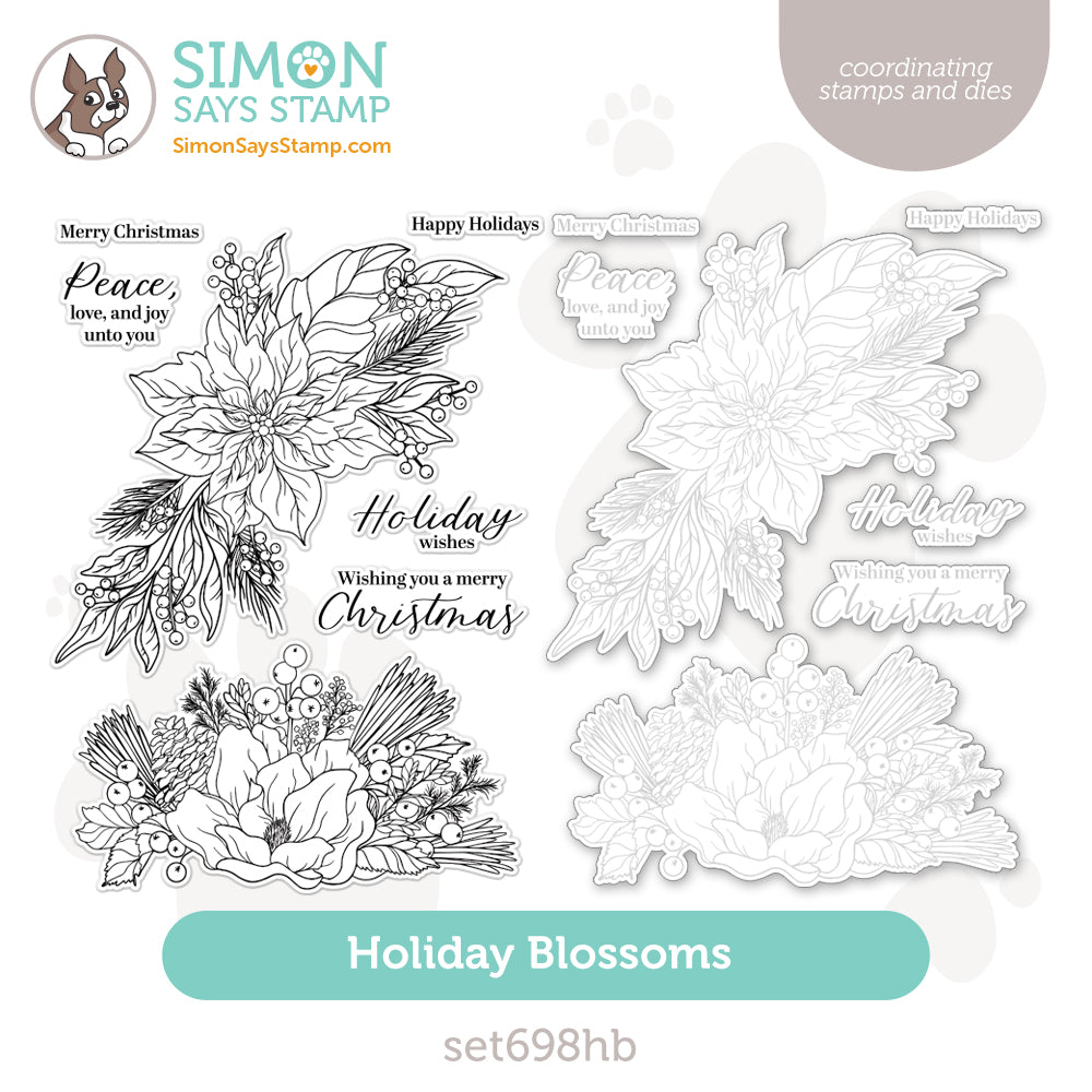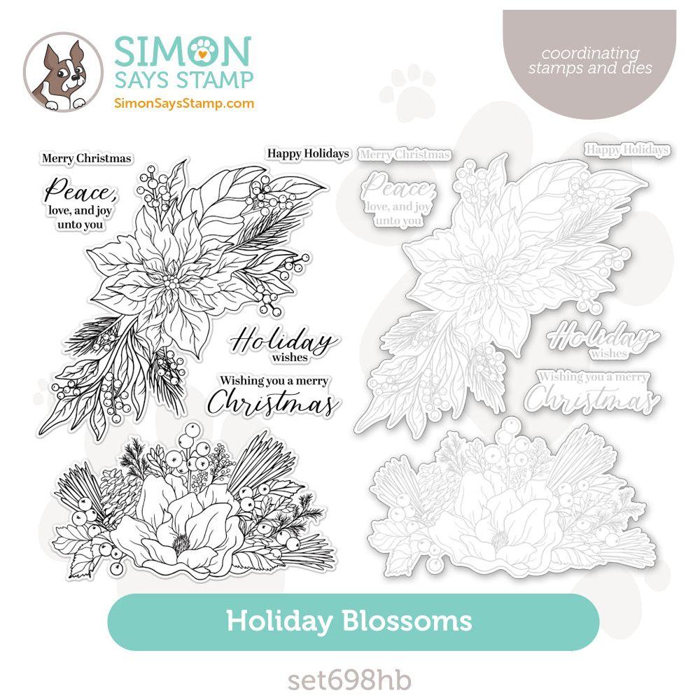 Introducing the Simon Says Stamp Holiday Blossoms stamp and die set, a festive addition to your holiday crafting toolkit. This set showcases two exquisite bouquets adorned with poinsettias, lush greenery, berries, and a delightful array of winter foliage.