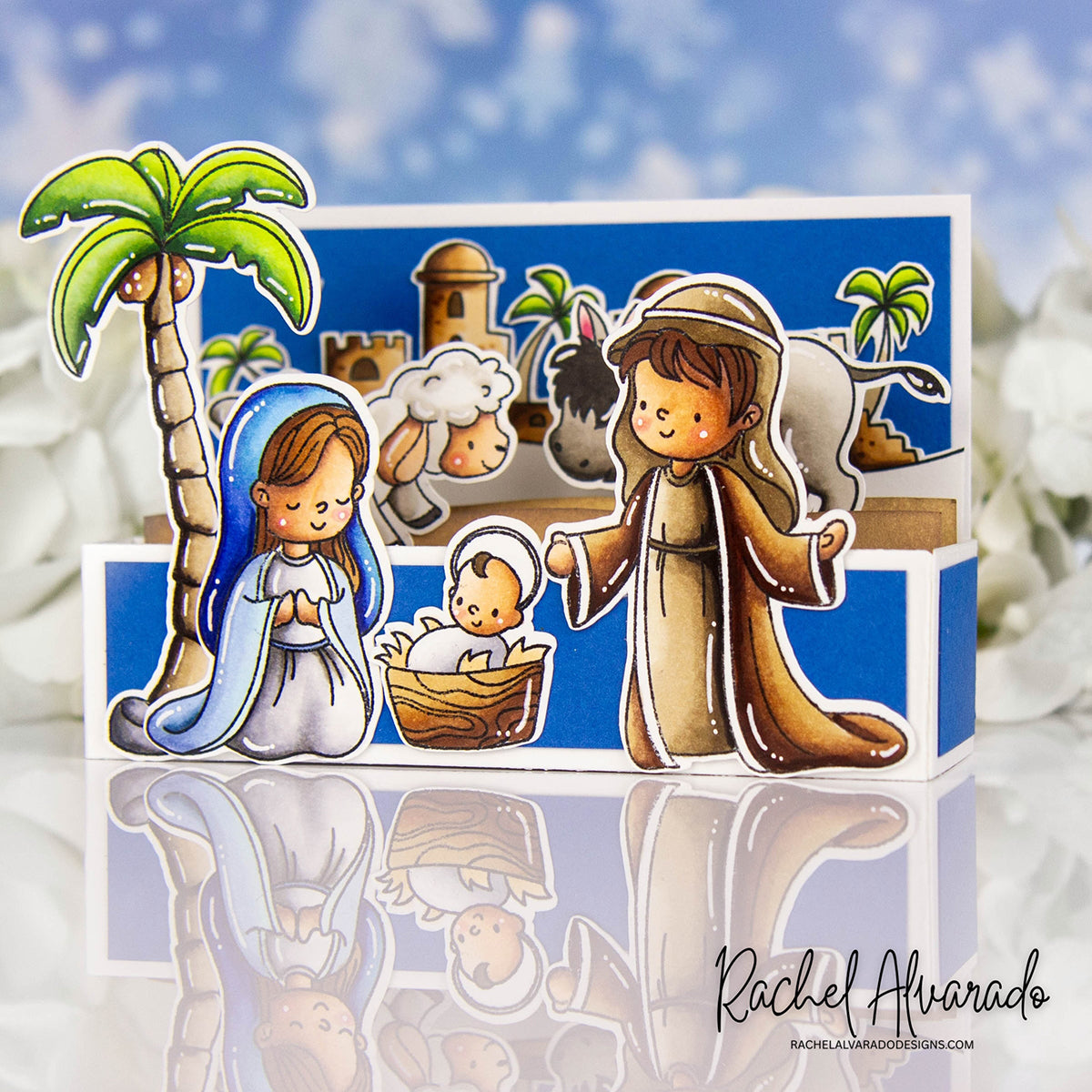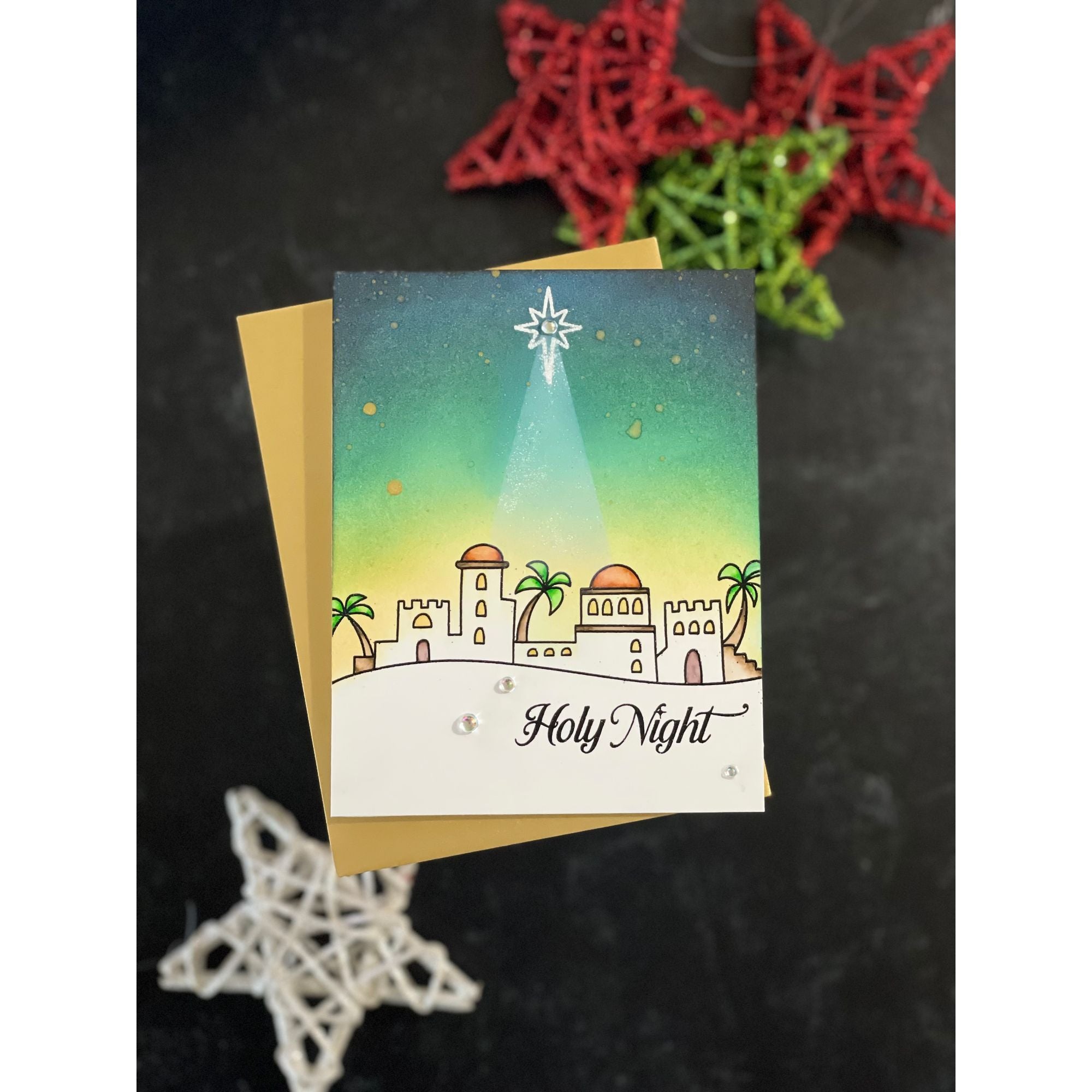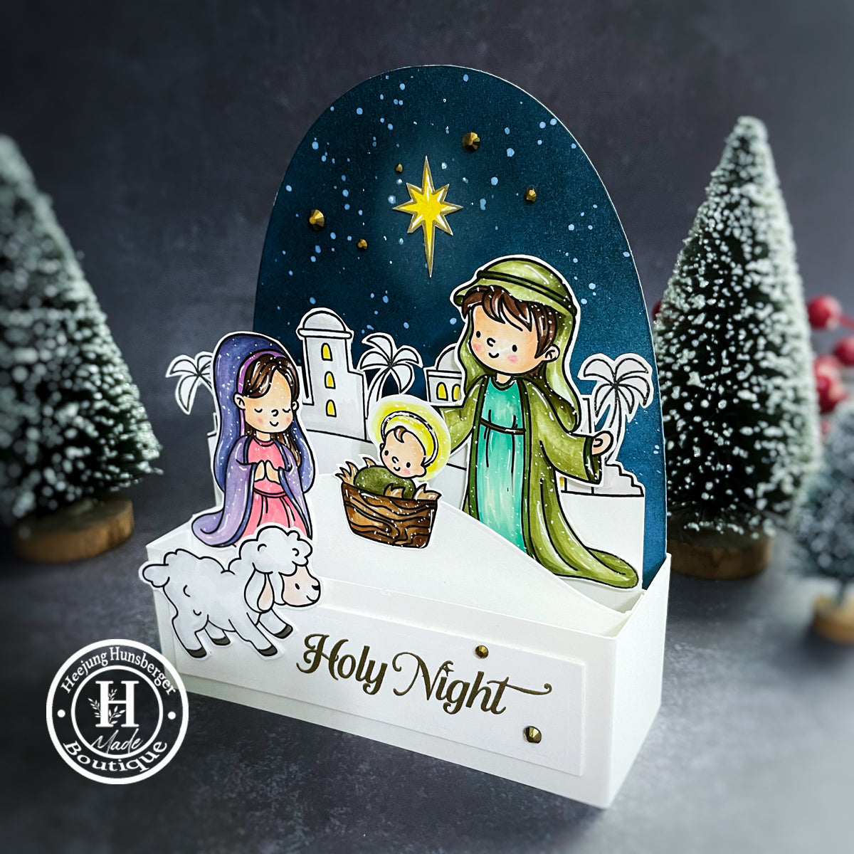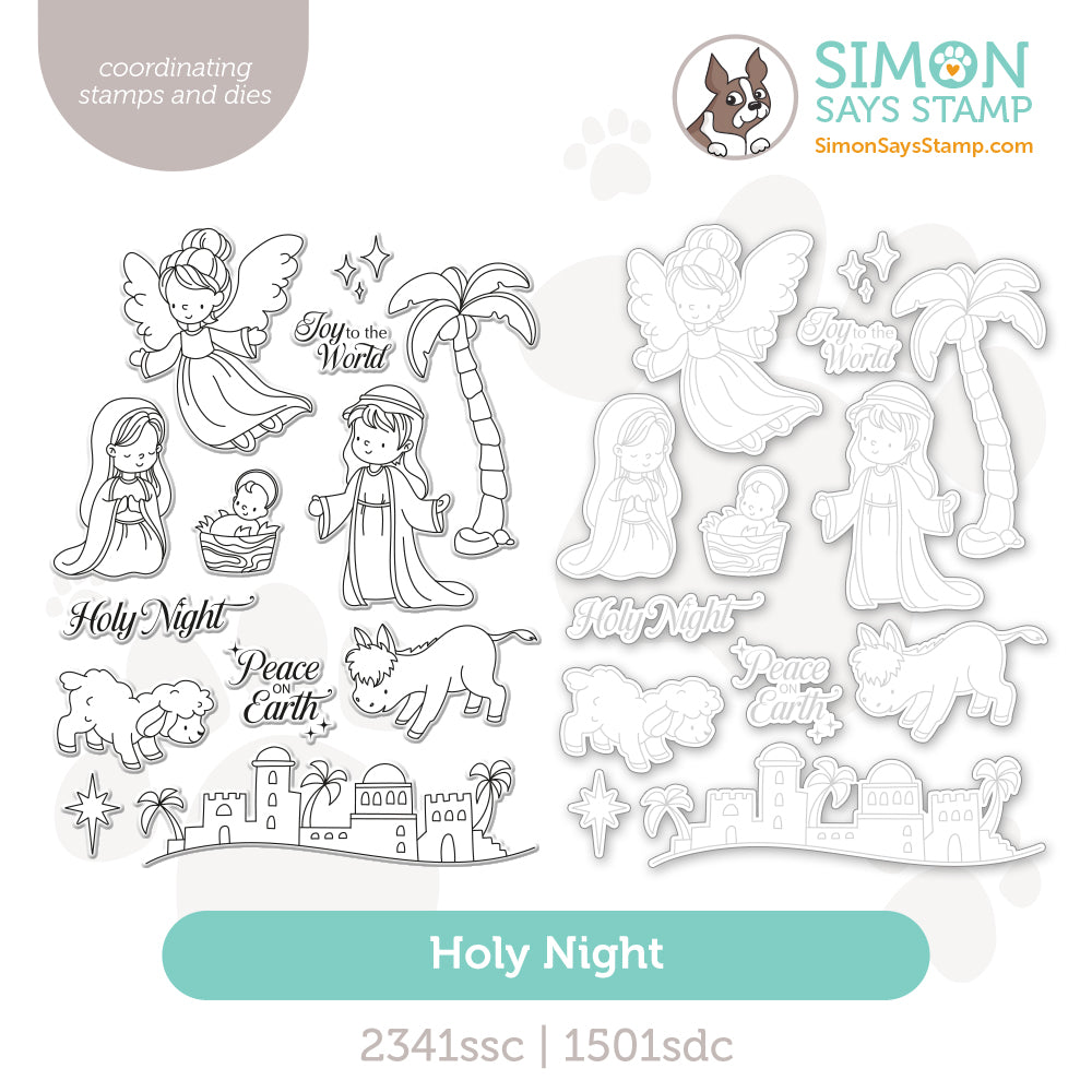 Capture the wonder of the Nativity with the Simon Says Stamp Holy Night stamp and die set. This beautifully illustrated collection features storybook-style images of the town of Bethlehem, Mary, Joseph, the baby Jesus, an angel, a palm tree, a lamb, a donkey, and shining stars—perfect for creating heartfelt, faith-filled holiday designs.
