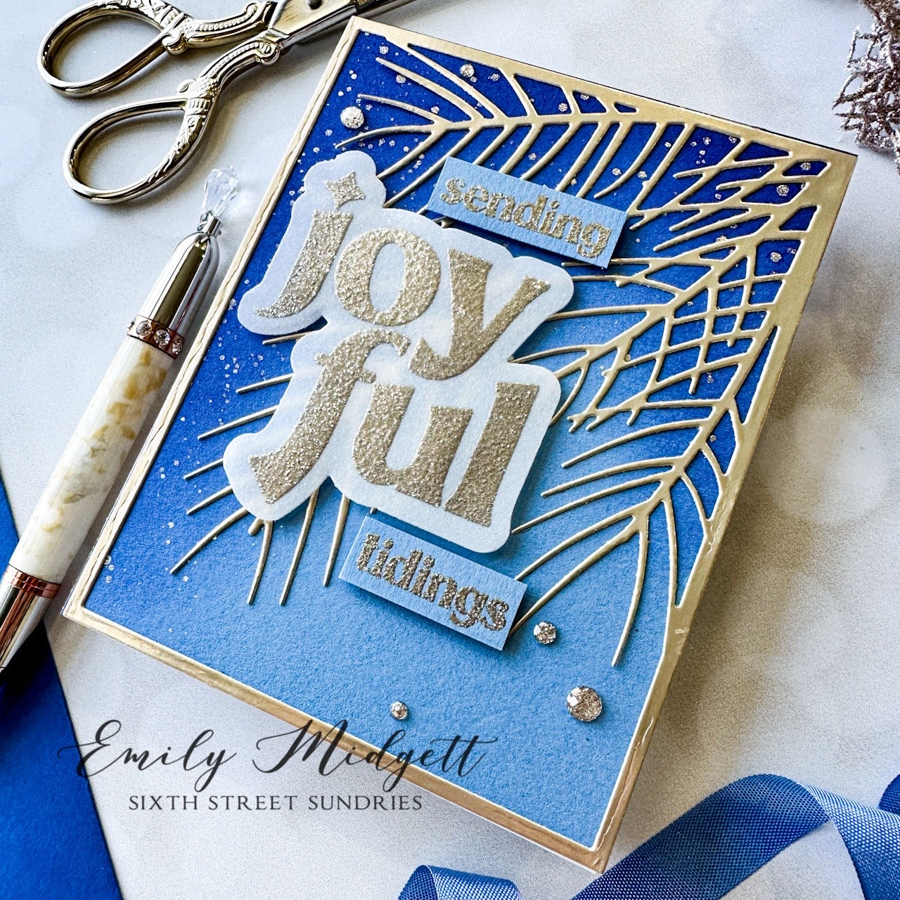 The set also includes three additional stars like the one dotting the j in “joyful” for you to incorporate into your designs. Use the dies to cut out the large greeting and stars.