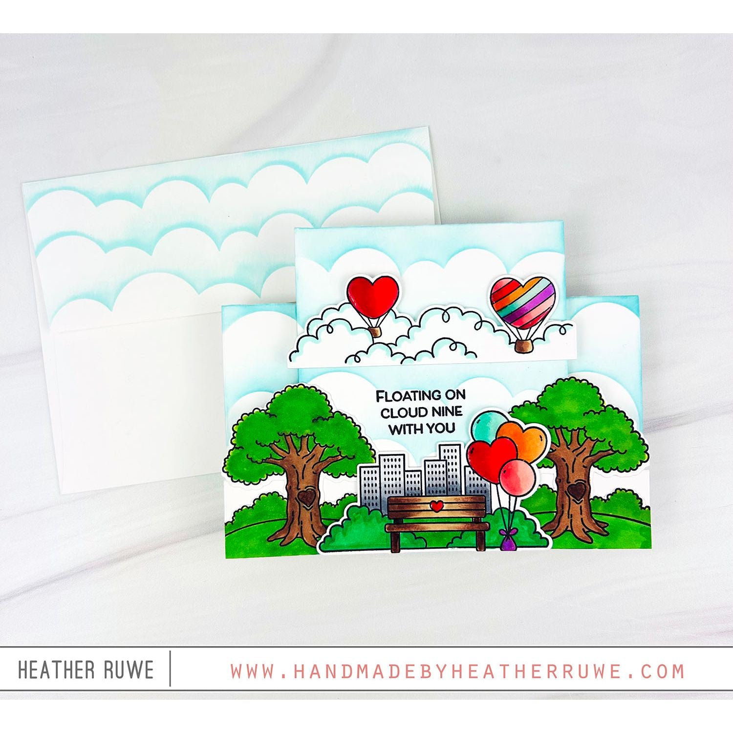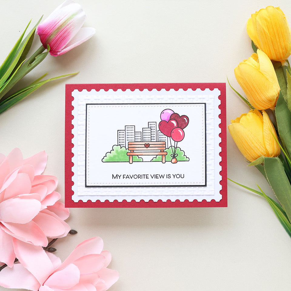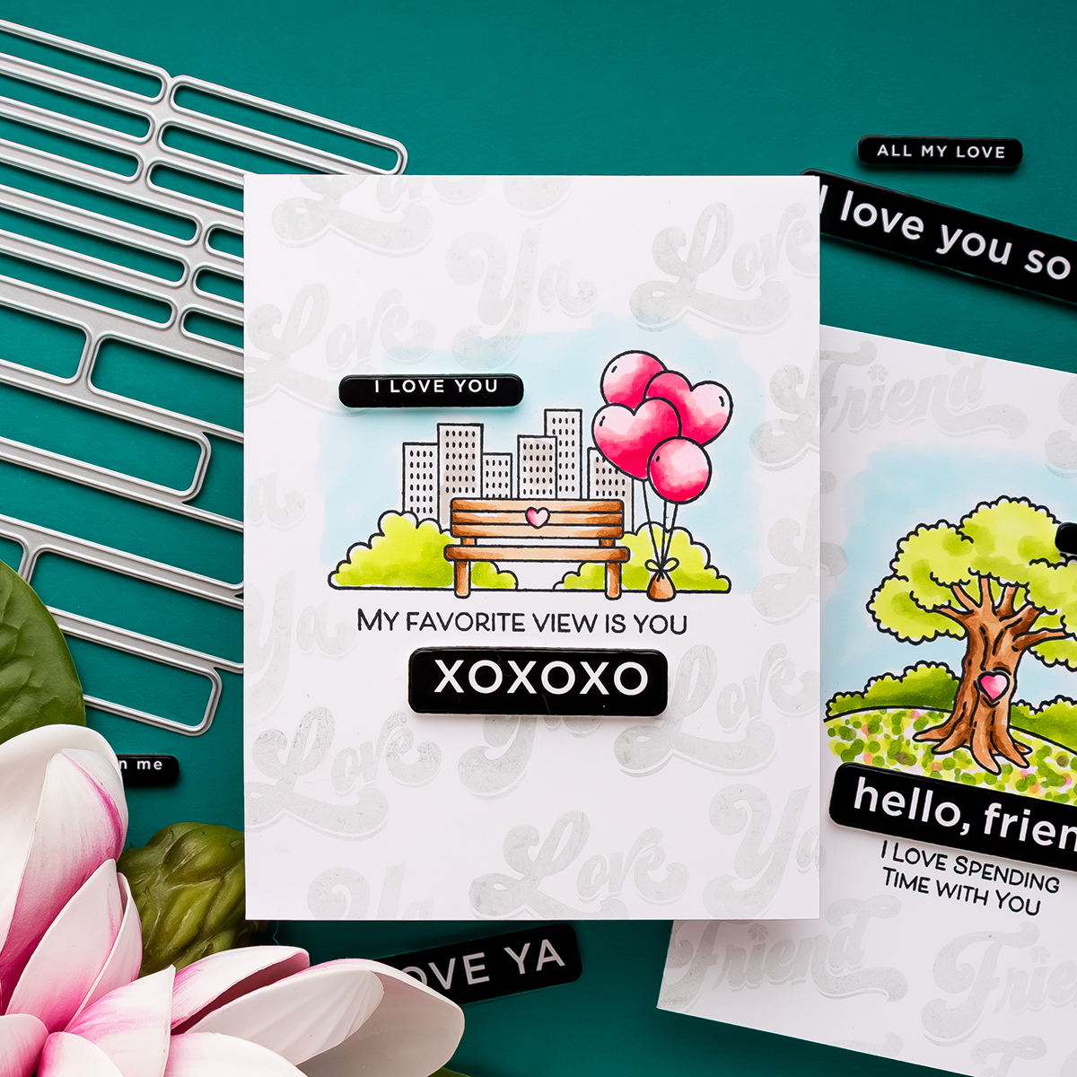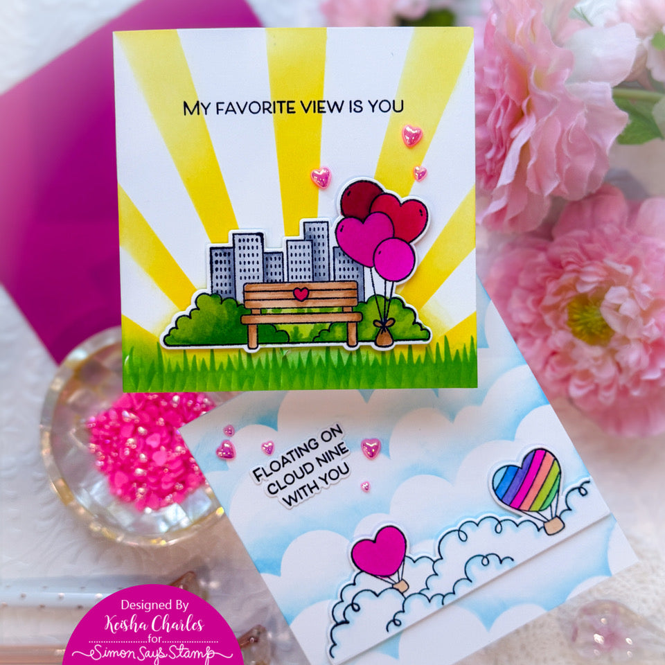 The Love Is in the Air stamps and dies from Simon Says Stamp features three charming scene images perfect for romantic cards and heartfelt projects: a dreamy sky filled with clouds and heart-shaped hot air balloons, a cozy park bench set against a city backdrop with a bunch of heart balloons, and a peaceful hillside tree with a heart carved into its trunk.