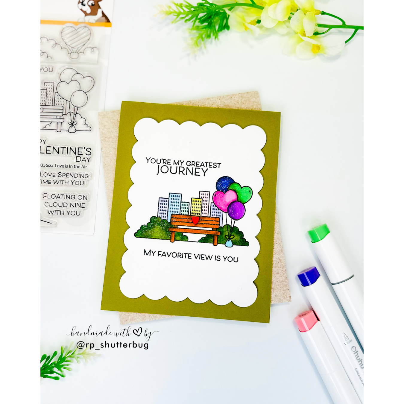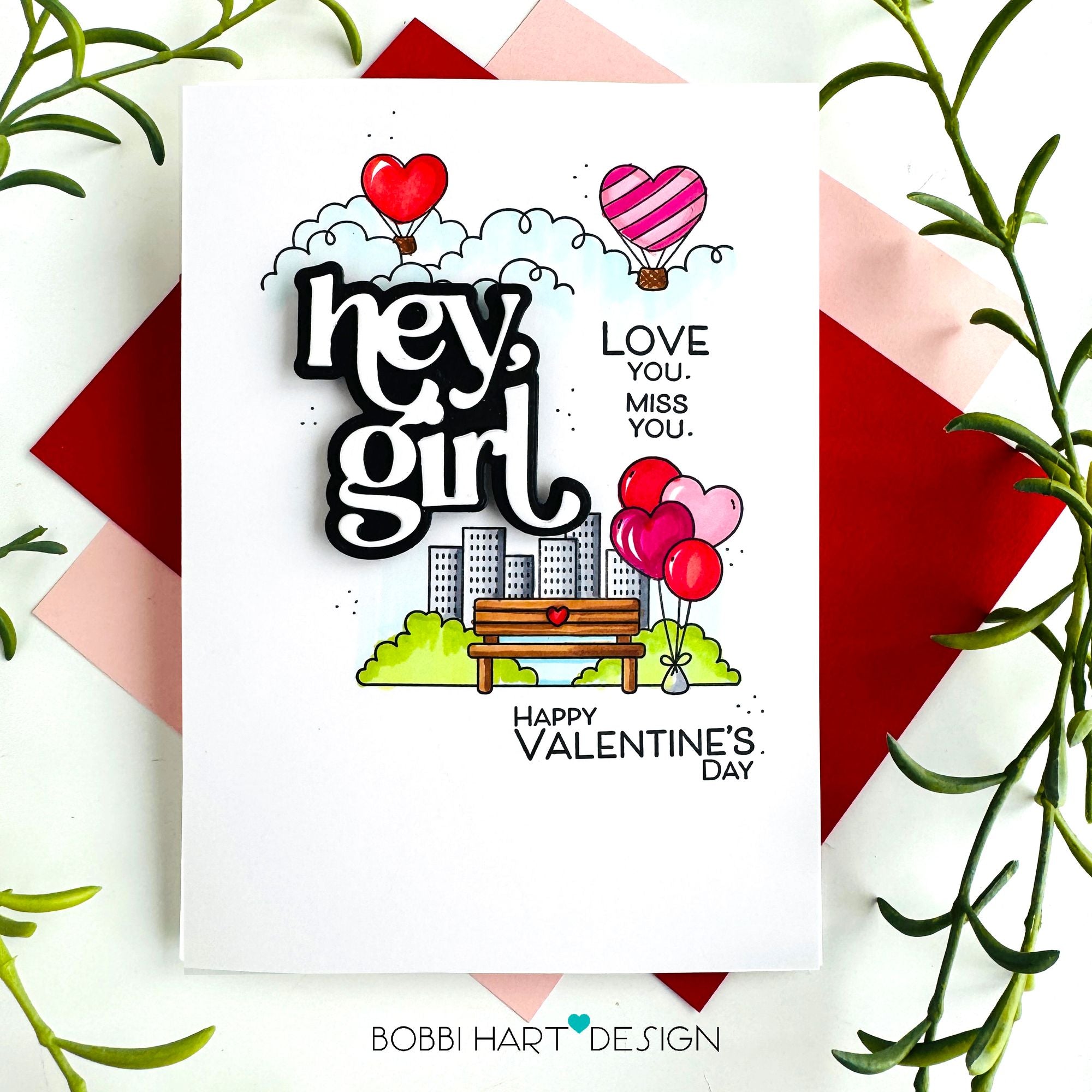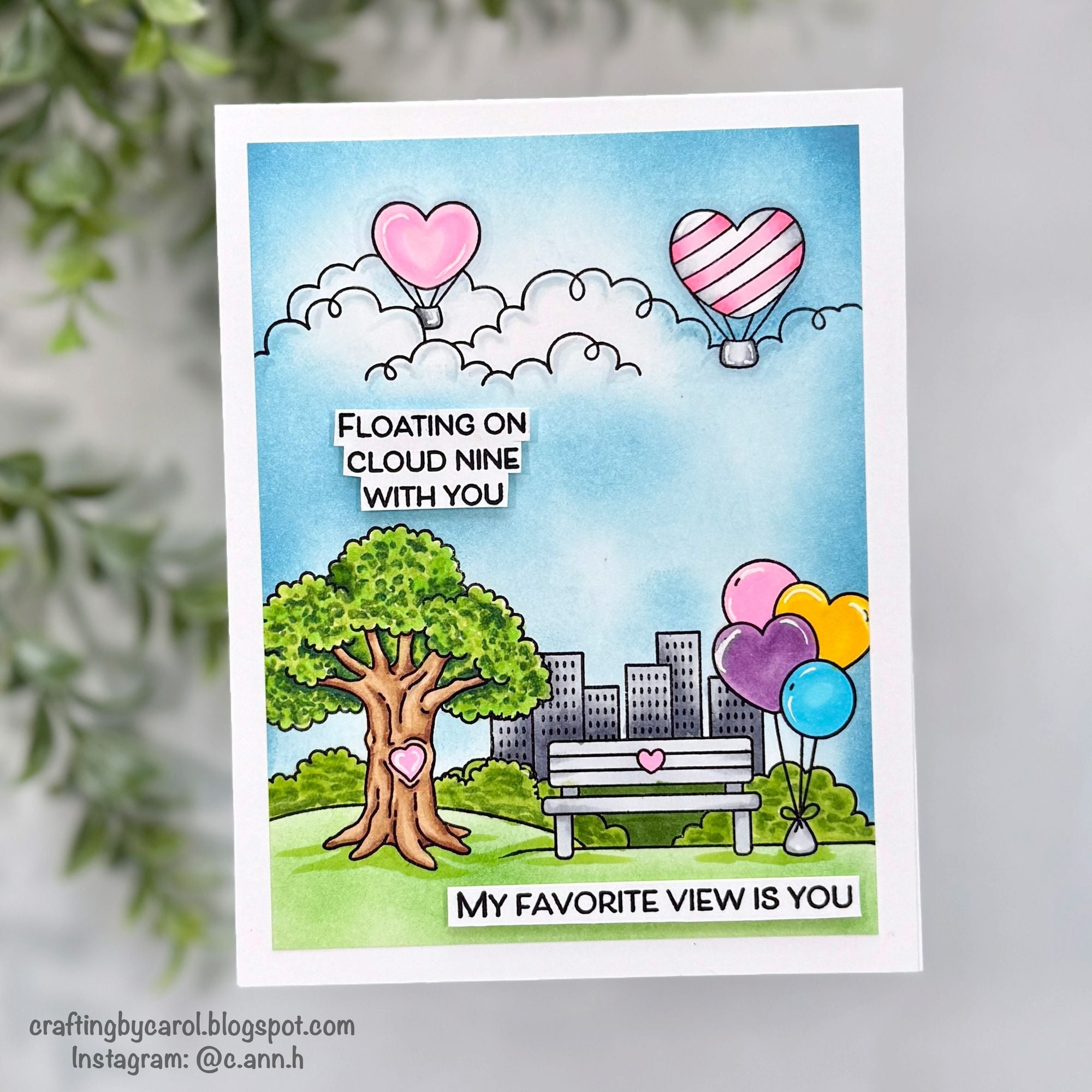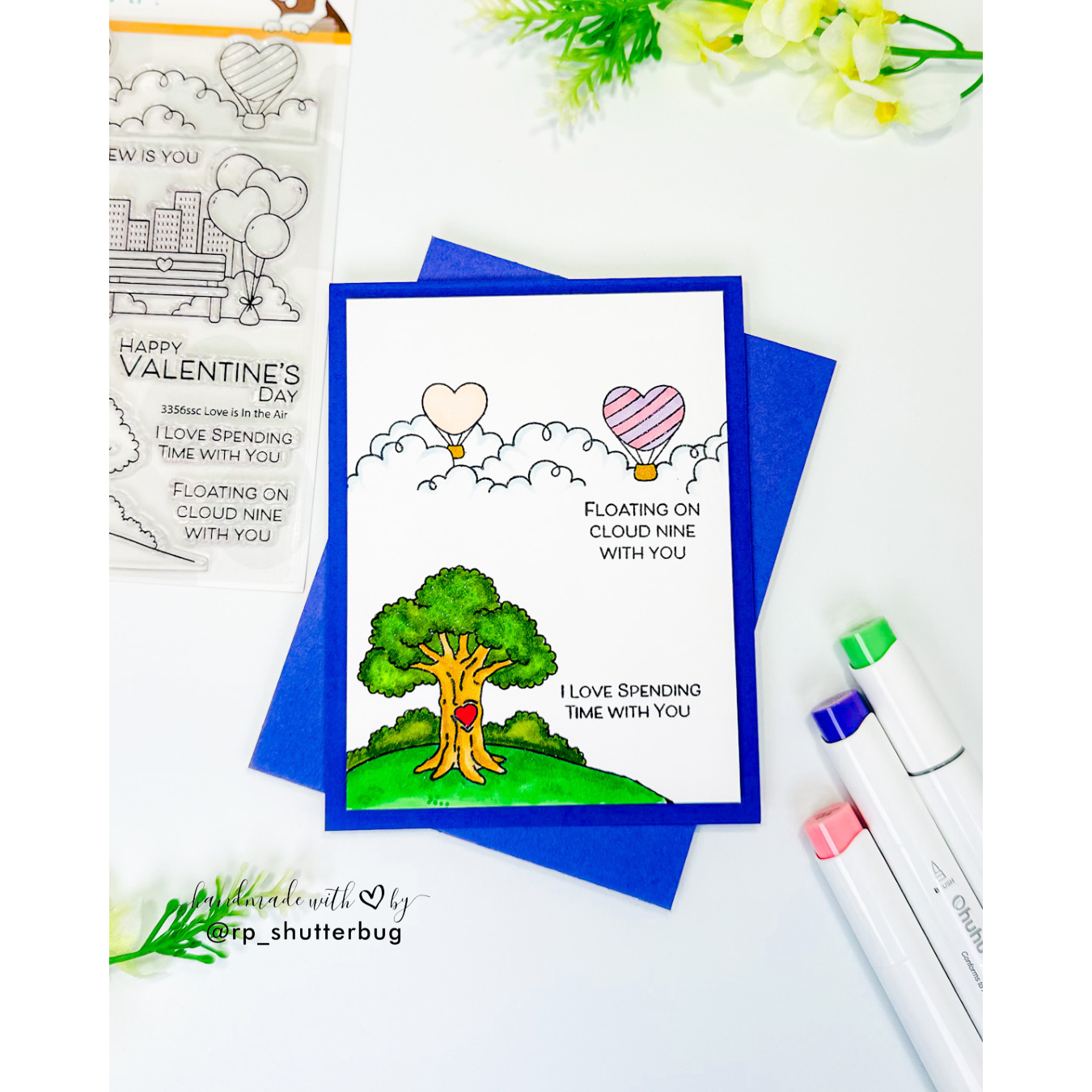 The Love Is in the Air stamps and dies from Simon Says Stamp features three charming scene images perfect for romantic cards and heartfelt projects: a dreamy sky filled with clouds and heart-shaped hot air balloons, a cozy park bench set against a city backdrop with a bunch of heart balloons, and a peaceful hillside tree with a heart carved into its trunk.
