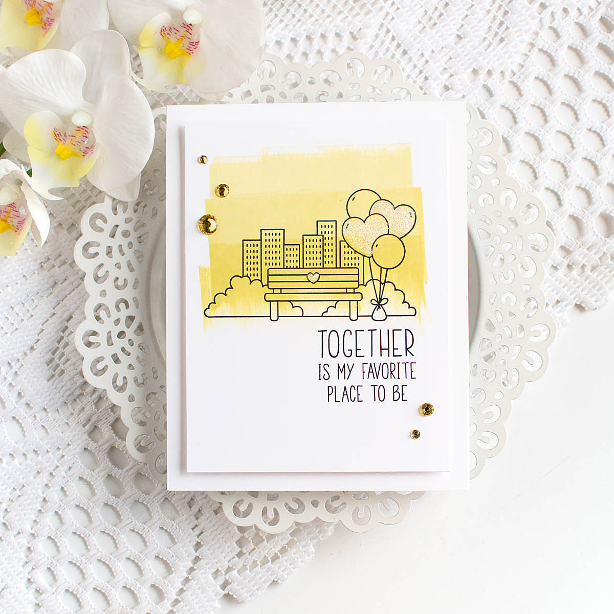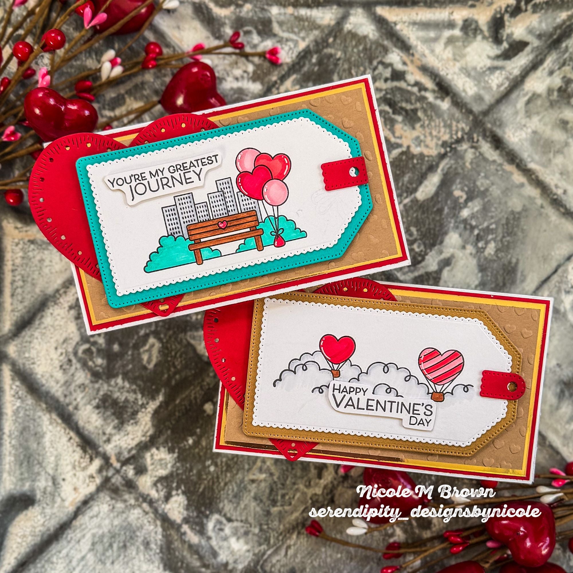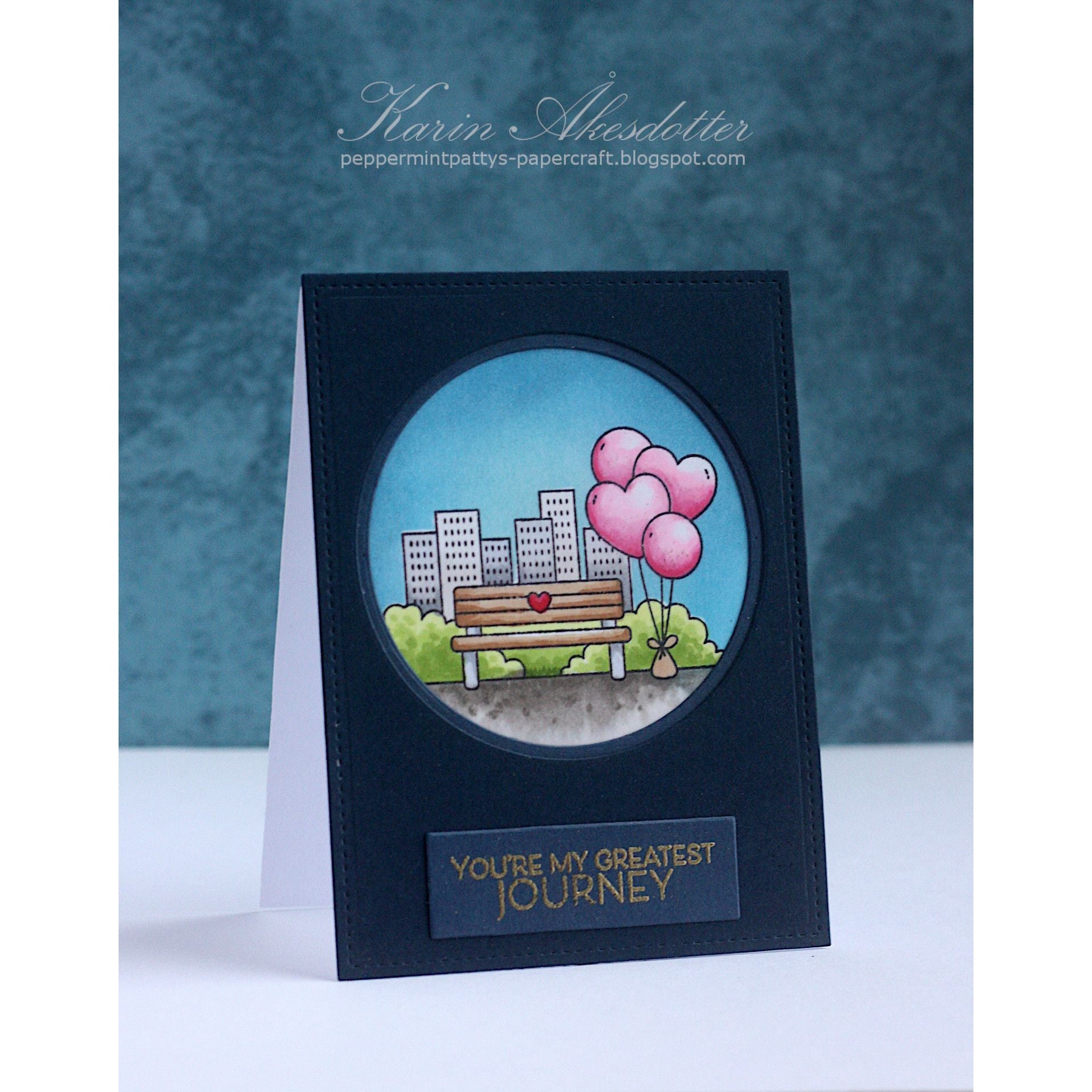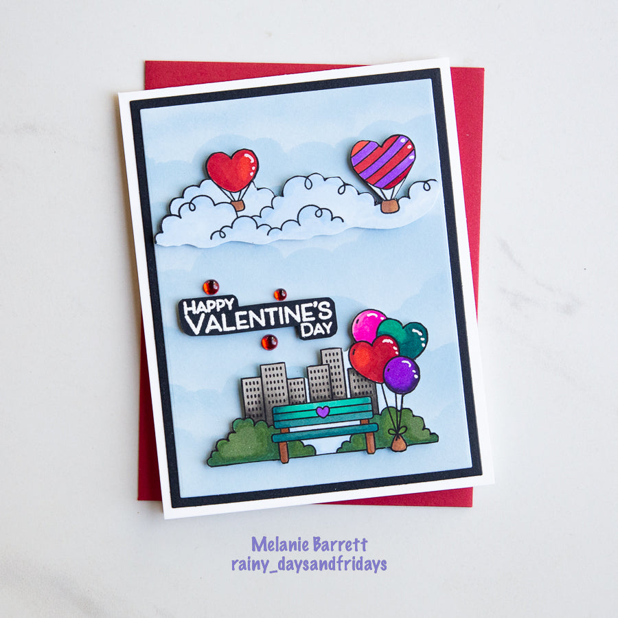 The Love Is in the Air stamps and dies from Simon Says Stamp features three charming scene images perfect for romantic cards and heartfelt projects: a dreamy sky filled with clouds and heart-shaped hot air balloons, a cozy park bench set against a city backdrop with a bunch of heart balloons, and a peaceful hillside tree with a heart carved into its trunk.