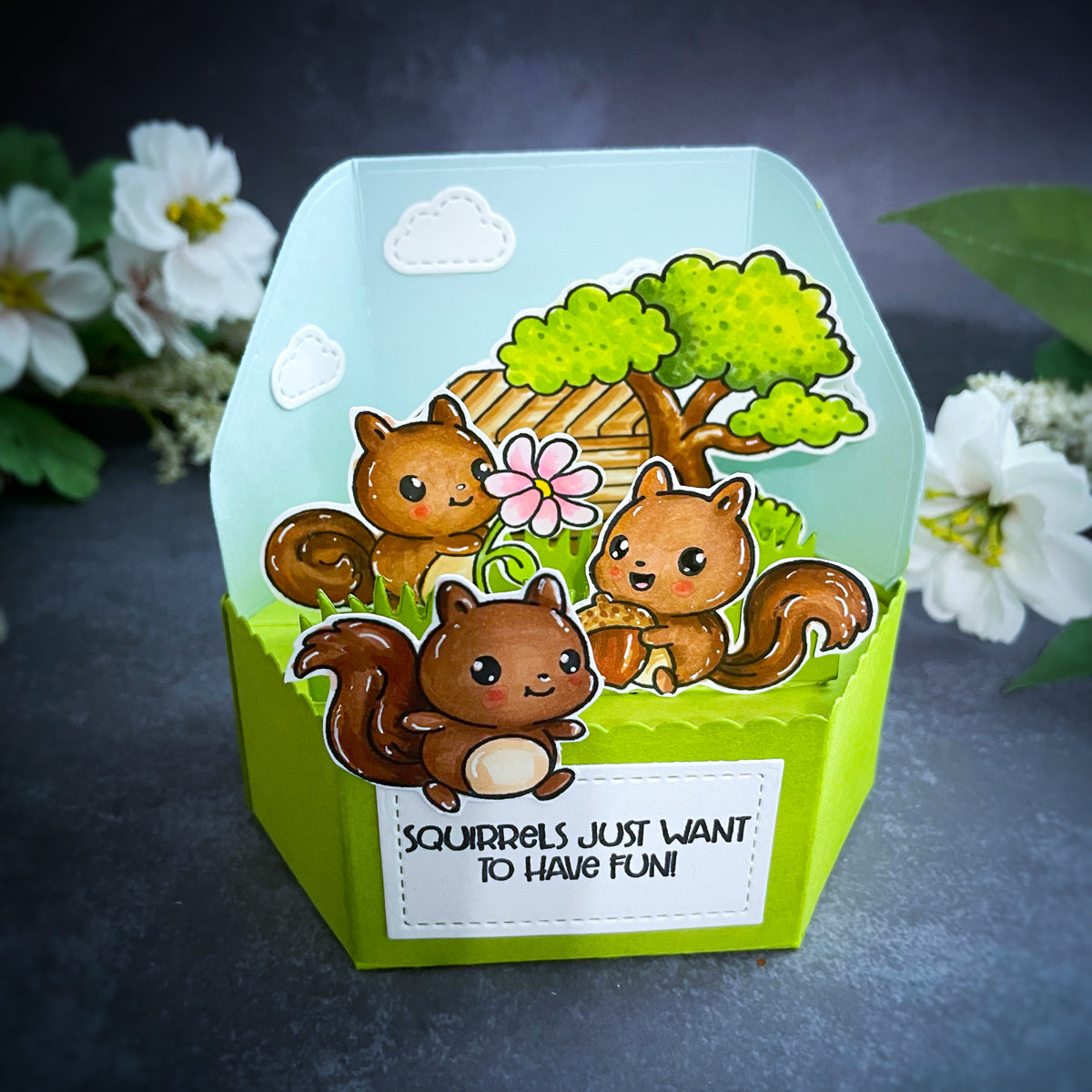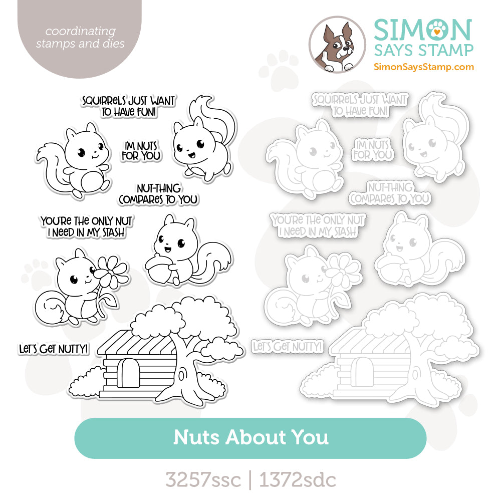 Add woodland whimsy to your projects with the Simon Says Stamp Nuts About You stamp and die set. This charming collection features stylized, adorable squirrels along with a cozy cabin nestled beside a tall tree, perfect for building nature-inspired scenes.