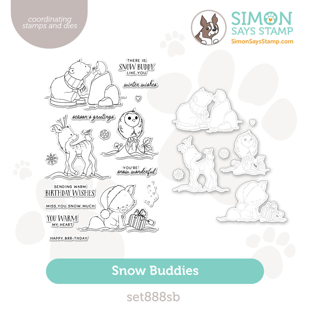 The Simon Says Stamp Snow Buddies stamp and die set brings cozy winter charm to your crafting with its storybook-style illustrations of woodland creatures in heartwarming scenes. This set features a bear on an ice floe receiving a gift from a penguin, a snowy owl perched gracefully, a deer with a tiny bird resting on its tail, and a fox in a stocking cap beside a present.