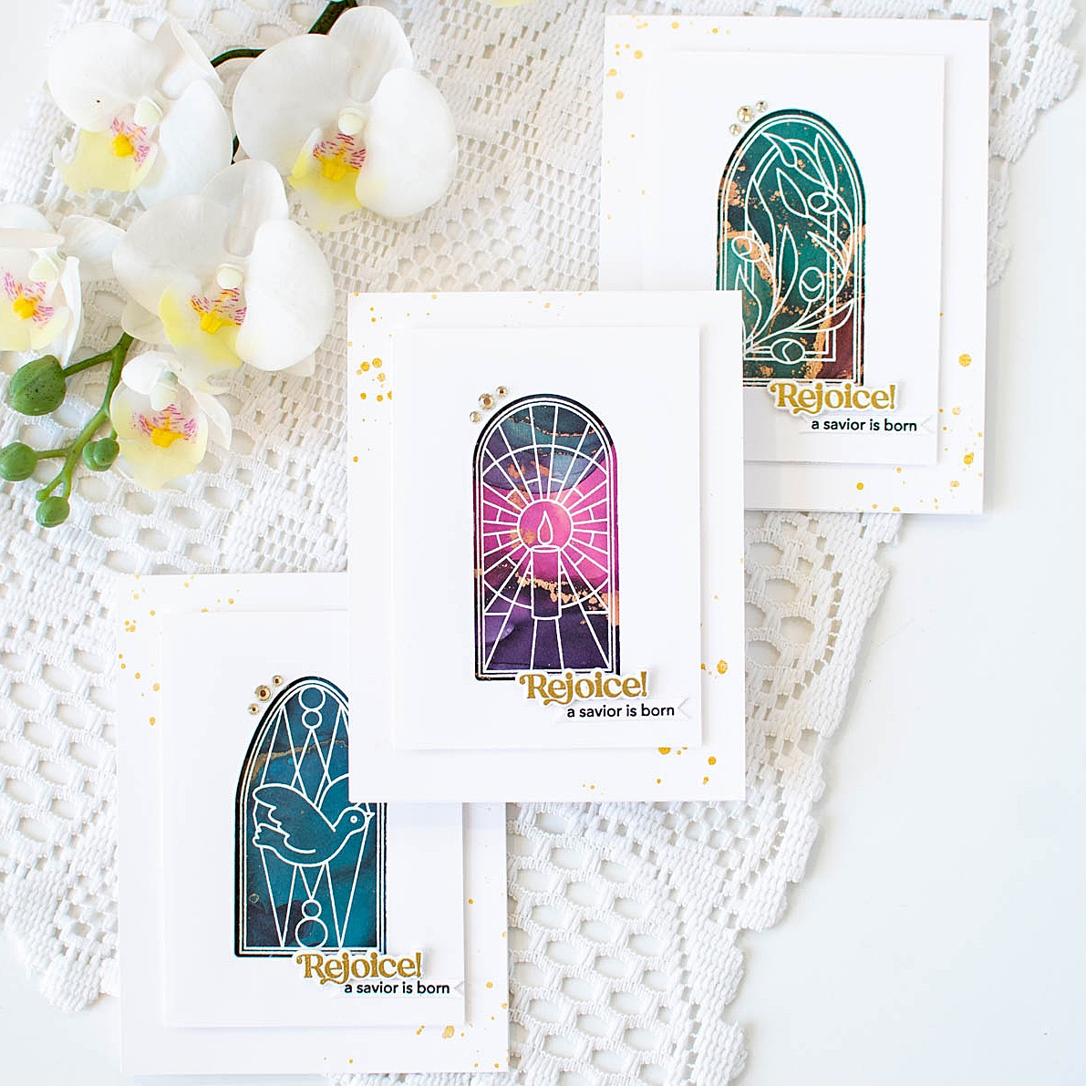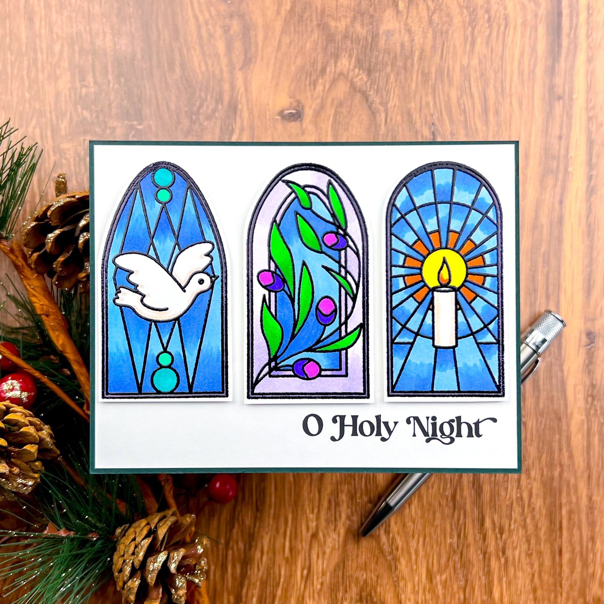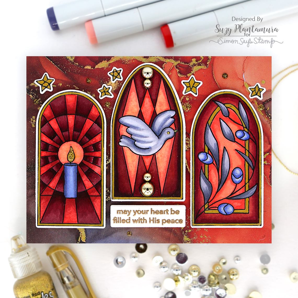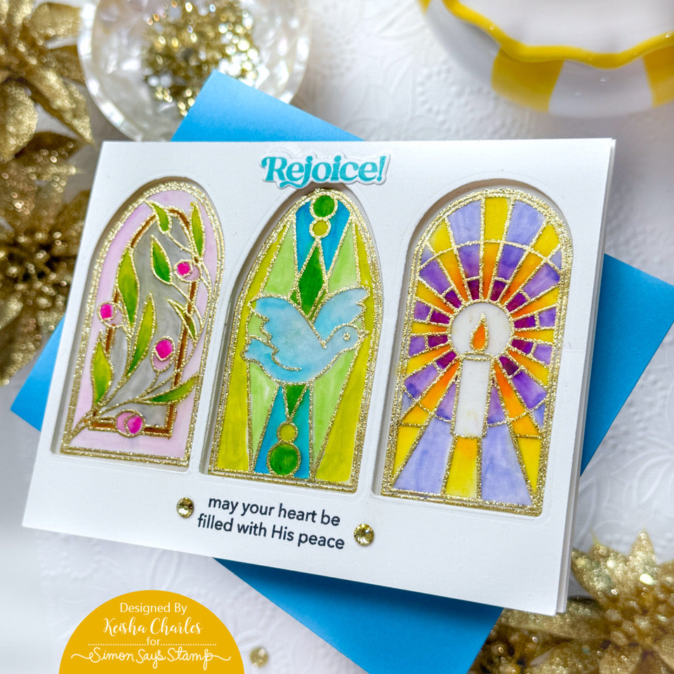 The Simon Says Stamp Stained Glass Christmas stamp and die set features intricate images of angels with beautiful stained glass wings and three arched church windows showcasing a lit candle, greenery, and a peaceful dove.