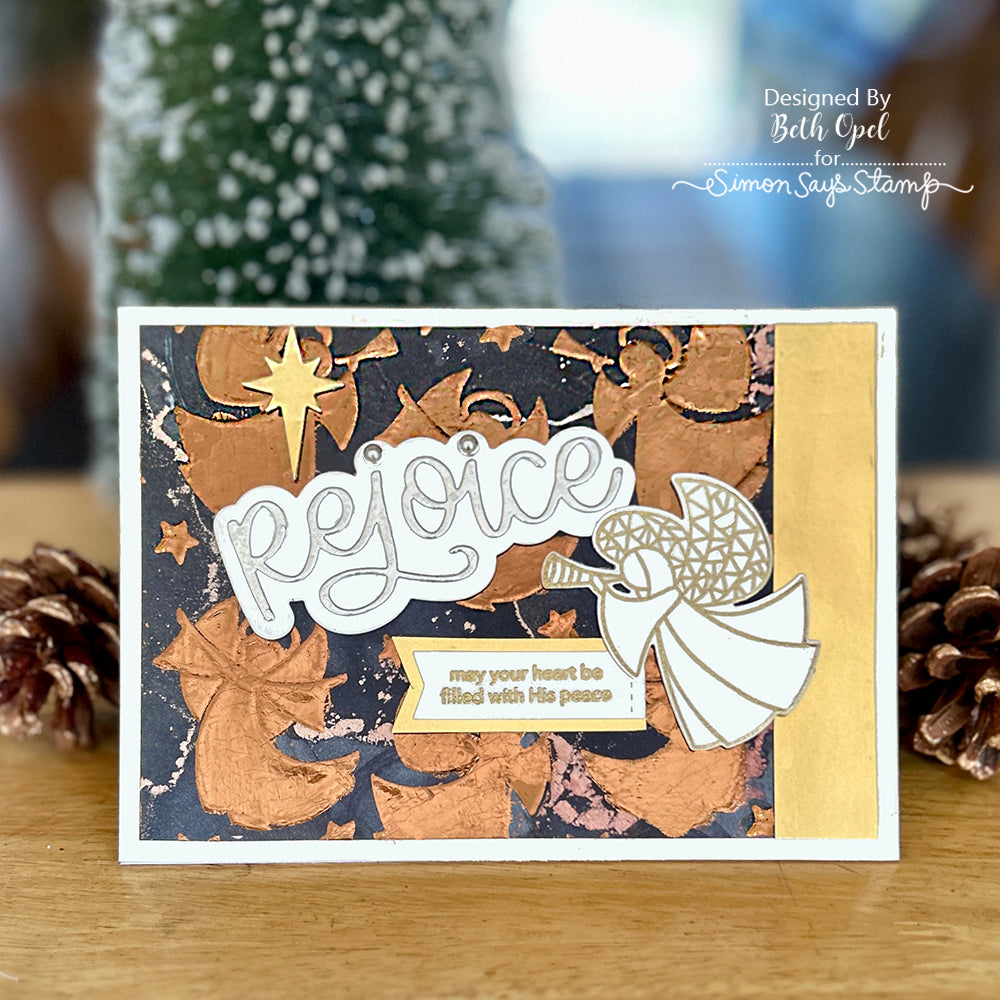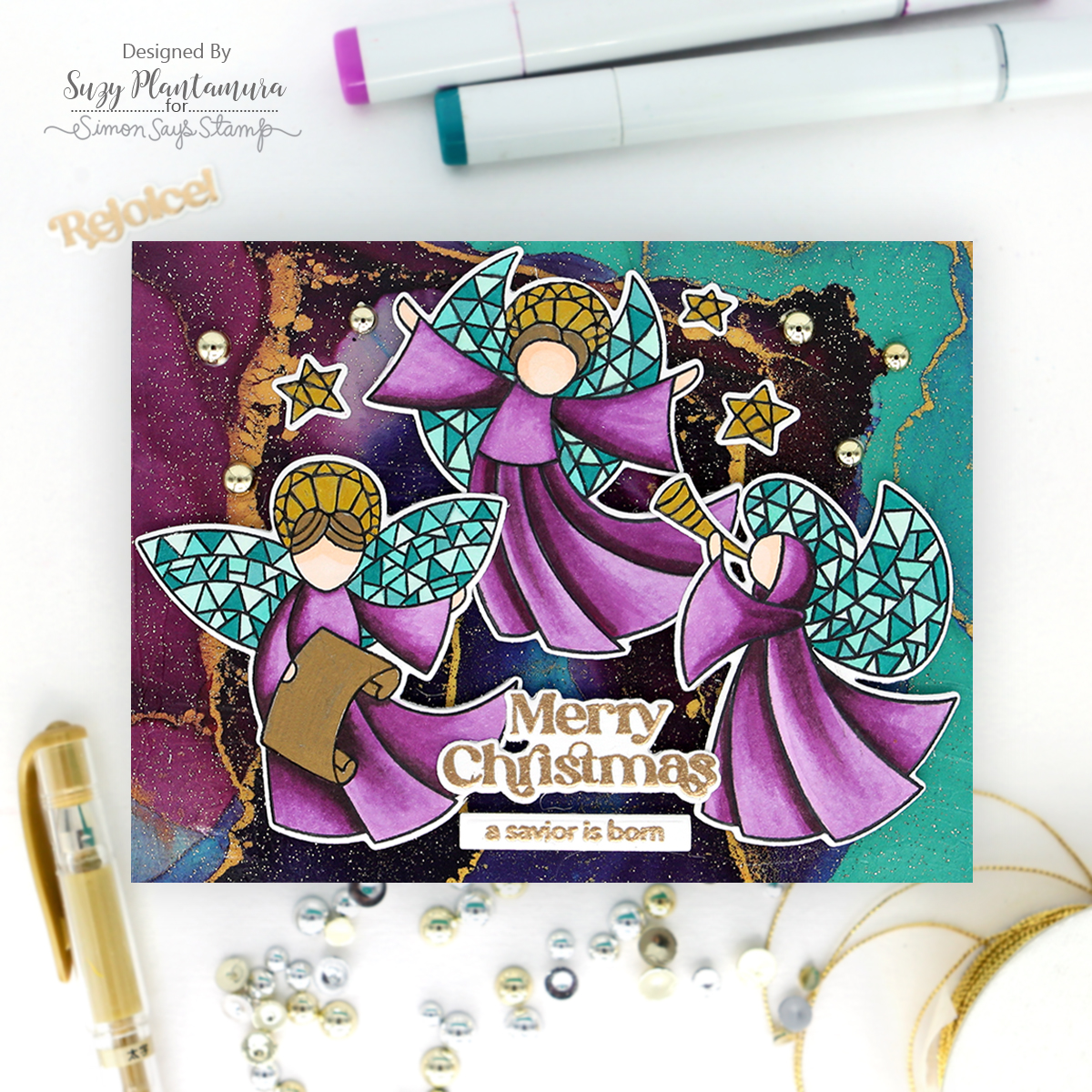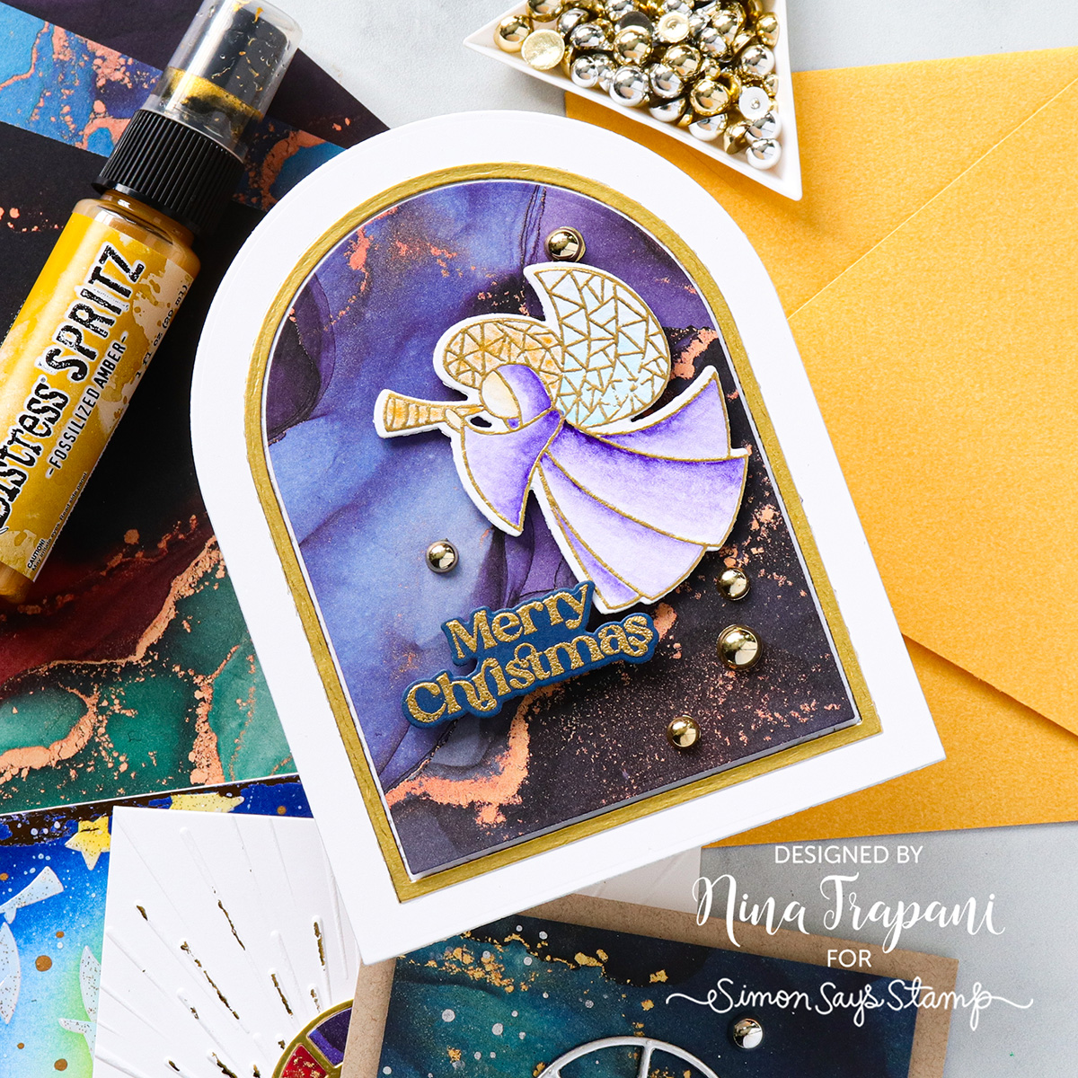 The Simon Says Stamp Stained Glass Christmas stamp and die set features intricate images of angels with beautiful stained glass wings and three arched church windows showcasing a lit candle, greenery, and a peaceful dove.