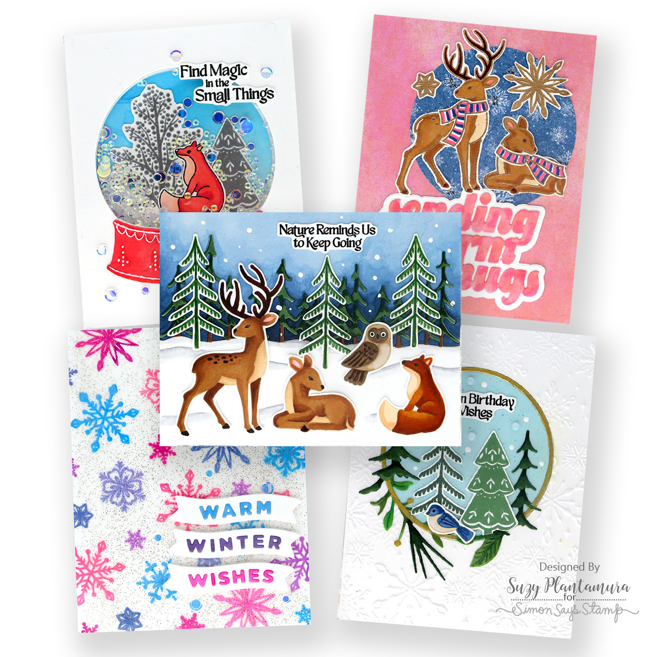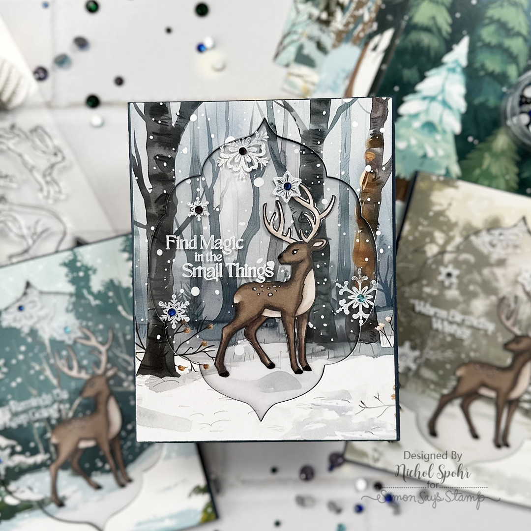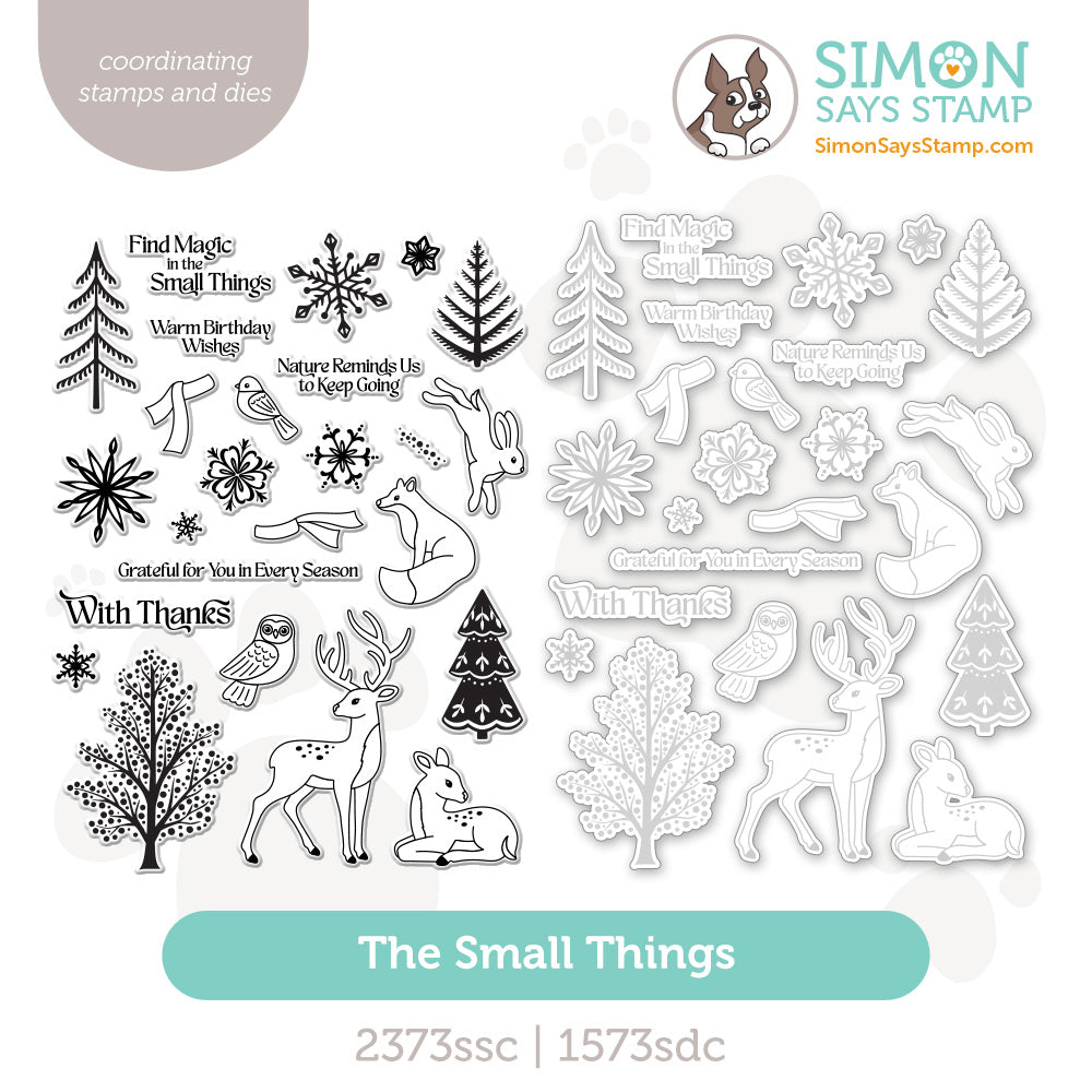Simon Says Stamp The Small Things stamp and die set is a charming woodland collection perfect for building sweet, storybook scenes. This set combines solid images of trees and snowflakes with delicate outline images of woodland animals, including a deer, owl, rabbit, fox, and songbird. Add personality and seasonal charm with the included scarves, letting you customize each critter for winter cards, cozy scenes, or playful accents.