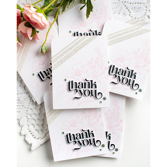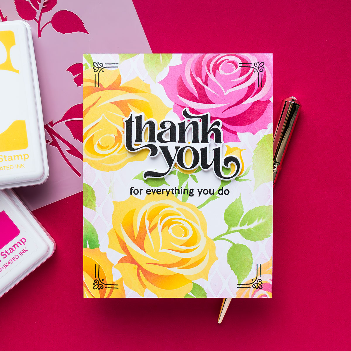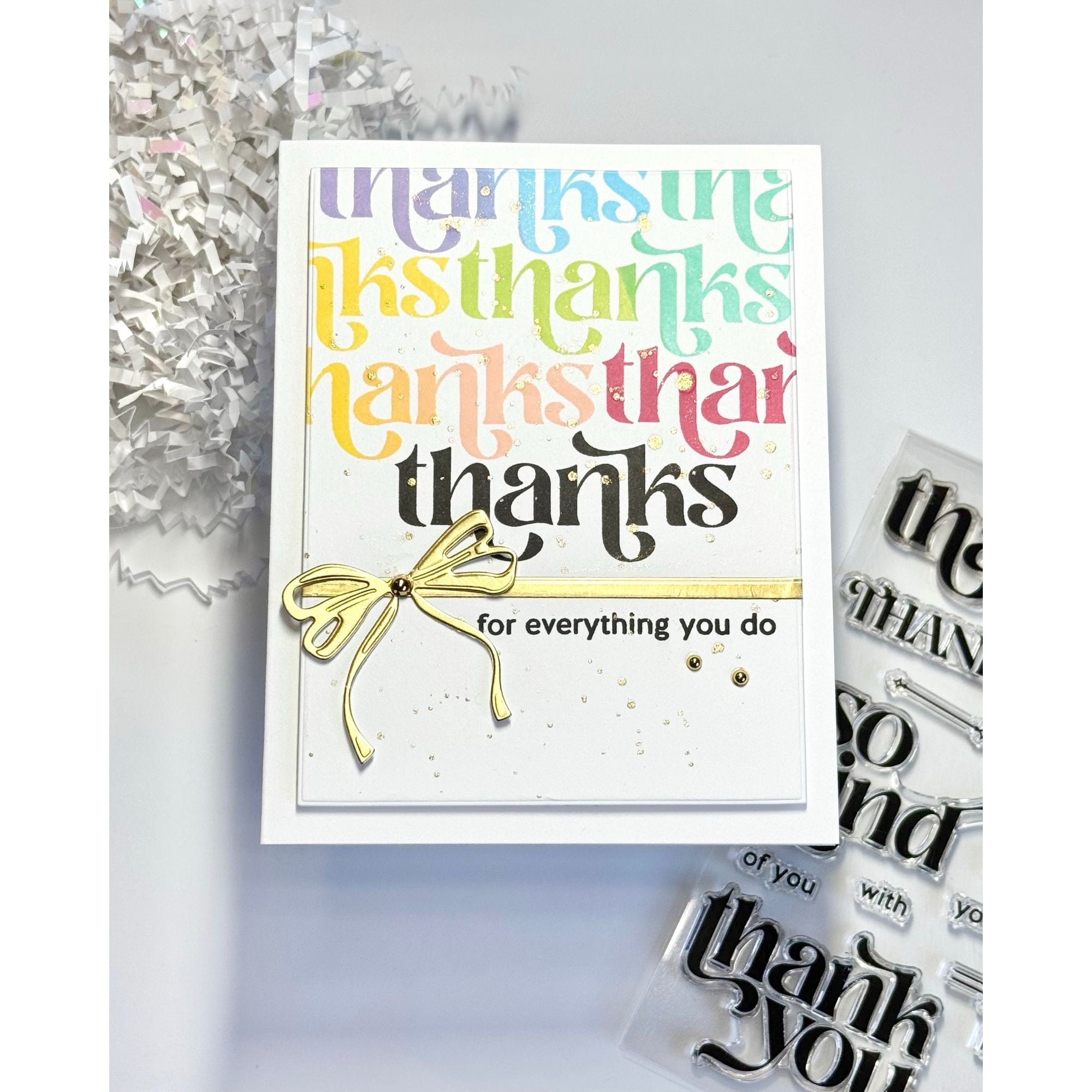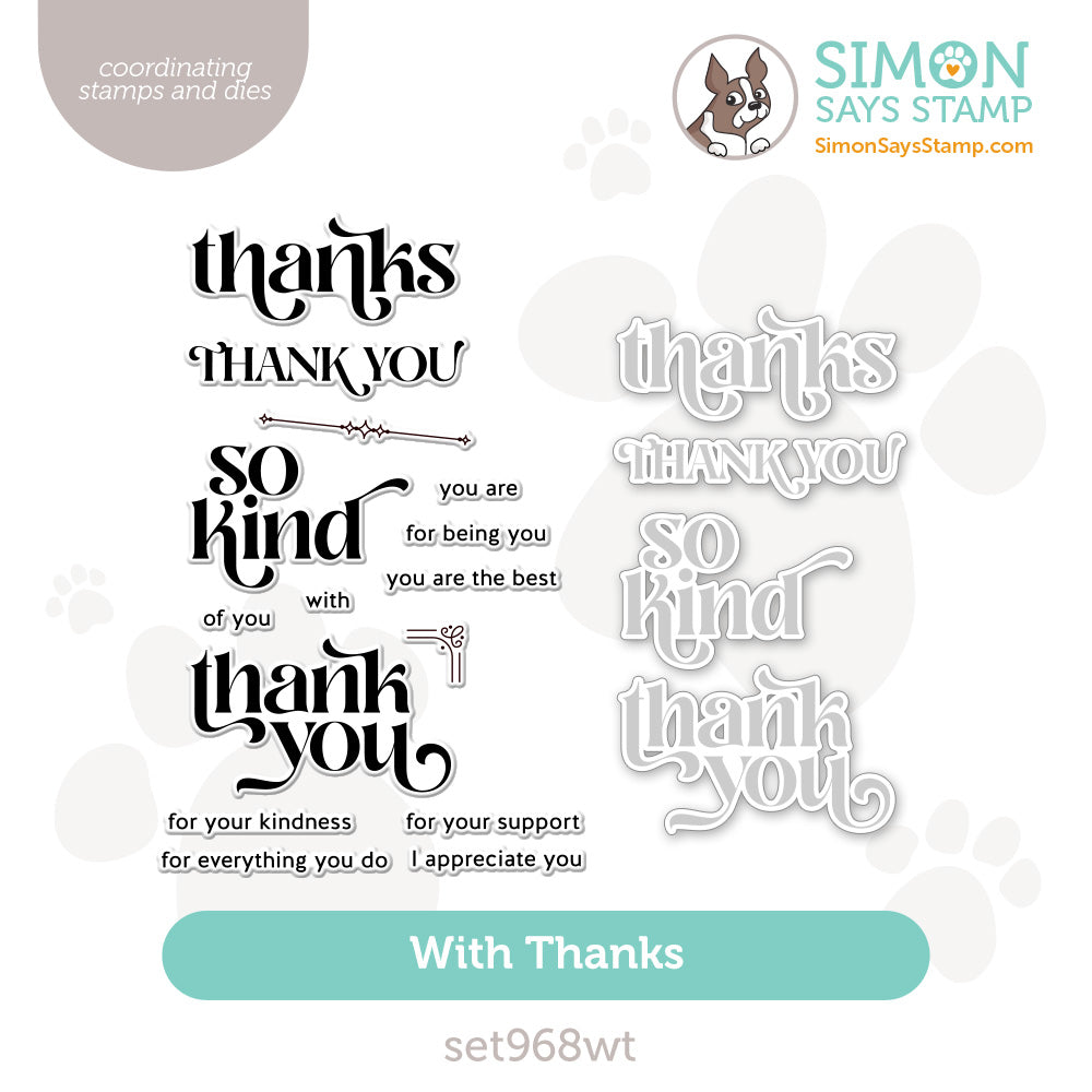 The Simon Says Stamp With Thanks stamp and die set is a stylish sentiment set featuring four large greetings in a fancy, flourishy font that adds elegance to any project.