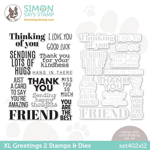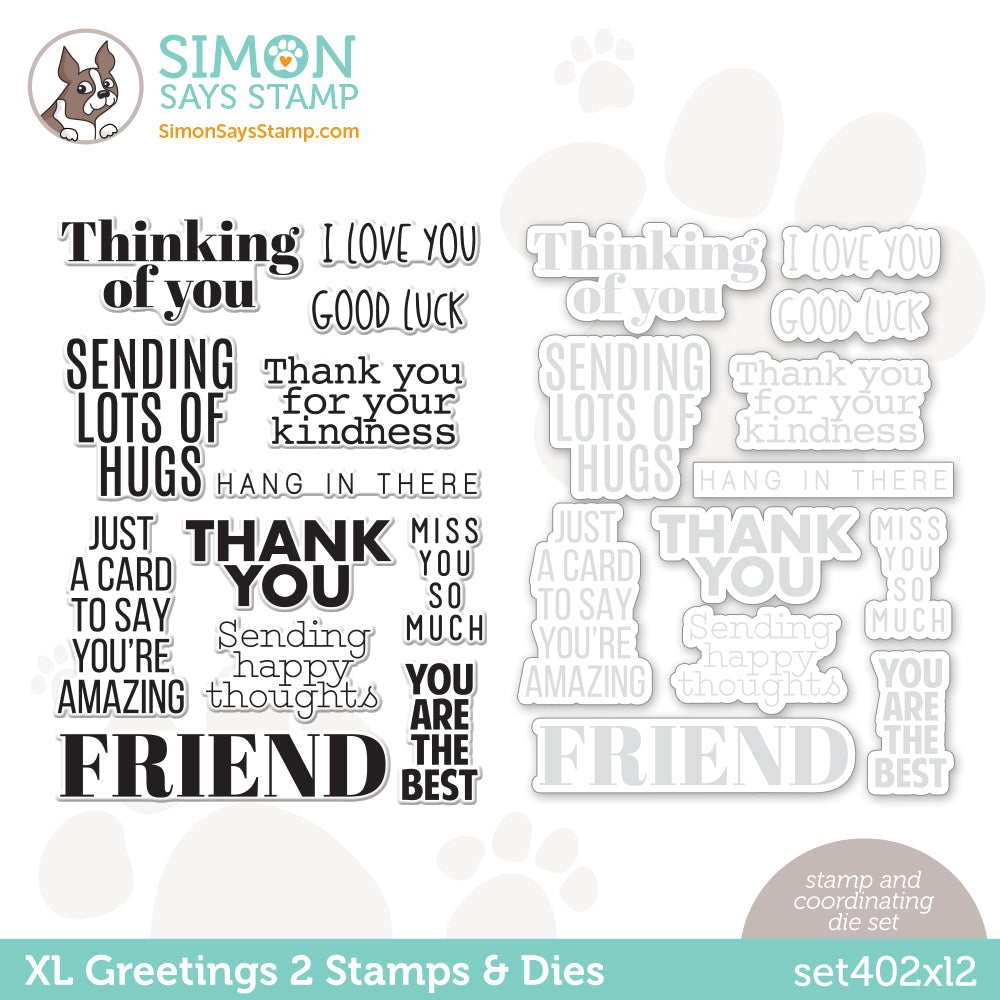 Simon Says Stamp dies are usable in nearly every machine on the market. Use wafer dies on cardstock, felt, fabric, even shrink plastic! You can use wafer thin dies to cut, stencil, emboss and create! Simon Says Stamp clear stamps are high quality photopolymer and made in the USA. This stamp and die set includes the 6 x 8 inch stamp set XL Greetings 2 (sss202284c) and the XL Greetings 2 coordinating wafer die set (sssd112333c).