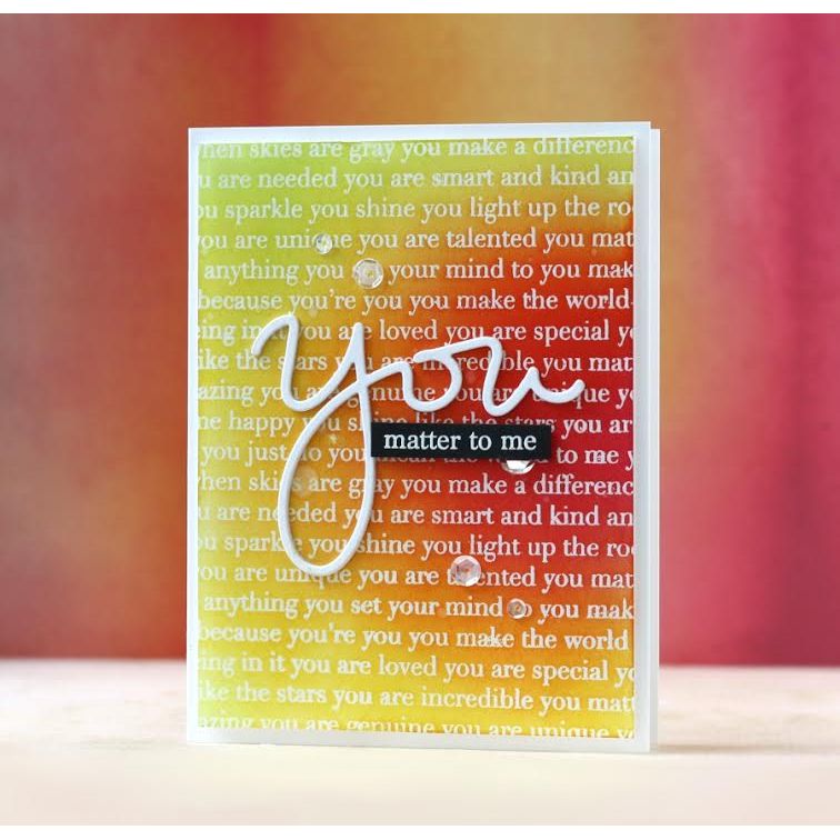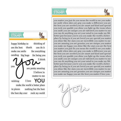 Simon Says Stamp dies are usable in nearly every machine on the market. Use wafer dies on cardstock, felt, fabric, even shrink plastic! You can use wafer thin dies to cut, stencil, emboss and create! Simon Says Stamp clear stamps are high quality photopolymer and made in the USA. This stamp and die set includes the 4 x 6 inch You Matter stamp set (sss101645), You wafer die (sssd111623) and the You Matter 6 x 6 inch, cling background stamp (sss101646).